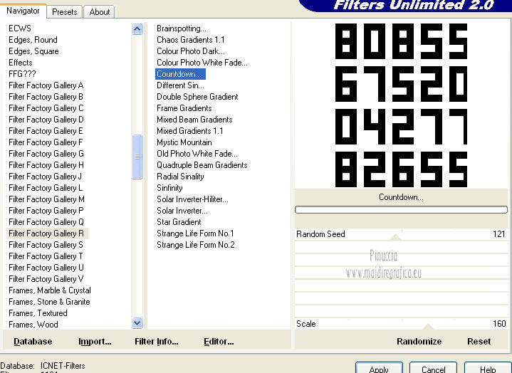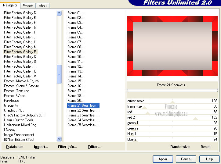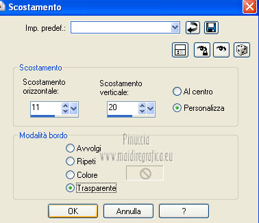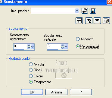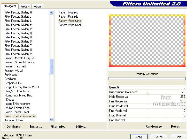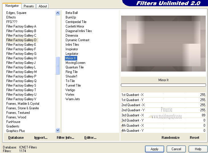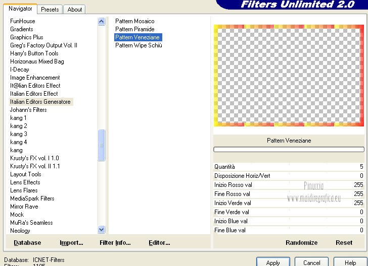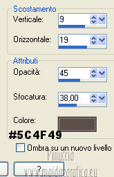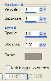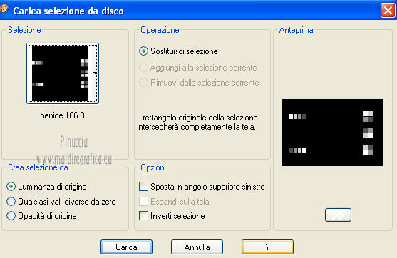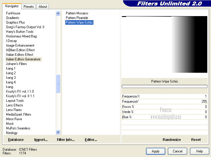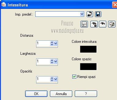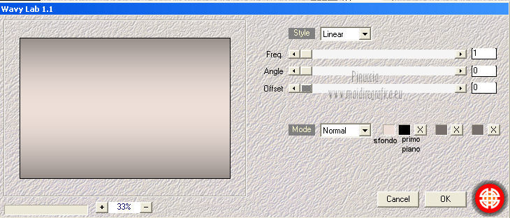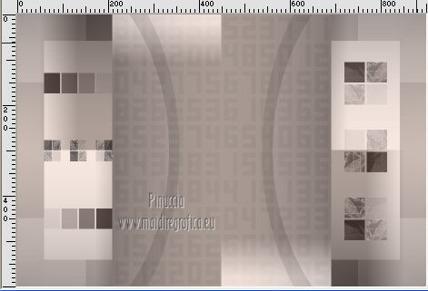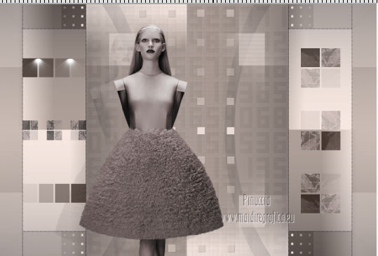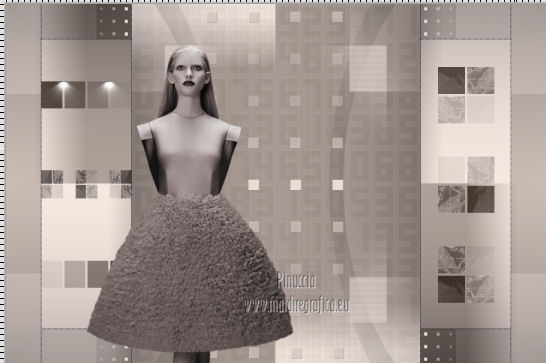 qui puoi trovare qualche risposta ai tuoi dubbi. Se l'argomento che ti interessa non è presente, ti prego di segnalarmelo. Occorrente: Materiale qui Il tube della donna è di Benice e non può essere usato per altri tutorial. Filtri: consulta, se necessario, la mia sezione filtri qui Filters Unlimited 2.0 qui Filter Factory Gallery D qui Filter Factory Gallery R qui Filter Factory Gallery P qui Italian Editors Generatore qui Mehdi - Wavy Lab 1.1. qui Transparency - Eliminate White qui I filtri Factory Gallery per essere usati devono prima essere convertiti. Come fare vedi qui Si usano importandoli in Filters Unlimited (come fare vedi qui) ma possono funzionare anche da soli. Le factory fornite sono state già convertite. Anche i filtri Italian Editors si possono usare importati in Unlimited o da soli. ![]() Metti le selezioni nella cartella Selezioni. Imposta il colore di primo piano con #000000, e il colore di sfondo con #eddfd8. ![]() 1. Apri una nuova immagine trasparente 900 x 600 pixels. Effetti>Plugins>Mehdi - Wavy Lab 1.1. ![]() 2. Livelli>Duplica. Effetti>Plugins>Filters Unlimited 2.0 - Filter Factory Gallery P - Frame 21 Seamless. ![]() Cambia la modalità di miscelatura di questo livello in Luminanza (esistente), e abbassa l'opacità al 40%. Livelli>Unisci>Unisci giù. 3. Livelli>Duplica. Effetti>Plugins>Filters Unlimited 2.0 - Italian Editors Generatore - Pattern Wipe Schiù. ![]() Immagine>Ridimensiona - 100% x 110%, tutti i livelli e mantieni proporzioni non selezionato. ![]() Effetti>Effetti di immagine>Scostamento. ![]() Cambia la modalità di miscelatura di questo livello in Luminanza (esistente) e abbassa l'opacità al 28%. 4. Questo passaggio è obbligatorio. Attiva lo strumento Ritaglio ![]() Clicca sul'icona unito opaco e poi sul segno di spunta a sinistra. ![]() 5. Livelli>Unisci>Unisci giù. Dovresti avere questo. ![]() 6. Livelli>Duplica. Effetti>Plugins>Filters Unlimited 2.0 - Filter Factory Gallery D - Mirror it. ![]() 7. Livelli>Duplica. Immagine>Ruota per gradi - 90 gradi a destra. ![]() Selezione>Carica/Salva selezione>Carica selezione da disco. Cerca e carica la selezione Benice 166.1. ![]() Premi sulla tastiera il tasto CANC. Selezione>Deseleziona. 8. Obbligatorio. Attiva lo strumento Ritaglio ![]() Clicca sul'icona unito opaco e poi sul segno di spunta a sinistra. ![]() 9. Livelli>Duplica. Chiudi questo livello e attiva il livello sottostante Copia(2) di Raster 1. Livelli>Unisci>Unisci visibile. Immagine>Capovolgi. 10. Apri e attiva il livello superiore. Selezione>Seleziona tutto. Selezione>Mobile. Selezione>Immobilizza. Effetti>Plugins>Filters Unlimited 2.0 - Filter Factory Gallery R - Countdown. ![]() Effetti>Plugins>Transparency - Eliminate White. Selezione>Deseleziona. 11. Sullo stesso livello. Selezione>Carica/Salva selezione>Carica selezione da disco. Cerca e carica la selezione Benice 166.2. ![]() Premi sulla tastiera il tasto CANC. Selezione>Deseleziona. Effetti>Effetti di immagine>Scostamento. ![]() Cambia la modalità di miscelatura di questo livello in Luce diffusa, e abbassa l'opacità al 10%. 12. Livelli>Unisci>Unisci giù. Dovresti avere questo. ![]() 13. Livelli>Nuovo livello raster. Selezione>Carica/Salva selezione>Carica selezione da disco. Cerca e carica la selezione Benice 166.3. ![]() Riempi la selezione con il colore di primo piano.Selezione>Deseleziona. Cambia la modalità di miscelatura di questo livello in Luminanza (esistente), e abbassa l'opacità al 65%. 14. Apri il tube Deco_1_Benice_L166 e vai a Modifica>Copia. Torna al tuo lavoro e vai a Modifica>Incolla come nuovo livello. Effetti>Effetti di immagine>Scostamento. ![]() Regola>Messa a fuoco>Metti a fuoco. Abbassa l'opacità di questo livello al 60%. 15. Apri il tube Deco_2_Benice_L166 e vai a Modifica>Copia. Torna al tuo lavoro e vai a Modifica>Incolla come nuovo livello. Effetti>Effetti di immagine>Scostamento. ![]() Regola>Messa a fuoco>Metti a fuoco. 16. Livelli>Nuovo livello raster. Selezione>Carica/Salva selezione>Carica selezione da disco. Cerca e carica la selezione Benice 166.4. ![]() Riempi la selezione con il colore di primo piano.Selezione>Deseleziona. Abbassa l'opacità di questo livello al 12%. 17. Livelli>Duplica. Immagine>Ridimensiona - 80% x 100%, tutti i livelli e mantieni proporzioni non selezionato. ![]() Effetti>Effetti di immagine>Scostamento. ![]() Immagine>Immagine negativa. se stai usando PSP 9: Regola>Bilanciamento colore>Immagine negativa Effetti>Effetti di trama>Intessitura. ![]() Cambia la modalità di miscelatura di questo livello in Indebolisci. 18. Dovresti avere questo. ![]() 19. Livelli>Nuovo livello raster. Selezione>Carica/Salva selezione>Carica selezione da disco. Cerca e carica la selezione Benice 166.5. ![]() Riempi la selezione con il colore di sfondo.Selezione>Deseleziona. Effetti>Effetti 3D>Sfalsa ombra, con il colore #9d908a. ![]() 20. Livelli>Nuovo livello raster. Selezione>Carica/Salva selezione>Carica selezione da disco. Cerca e carica la selezione Benice 166.6. ![]() Riempi la selezione con il colore di sfondo.Selezione>Deseleziona. 21. Apri il tube Deco_3_Benice_L166 e vai a Modifica>Copia. Torna al tuo lavoro e vai a Modifica>Incolla come nuovo livello. Posiziona il tube come nell'esempio.![]() 22. Livelli>Nuovo livello raster. Selezione>Carica/Salva selezione>Carica selezione da disco. Cerca e carica la selezione Benice 166.7. ![]() Ingrandisci molto l'immagine per poter vedere meglio lo spazio ristretto da riempire, e riempi la selezione con il colore di primo piano.Selezione>Deseleziona. 23. Apri il tube Deco_4_Benice_L166 e vai a Modifica>Copia. Torna al tuo lavoro e vai a Modifica>Incolla come nuovo livello. Lascialo come sta. E' già correttamente posizionato. Cambia la modalità di miscelatura di questo livello in Luminanza (esistente). 24. Apri il tube Benice_Woman_L166 e vai a Modifica>Copia. Torna al tuo lavoro e vai a Modifica>Incolla come nuovo livello. Posiziona il tube come nell'esempio.![]() Abbassa l'opacità di q