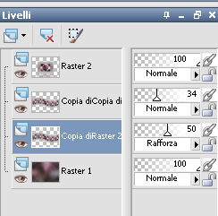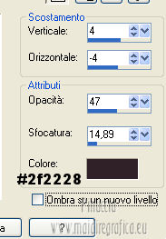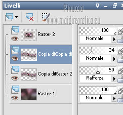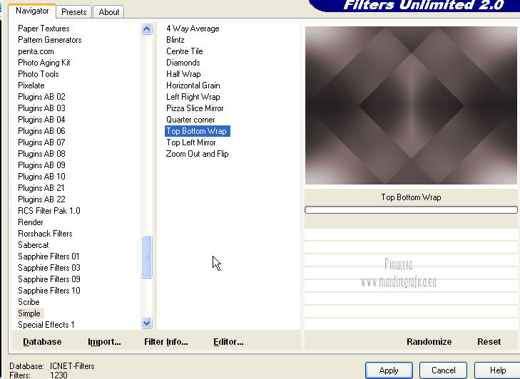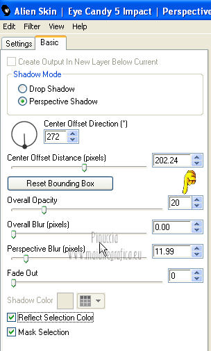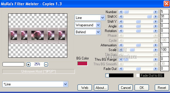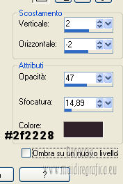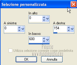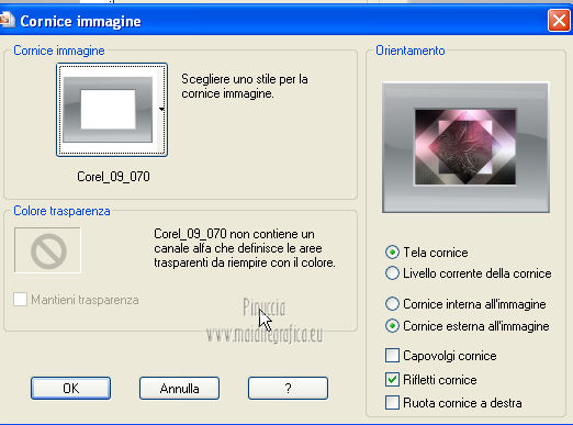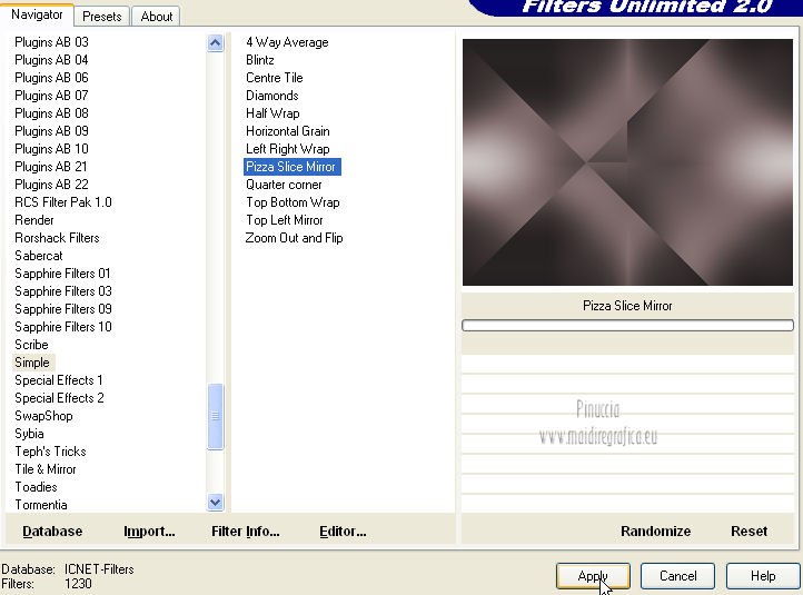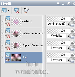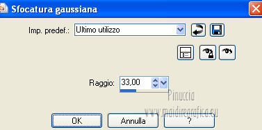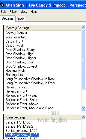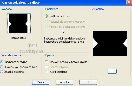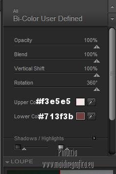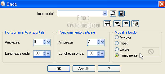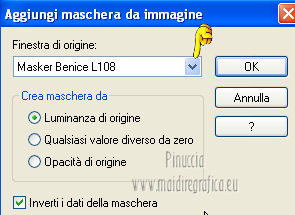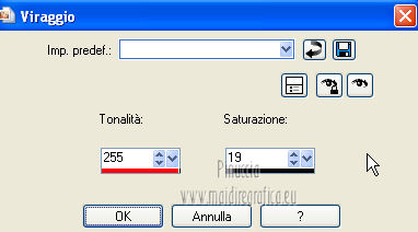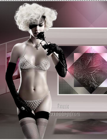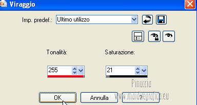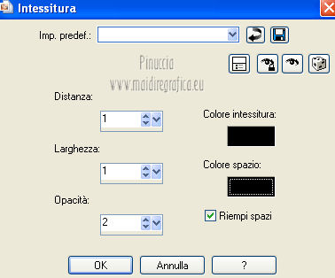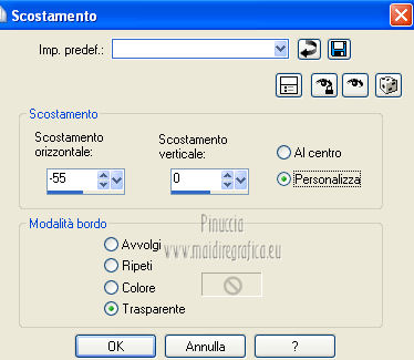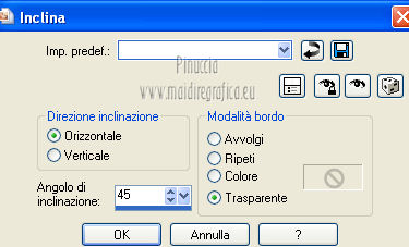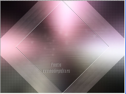qui puoi trovare qualche risposta ai tuoi dubbi. Se l'argomento che ti interessa non è presente, ti prego di segnalarmelo. Occorrente: Materiale qui Filtri: consulta, se necessario, la mia sezione filtri qui Alien Skin Eye Candy 5 Impact qui Mura's Meister - Copies qui Nik Software - Color Efex Pro 3.0 qui Filters Unlimited 2.0 qui Simple qui i filtri Simple si possono usare da soli o importati in Filters Unlimited ![]() Metti il preset nella cartella del filtro Alien Skin Eye Candy 5 Impact>Settings>Shadow. Cliccando sul file una o due volte (a seconda delle tue impostazioni), il preset automaticamente si installerà nella cartella corretta. La cornice-immagine Corel_09_070 è standard nelle versioni più recenti di PSP. Se non la trovi nel tuo PSP metti quella fornita nella cartella Cornici-immagine. Metti le selezioni nella cartella Selezioni. Apri la maschera in PSP e minimizzala con il resto del materiale. Imposta il colore di primo piano con #fee7ea. ![]() 1. Apri una nuova immagine trasparente 800 x 600 pixels. Selezione>Seleziona tutto. Apri l'immagine Achtergrond_Benice_L108 e vai a Modifica>Copia. Torna al tuo lavoro e vai a Modifica>Incolla nella selezione. Selezione>Deseleziona. 2. Regola>Sfocatura>Sfocatura radiale. ![]() Regola>Sfocatura>Sfocatura gaussiana - raggio 33. ![]() Effetti>Plugins>Nik Software - Color Efex Pro - Bi-Color User Defined. ![]() Regola>Sfocatura>Sfocatura gaussiana - con i settaggi precedenti. ![]() Immagine>Capovolgi. 3. Livelli>Nuovo livello raster. Selezione>Seleziona tutto. Apri il tube Blend-oben e vai a Modifica>Copia. Torna al tuo lavoro e vai a Modifica>Incolla nella selezione. Selezione>Deseleziona. Immagine>Capovolgi. Regola>Tonalità e saturazione>Viraggio. ![]() Cambia la modalità di miscelatura di questo livello in Sovrapponi, e abbassa l'opacità al 23%. 4. Livelli>Nuovo livello raster. Riempi il livello con il colore di primo piano.Livelli>Nuovo livello maschera>Da immagine. Apri il menu sotto la finestra di origine e vedrai la lista dei files aperti. Seleziona la maschera MaskerBeniceL108, con i seguenti settaggi: ![]() Livelli>Unisci>Unisci gruppo. 5. Attiva lo strumento Selezione ,clicca sull'icona Selezione personalizzata ![]() e imposta i seguenti settaggi: ![]() Selezione>Inverti. Premi sulla tastiera il tasto CANC. Selezione>Deseleziona. 6. Effetti>Effetti geometrici>Inclina. ![]() Effetti>Effetti di immagine>Scostamento. ![]() Livelli>Duplica. Immagine>Rifletti. Livelli>Unisci>Unisci giù. Livelli>Duplica. Immagine>Capovolgi. 7. Selezione>Carica/Salva selezione>Carica selezione da disco. Cerca e carica la selezione Benice 108.1. ![]() Premi sulla tastiera il tasto CANC. Selezione>Deseleziona. Attiva il livello sottostante. Selezione>Carica/Salva selezione>Carica selezione da disco. Cerca e carica la selezione Benice 108.2. ![]() Premi sulla tastiera il tasto CANC. Selezione>Deseleziona. Attiva nuovamente il livello superiore. Livelli>Unisci>Unisci giù. 8. Attiva lo strumento Bacchetta magica ![]() e clicca nei quattro angoli per selezionarli. ![]() Attiva il livello inferiore. Effetti>Effetti di trama>Intessitura. ![]() Selezione>Deseleziona. 9. Attiva nuovamente il livello superiore. Attiva ancora lo strumento Bacchetta magica ![]() e clicca nella parte trasparente al centro. ![]() Attiva il livello inferiore. Selezione>Innalza selezione a livello. Selezione>Deseleziona. Livelli>Disponi>Porta in alto. Livelli>Duplica. Immagine>Ruota per gradi - 45 gradi a destra. ![]() Livelli>Disponi>Sposta giù. Attiva il livello superiore. Cambia la modalità di miscelatura di questo livello in Moltiplica. 10. Selezione>Seleziona tutto. Selezione>Mobile. Selezione>Immobilizza. Livelli>Nuovo livello raster. Apri il tube D 101210, e vai a Modifica>Copia. Torna al tuo lavoro e vai a Modifica>Incolla nella selezione. Selezione>Deseleziona. Cambia la modalità di miscelatura di questo livello in Luminanza (esistente). 11. Chiudi i tre livelli superiori e attiva uno dei livelli visibili. Livelli>Unisci>Unisci visibile. Questa dovrebbe essere la tua paletta dei livelli. ![]() Modifica>Copia. Modifica>Incolla come nuova immagine. Metti da parte questa immagine, copia del livello Uniti, che userai più tardi. 12. Torna al tuo lavoro. Livelli>Visualizza>Tutto. Livelli>Unisci>Unisci tutto. Immagine>Aggiungi bordatura, 2 pixels, simmetriche, con il colore #1b1818. Immagine>Cornice-immagine. Seleziona la cornice-immagine Corel_09_70, con i seguenti settaggi. ![]() Regola>Tonalità e saturazione>Viraggio. ![]() Livelli>Unisci>Unisci tutto. Immagine>Ridimensiona, al 35%, tutti i livelli selezionato. Regola>Messa a fuoco>Metti a fuoco. Minimizza l'immagine per il momento. 12. Attiva l'immagine che hai minimizzato al punto 11. Questa sarà la nuova base del tuo lavoro. Livelli>Duplica. Cambia la modalità di miscelatura di questo livello in Moltiplica, Abbassa l'opacità di questo livello al 63%. Livelli>Unisci>Unisci giù. Regola>Sfocatura>Sfocatura gaussiana - raggio 33. ![]() 13. Livelli>Duplica. Regola>Tonalità e saturazione>Viraggio. ![]() Effetti>Plugins>Filters Unlimited 2.0 - Simple - Pizza Slice Mirror. ![]() Livelli>Duplica. Immagine>Rifletti. Abbassa l'opacità di questo livello al 50%. Livelli>Unisci>Unisci giù. 14. Effetti>Plugins>Filters Unlimited 2.0 - Simple - Top Bottom Wrap. ![]() Abbassa l'opacità di questo livello al 44%. Effetti>Effetti di trama>Intessitura. ![]() Livelli>Unisci>Unisci giù. 15. Attiva l'immagine originale che hai minimizzato al punto 12. ![]() Modifica>Copia. Torna al tuo lavoro e vai a Modifica>Incolla come nuovo livello. Lascia la cornice come sta. ![]() 16. Livelli>Duplica. Immagine>Ridimensiona, al 60%, tutti i livelli non selezionato. Effetti>Plugins>Mura's Meister - Copies. ![]() Effetti>Effetti di distorsione>Onda. ![]() Livelli>Disponi>Sposta giù. Cambia la modalità di miscelatura di questo livello in Rafforza, e abbassa l'opacità al 50%. Livelli>Duplica. Riporta la modalità di miscelatura a Normale, e
