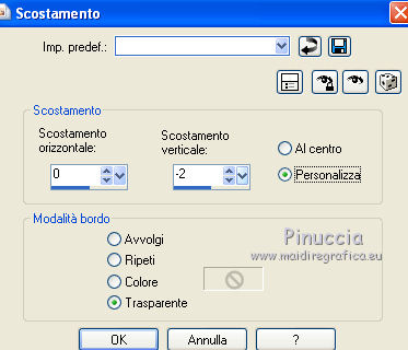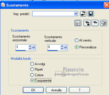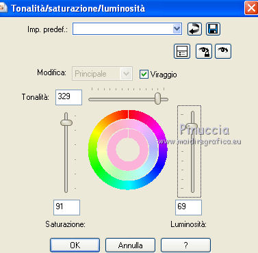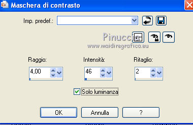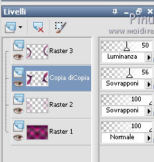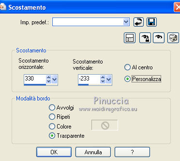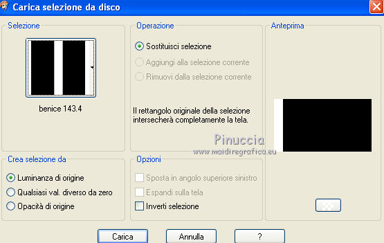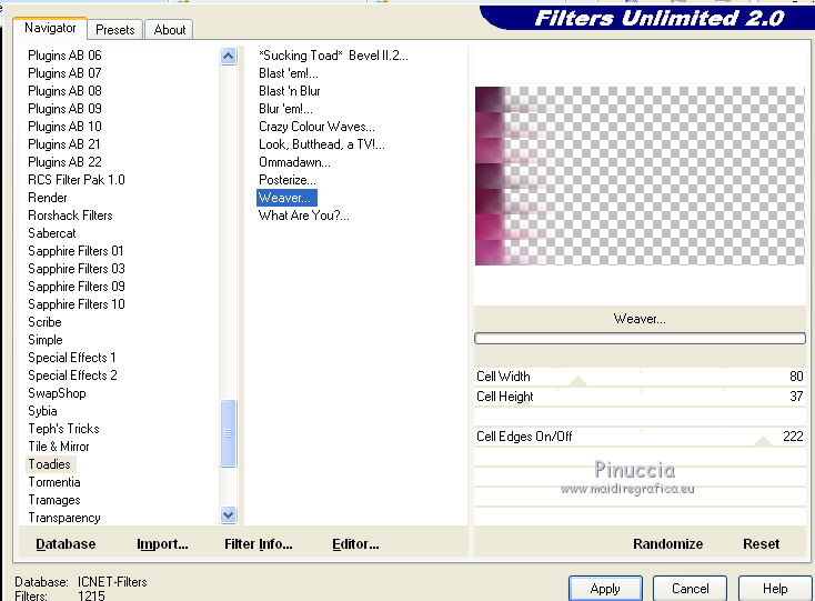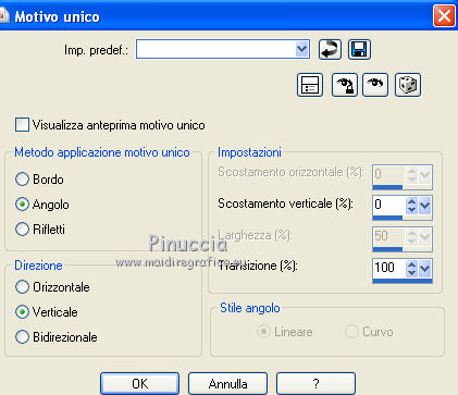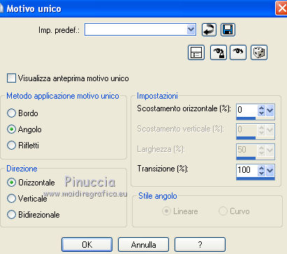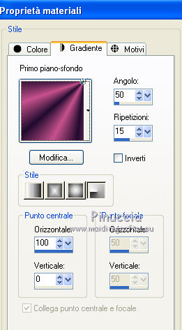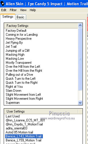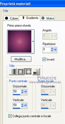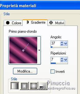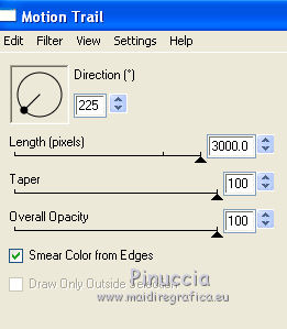 qui puoi trovare qualche risposta ai tuoi dubbi. Se l'argomento che ti interessa non è presente, ti prego di segnalarmelo. Occorrente: Materiale qui Il tube della donna è di Gerry I tubes dei gatti sono di JHanna Filtri: consulta, se necessario, la mia sezione filtri qui Filters Unlimited 2.0 qui AP Lines - Lines SilverLining qui Mura's Meister - Perspective Tiling qui Toadies qui Eye Candy 4000 - Motion Trail qui Alien Skin Eye Candy 5 Impact - Motion Trail qui i filtri Toadies si possono usare da soli o importati in Filters Unlimited ![]() Metti il preset Benice_L143_Motion Trail nella cartella del filtro Alien Skin Eye Candy 5 Impact>Settings>Motion Trail. Cliccando sul file, automaticamente il preset si installerà nella cartella corretta. Il gradiente Corel_06_026 è standard nelle versioni più recenti di PSP, e corrisponde al gradiente standard Gradiente di primo piano sfumato delle versioni precedenti. Se non lo trovi nel tuo PSP, metti quello fornito nella cartella Gradienti. Metti le selezioni nella cartella Selezioni. Imposta il colore di primo piano con #210c2f, e il colore di sfondo con #c7518c. ![]() Passa il colore di primo piano a Gradiente, stile Sprazzo di luce. ![]() 1. Apri una nuova immagine trasparente 900 x 600 pixels, e riempila con il gradiente.2. Cambia i settaggi del Gradiente in stile Radiale. ![]() Livelli>Nuovo livello raster. Riempi il livello con il gradiente.Regola>Sfocatura>Sfocatura gaussiana - raggio 15. ![]() Livelli>Duplica. Immagine>Rifletti. Abbassa l'opacità di questo livello al 50%. Livelli>Unisci>Unisci giù. Cambia la modalità di miscelatura di questo livello in Luminanza. Livelli>Unisci>Unisci giù. Effetti>Effetti di immagine>Motivo unico. ![]() 3. Livelli>Nuovo livello raster. Selezione>Seleziona tutto. Apri l'immagine Psp149E e vai a Modifica>Copia. Torna al tuo lavoro e vai a Modifica>Incolla nella selezione. Selezione>Deseleziona. 4. Selezione>Carica/Salva selezione>Carica selezione da disco. Cerca e carica la selezione Benice 143.1. ![]() Premi sulla tastiera il tasto CANC. Selezione>Deseleziona. Effetti>Effetti di immagine>Scostamento. ![]() Livelli>Duplica. Immagine>Rifletti. Immagine>Capovolgi. Livelli>Unisci>Unisci giù. Effetti>Effetti di immagine>Motivo unico. ![]() Cambia la modalità di miscelatura di questo livello in Saturazione. Livelli>Unisci>Unisci giù. 5. Cambia nuovamente i settaggi del Gradiente in stile Lineare. ![]() Livelli>Nuovo livello raster. Selezione>Carica/Salva selezione>Carica selezione da disco. Cerca e carica la selezione Benice 143.2 ![]() Ingrandisci l'immagine per visualizzare meglio lo spazio selezionato, e riempi la selezione con il gradiente.Selezione>Deseleziona. Regola>Messa a fuoco>Metti a fuoco. Cambia la modalità di miscelatura di questo livello in Sovrapponi. 6. Cambia ancora i settaggi del gradiente. ![]() Livelli>Nuovo livello raster. Selezione>Carica/Salva selezione>Carica selezione da disco. Cerca e carica la selezione Benice 143.3. ![]() Riempi la selezione con il gradiente.Selezione>Deseleziona. Livelli>Duplica - 2 volte. 7. Chiudi il livello superiore, e attiva il livello sottostante della prima copia. Immagine>Rifletti. Immagine>Capovolgi. Livelli>Unisci>Unisci giù. Cambia la modalità di miscelatura di questo livello in Luminanza, e abbassa l'opacità al 50%. 8. Apri e attiva il livello superiore. ![]() Effetti>Plugins> Eye Candy 4000 - Motion Trail. ![]() Livelli>Duplica. Immagine>Rifletti. Immagine>Capovolgi. Livelli>Unisci>Unisci giù. Cambia la modalità di miscelatura di questo livello in Sovrapponi, e abbassa l'opacità al 56%. Livelli>Disponi>Sposta giù. Questa dovrebbe essere la tua paletta dei livelli. ![]() 9. Attiva nuovamente il livello superiore. Apri il tube Benice_L143_Overlay e vai a Modifica>Copia. Torna al tuo lavoro e vai a Modifica>Incolla come nuovo livello. Il tube è già correttamente posizionato. Lascialo come sta. Cambia la modalità di miscelatura di questo livello in Luce netta. 10. Livelli>Unisci>Unisci visibile. Dovresti avere questo: ![]() Finestra>Duplica (o, sulla tastiera maiuscola+D) per fare una copia. Minimizza la copia che ti servirà più tardi. Torna al tuo lavoro originale. 11. Riporta il colore di primo piano al colore iniziale #210c2f. ![]() Livelli>Nuovo livello raster. Attiva lo strumento Selezione ,clicca sull'icona Selezione personalizzata ![]() e imposta i seguenti settaggi: ![]() Ingrandisci l'immagine. Riempi la selezione con il colore di primo piano.Selezione>Deseleziona. Effetti>Plugins>Alien Skin Eye Candy 5 Impact - Motion Trail. Seleziona il preset Benice_L143_Motion Trail e ok. ![]() Effetti>Effetti di immagine>Scostamento. ![]() Effetti>Plugins> AP Lines - Silverlining. ![]() 12. Livelli>Unisci>Unisci giù. Immagine>Aggiungi bordatura, simmetriche non selezionato, con il colore nero. ![]() Attiva lo strumento Bacchetta magica ![]() ![]() clicca sui bordi neri per selezionarli. ![]() 13. Livelli>Nuovo livello raster. Attiva il duplicato che hai minimizzato al punto 10 e vai a Modifica>Copia. Torna al tuo lavoro e vai a Modifica>Incolla nella selezione. Regola>Sfocatura>Sfocatura gaussiana - raggio 15. ![]() Selezione>Deseleziona. 14. Selezione>Carica/Salva selezione>Carica selezione da disco. Cerca e carica la selezione Benice 143.4. ![]() Selezione>Innalza selezione a livello. Selezione>Deseleziona. Effetti>Plugins>Filters Unlimited 2.0 - Toadies - Weaver. ![]() Effetti>Effetti di bordo>Aumenta. Livelli>Duplica. Immagine>Rifletti. Livelli>Unisci>Unisci giù. Cambia la modalità di miscelatura di questo livello in Sovrapponi. 15. Passa il colore di primo piano a Gradiente di primo piano sfumato (o Corel_06_26). ![]() Livelli>Nuovo livello raster. Selezione>Carica/Salva selezione>Carica selezione da disco. Cerca e carica la selezione Benice 143.5. ![]() Riempi la selezione con il gradiente.Selezione>Deseleziona. Effetti>Effetti di distorsione>Onda. ![]() Effetti>Effetti di immagine>Motivo unico. ![]() Effetti>Effetti di immagi
