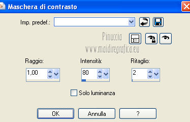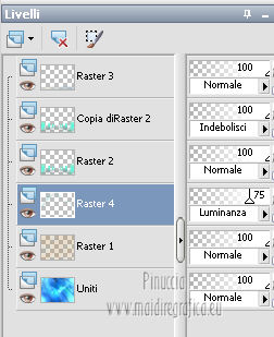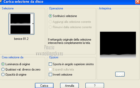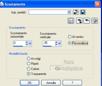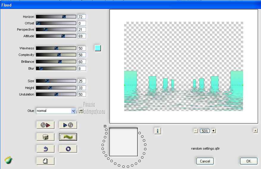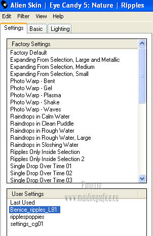 qui puoi trovare qualche risposta ai tuoi dubbi. Se l'argomento che ti interessa non è presente, ti prego di segnalarmelo. Occorrente: Materiale qui I tubes sono di Thafs e Kitty Filtri: consulta, se necessario, la mia sezione filtri qui AAA Frames - Foto Frame qui Flaming Pear - Flood qui Alien Skin Eye Candy 5 Impact qui Alien Skin Eye Candy 5 Nature qui ![]() Metti i preset nelle rispettive cartelle del filtro. Cliccando sul file una o due volte (a seconda delle tue impostazioni), automaticamente il preset si installerà nella cartella corretta. Metti il pennello nella cartella Pennelli. Attenzione, il pennello è composto da due files che non devono essere separati. Vedi gli appunti sui pennelli qui Metti le selezioni nella cartella Selezioni. Imposta il colore di primo piano con #00ffff, e il colore di sfondo con #92f2cc. ![]() Passa il colore di primo piano a Gradiente, stile lineare. ![]() 1. Apri una nuova immagine trasparente 800 x 600 pixels. Selezione>Seleziona tutto. Apri l'immagine di sfondo achtergrond L81 e vai a Modifica>Copia. Torna al tuo lavoro e vai a Modifica>Incolla nella selezione. Selezione>Deseleziona. 2. Livelli>Nuovo livello raster. Selezione>Seleziona tutto. Apri l'immagine Plaatje L81 e vai a Modifica>Copia. Torna al tuo lavoro e vai a Modifica>Incolla nella selezione. Selezione>Deseleziona. Cambia la modalità di miscelatura di questo livello in Indebolisci, e abbassa l'opacità al 40%. Regola>Sfocatura>Sfocatura gaussiana - raggio 3. ![]() Livelli>Unisci>Unisci visibile. 3. Livelli>Nuovo livello raster. Selezione>Seleziona tutto. Apri il tube Slice_of_Paradise e vai a Modifica>Copia. Torna al tuo lavoro e vai a Modifica>Incolla nella selezione. Selezione>Deseleziona. Cambia la modalità di miscelatura di questo livello in Luminanza (esistente), e abbassa l'opacità al 36%. Livelli>Duplica. Cambia la modalità di miscelatura di questo livello in Indebolisci e abbassa l'opacità al 27%. Livelli>Unisci>Unisci visibile. 4. Livelli>Nuovo livello raster. Effetti>Plugins>Alien Skin Eye Candy 5 Nature - Ripples. Seleziona il preset Benice_ripples_L81 e ok. ![]() 5. Livelli>Nuovo livello raster. Selezione>Carica/Salva selezione>Carica selezione da disco. Cerca e carica la selezione Benice 81.1. ![]() Riempi la selezione con il gradiente.Selezione>Deseleziona. Effetti>Plugins>Flaming Pear - Flood. l'aspetto delle onde è casuale e pertanto non potranno essere uguali a quelle del mio esempio. Se vuoi, puoi cambiare l'aspetto delle onde cliccando sull'icona dell'onda verde, finchè - nella finestra di anteprima - non vedi il risultato che preferisci. ![]() Livelli>Duplica. Cambia la modalità di miscelatura di questo livello in Indebolisci. 6. Livelli>Nuovo livello raster. Selezione>Carica/Salva selezione>Carica selezione da disco. Cerca e carica la selezione Benice 82.2. ![]() Selezione>Modifica>Sfuma - 35 pixels. ![]() Apri l'immagine Beach e vai a Modifica>Copia. Torna al tuo lavoro e vai a Modifica>Incolla nella selezione. Selezione>Deseleziona. Livelli>Duplica. Effetti>Effetti di immagine>Scostamento. ![]() Livelli>Unisci>Unisci giù. 7. Imposta il colore di primo piano con #90ffff, e il colore di sfondo con il bianco #ffffff. ![]() Passa il colore di primo piano a Gradiente, stile lineare. ![]() Livelli>Nuovo livello raster. Selezione>Carica/Salva selezione>Carica selezione da disco. Cerca e carica la selezione Benice 81.3. ![]() Riempi la selezione con il gradiente.Selezione>Deseleziona. Effetti>Effetti 3D>Sfalsa ombra. ![]() Cambia la modalità di miscelatura di questo livello in Luminanza, e abbassa l'opacità al 75%. Porta questo livello sopra il livello Raster 1. ![]() 8. Attiva nuovamente il livello superiore. Apri il tube Benice_bal e vai a Modifica>Copia. Torna al tuo lavoro e vai a Modifica>Incolla come nuovo livello. Immagine>Ridimensiona, al 45%, tutti i livelli non selezionato. Effetti>Effetti di immagine>Scostamento. ![]() Regola>Messa a fuoco>Accentua messa a fuoco. 9. Livelli>Nuovo livello raster. Selezione>Carica/Salva selezione>Carica selezione da disco. Cerca e carica la selezione Benice 81.4. ![]() Apri il tube Dance en bleu_tubed_by_thafs, che ha una selezione attiva. Mantieni selezionato e vai a Modifica>Copia. minimizza il tube perchè ti servirà ancora. Torna al tuo lavoro e vai a Modifica>Incolla nella selezione. Selezione>Deseleziona. Cambia la modalità di miscelatura di questo livello in Luce netta. Livelli>Unisci>Unisci giù. 10. Selezione>Seleziona tutto. Selezione>Mobile. Selezione>Modifica>Sfuma - 1 pixel. Selezione>Inverti. Clicca 3 o 4 volte sulla tastiera il tasto CANC. Selezione>Deseleziona. Effetti>Effetti 3D>Sfalsa ombra. ![]() Livelli>Duplica. Immagine>Ridimensiona, al 45%, tutti i livelli non selezionato. Regola>Messa a fuoco>Maschera di contrasto. ![]() Sposta a destra.Livelli>Duplica. Sposta questo tube in alto,come nell'esempio. ![]() Livelli>Unisci>Unisci giù, 2 volte. Effetti>Plugins>Alien Skin Eye Candy 5 Impact - Backlight seleziona il preset Benice_backlight_L81 e ok. ![]() 11. Attiva nuovamente il tube Dance en bleu_tubed_by_thafs. Selezione>Deseleziona. Immagine>Rifletti. Modifica>Copia. Torna al tuo lavoro e vai a Modifica>Incolla come nuovo livello. Immagine>Ridimensiona, al 70%, tutti i livelli non selezionato. Sposta il tube in basso a sinistra.Regola>Messa a fuoco>Metti a fuoco. Effetti>Plugins>Alien Skin Eye Candy 5 Impact - Perspective Shadow seleziona il preset Benice_shadow_L81. ![]() 12. Apri il tube 2YuChengHong_Franz2_tubed _by _Thafs e vai a Modifica>Copia. Torna al tuo lavoro e vai a Modifica>Incolla come nuovo livello. Immagine>Ridimensiona, al 35%, tutti i livelli non selezionato. Sposta il tube in basso a sinistra.Regola>Tonalità e saturazione>Viraggio. ![]() Livelli>Duplica. Cambia la modalità di miscelatura di questo livello in Moltiplica. Livelli>Unisci>Unisci giù. Effetti>Effetti 3D>Sfalsa ombra. ![]() 13. Lascia il colore di primo piano con #90ffff, e imposta il colore di sfondo con #687