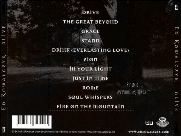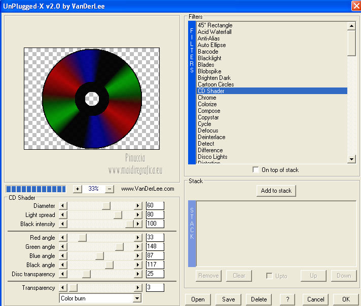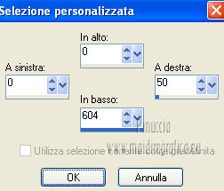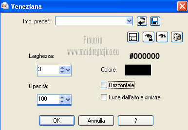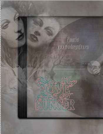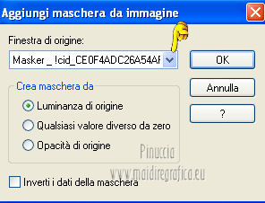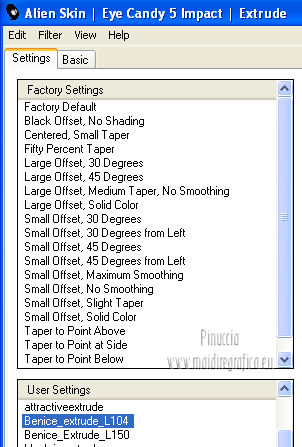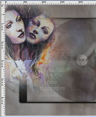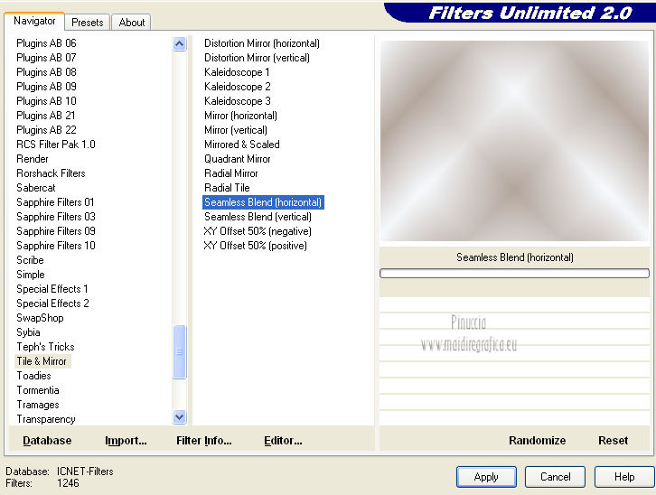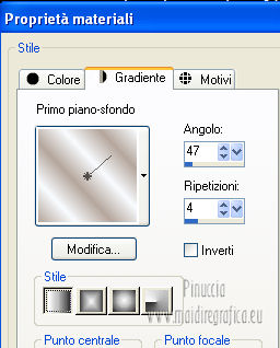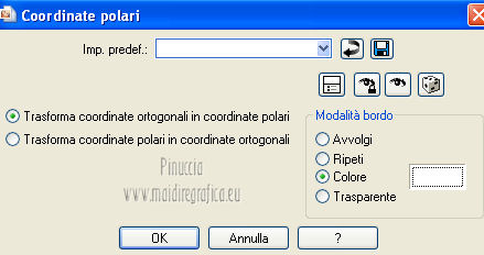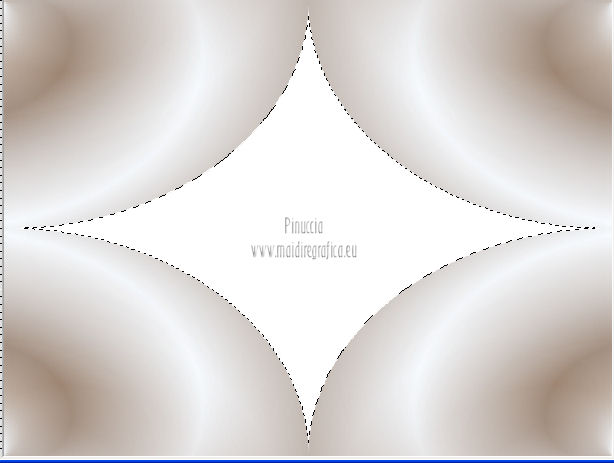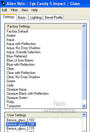 qui puoi trovare qualche risposta ai tuoi dubbi. Se l'argomento che ti interessa non è presente, ti prego di segnalarmelo. Occorrente: Materiale qui Filtri: consulta, se necessario, la mia sezione filtri qui Filters Unlimited 2.0 qui VM Distortion qui VanDerLee Unplugged X qui Alien Skin Eye Candy 5 Impact qui I filtri VM Distortion si possono usare da soli o importati in Filters Unlimited. Come importare un filtro in Unlimited, vedi qui ![]() Apri il font e minimizzalo. Lo troverai nella lista dei font disponibili quando ti servirà. Metti i preset nelle rispettive cartelle del filtro Alien Skin Eye Candy 5 Impact>Settings/Extrude-Glass. Cliccando sul file una o due volte (a seconda delle tue impostazioni) il preset si installerà automaticamente nella cartella corretta. Apri il pennello SL5 in PSP ed esportalo come Pennello personalizzato. Vedi gli appunti sui Pennelli qui Apri la maschera in PSP e minimizzala con il resto del materiale. Imposta il colore di primo piano con #b4a69c, e il colore di sfondo con #f8fbfe. ![]() Passa il colore di primo piano a Gradiente di primo piano/sfondo, stile Lineare. ![]() 1. Apri una nuova immagine trasparente 800 x 600 pixels, e riempila con il gradiente.Effetti>Plugins>Filters Unlimited 2.0 - Tile & Mirror - Seamless Blend (horizontal). ![]() 2. Livelli>Duplica. Effetti>Plugins>Filters Unlimited 2.0 - Tile & Mirror - XY Offset 50% (negative). ![]() Cambia la modalità di miscelatura di questo livello in Rafforza. Livelli>Unisci>Unisci giù. 3. Livelli>Duplica. Effetti>Effetti di distorsione>Coordinate polari. ![]() Effetti>Plugins>Filters Unlimited 2.0 - Tile & Mirror - Mirror(vertical). ![]() Effetti>Plugins>Filters Unlimited 2.0 - Tile & Mirror - XY Offset 50% (negative). ![]() Attiva lo strumento Bacchetta magica ![]() e clicca nella parte bianca per selezionarla. ![]() Premi sulla tastiera il tasto CANC. Selezione>Deseleziona. Abbassa l'opacità di questo livello al 21%. Livelli>Unisci>Unisci giù. 4. Livelli>Duplica. Effetti>Plugins>Filters Unlimited 2.0 - VM Distortion - Radiator. ![]() Abbassa l'opacità di questo livello al 34%. Livelli>Duplica. Cambia la modalità di miscelatura di questo livello in Moltiplica, e mantieni l'opacità al 34%. Livelli>Unisci>Unisci visibile. Livelli>Duplica. Cambia la modalità di miscelatura di questo livello in Differenza, e abbassa l'opacità al 42%. Livelli>Unisci>Unisci visibile. 5. Livelli>Nuovo livello raster. Riempi il livello con il colore di sfondo.Livelli>Nuovo livello maschera>Da immagine. Apri il menu sotto la finestra di origine e vedrai la lista dei files aperti. Seleziona la maschera Masker_!cid_CE0F4ADC26A54AFA8F, con i seguenti settaggi. ![]() Livelli>Unisci>Unisci gruppo. Livelli>Unisci>Unisci visibile. Finestra>Duplica (o, sulla tastiera, maiuscola+D) per fare una copia. Minimizza la copia e torna al tuo lavoro originale. 6. Livelli>Nuovo livello raster. Selezione>Seleziona tutto. Apri l'immagine ALLCDCovers e vai a Modifica>Copia. Torna al tuo lavoro e vai a Modifica>Incolla nella selezione. Selezione>Deseleziona. Cambia la modalità di miscelatura di questo livello in Luminanza (esistente). Attiva lo strumento Selezione , rettangolo,e seleziona il testo al centro. ![]() Effetti>Effetti di bordo>Aumenta di più. Modifica>Ripeti Aumenta di più i bordi. Selezione>Deseleziona. Abbassa l'opacità di questo livello al 5%. 7. Apri il tube Ride_The_Lightening_by_SweetChile e vai a Modifica>Copia. Torna al tuo lavoro e vai a Modifica>Incolla come nuovo livello. Immagine>Ridimensiona, all'80%, tutti i livelli non selezionato. Immagine>Rifletti. Sposta il tube in basso a destra.![]() Cambia la modalità di miscelatura di questo livello in Luminanza (esistente), e abbassa l'opacità al 27%. 8. Apri il tube Karine_dreams_Misted_Lake_885_Janvier 2010 e vai a Modifica>Copia. Torna al tuo lavoro e vai a Modifica>Incolla come nuovo livello. Immagine>Ridimensiona, al 70%, tutti i livelli non selezionato. Effetti>Effetti di immagine>Scostamento. ![]() Cambia la modalità di miscelatura di questo livello in Luminanza (esistente), e abbassa l'opacità al 24%. 9. Livelli>Unisci>Unisci tutto. Finestra>Duplica (o maiuscola+D) e metti da parte la copia. 10. Torna al tuo lavoro originale. Livelli>Nuovo livello raster. Effetti>Plugins>VanDerLee - Unplugged X - CD Shader. ![]() Cambia la modalità di miscelatura di questo livello in Moltiplica, e abbassa l'opacità al 15%. Selezione>Deseleziona. Selezione>Mobile. Selezione>Immobilizza. 11. Attiva il duplicato del punto 9. ![]() Modifica>Copia. Torna al tuo lavoro e vai a Modifica>Incolla come nuovo livello. Selezione>Inverti. Premi sulla tastiera il tasto CANC. Selezione>Deseleziona. Cambia la modalità di miscelatura di questo livello in Moltiplica, e abbassa l'opacità al 27%. Livelli>Unisci>Unisci visibile. 12. Immagine>Aggiungi bordatura, simmetriche non selezionato, colore #202020. ![]() Attiva lo strumento Selezione ![]() clicca sull'icona Selezione personalizzata ![]() e imposta i seguenti settaggi. ![]() Effetti>Effetti di trama>Veneziana - colore nero. ![]() Selezione>Deseleziona. 13. Immagine>Ridimensiona, al 75%, tutti i livelli selezionato. Regola>Messa a fuoco>Metti a fuoco. Modifica>Copia. 14. Attiva il duplicato minimizzato al punto 5. ![]() Torna al tuo lavoro e vai a Modifica>Incolla come nuovo livello. 15. Effetti>Plugins>Alien Skin Eye Candy 5 Impact - Glass. Seleziona il preset Benice_glass_L104. ![]() Effetti>Plugins>Alien Skin Eye Candy 5 Impact - Extrude. Seleziona il preset Benice_extrude_L104. ![]() 16. Apri il tube Mtfp_180_misted_mirror_byRaipun e vai a Modifica>Copia. Torna al tuo lavoro e vai a Modifica>Incolla come nuovo livello. Spostalo in alto a sinistra.![]() Cambia la modalità di miscelatura di questo livello in Luminanza (esistente), e abbassa l'opacità al 47%. 17. Livelli>Nuovo livello raster. Attiva lo strumento Pennello ![]() cerca e seleziona il pennello SL5, con i seguenti settaggi. ![]() Applica il pennello cliccando c
