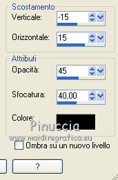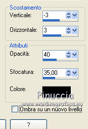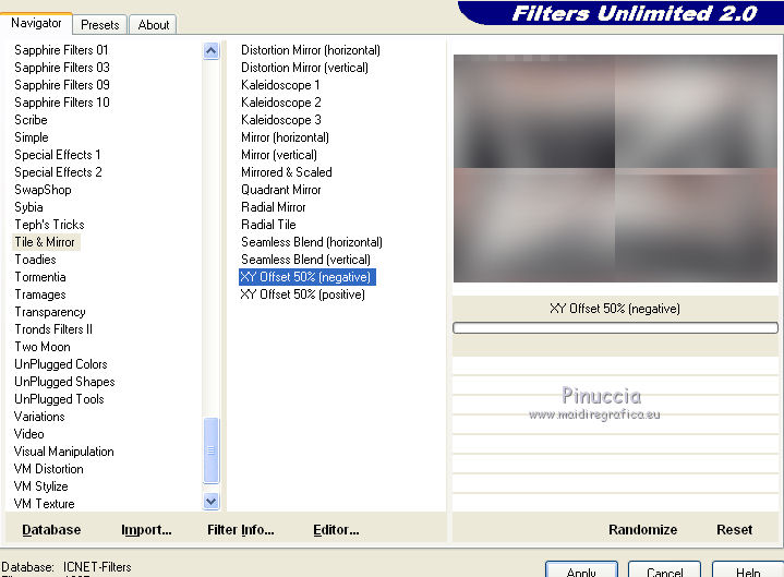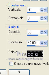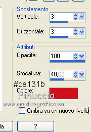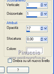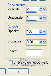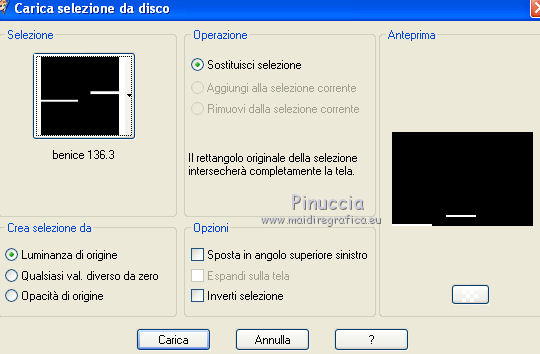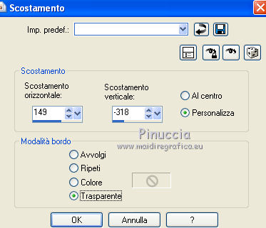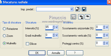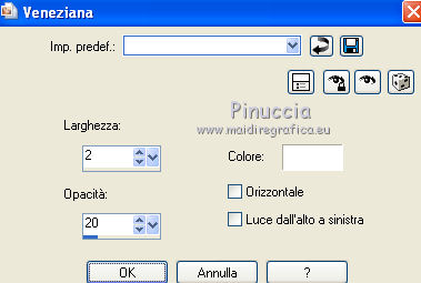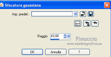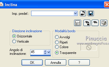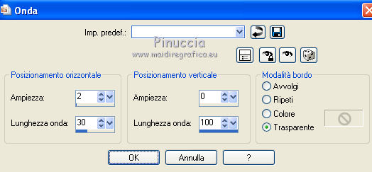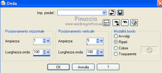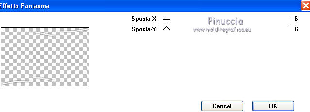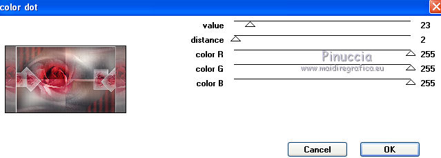 qui puoi trovare qualche risposta ai tuoi dubbi. Se l'argomento che ti interessa non è presente, ti prego di segnalarmelo. Occorrente: Materiale qui Il tube della donna è di Liza Filtri: consulta, se necessario, la mia sezione filtri qui Filters Unlimited 2.0 qui Italian Editors Effect qui Penta.com - Color dot qui Mura's Meister - Copies qui Transparency - Eliminate Black qui I filtri Italian Editors, Penta e Transparency possono essere usati da soli o importati in Filters Unlimited ![]() Metti il preset "Preset_UserDefinedFilter_Emboss3 nella cartella Impostazioni predefinite. Metti le selezioni nella cartella Selezioni. Apri la maschera in PSP e minimizzala con il resto del materiale. Imposta il colore di primo piano con #000000, e il colore di sfondo con #ffffff. ![]() 1. Apri una nuova immagine trasparente 900 x 600 pixels, e riempila con il colore di primo piano.2. Apri il tube Liza tube red flower hat 4-6-2011 e vai a Modifica>Copia. non chiuderlo perchè ti servirà ancora Torna al tuo lavoro e vai a Modifica>Incolla come nuovo livello. Immagine>Ridimensiona, all'85%, tutti i livelli non selezionato. Effetti>Effetti di immagine>Motivo unico, con i settaggi standard. ![]() Effetti>Plugins>Mura's Meister - Copies. ![]() ricorda che Random significa Casuale. Per questo il tuo risultato potrebbe essere diverso dal mio Regola>Sfocatura>Sfocatura radiale. ![]() Regola>Sfocatura>Sfocatura gaussiana - raggio 43. ![]() Livelli>Unisci>Unisci giù. 3. Effetti>Plugins>Filters Unlimited 2.0 - Tile & Mirror - XY Offset 50% (negative). ![]() Livelli>Duplica. Effetti>Plugins>Transparency - Eliminate Black. Cambia la modalità di miscelatura di questo livello in Rafforza. Livelli>Unisci>Unisci giù. 4. Livelli>Nuovo livello raster. Riempi con il colore di sfondo.Livelli>Nuovo livello maschera>Da immagine. Apri il menu sotto la finestra di origine e vedrai la lista dei files aperti. Seleziona la maschera Narah_mask_Abstract120, con i seguenti settaggi: ![]() Livelli>Unisci>Unisci gruppo. 5. Selezione>Carica/Salva selezione>Carica selezione da disco. Cerca e carica la selezione Benice 136.1. ![]() Premi sulla tastiera il tasto CANC. Selezione>Deseleziona. Cambia la modalità di miscelatura di questo livello in Indebolisci, e abbassa l'opacità al 55%. 7. Imposta il colore di primo piano con #911412. ![]() Livelli>Nuovo livello raster. Selezione>Carica/Salva selezione>Carica selezione da disco. Cerca e carica la selezione Benice 136.2. ![]() Riempi la selezione con il colore di primo piano.Selezione>Deseleziona. Effetti>Effetti di distorsione>Onda. ![]() Effetti>Effetti geometrici>Inclina. ![]() Effetti>Effetti di immagine>Scostamento. ![]() 7. Livelli>Duplica. Effetti>Effetti di trama>Veneziana. ![]() Effetti>Effetti di bordo>Aumenta di più. Cambia la modalità di miscelatura di questo livello in Sovrapponi. Livelli>Unisci>Unisci giù. 8. Livelli>Duplica. Immagine>Rifletti. Immagine>Capovolgi. Effetti>Effetti di immagine>Scostamento. ![]() Livelli>Unisci>Unisci giù. Cambia la modalità di miscelatura di questo livello in Luce netta, e abbassa l'opacità al 20%. 9. Livelli>Nuovo livello raster. Selezione>Carica/Salva selezione>Carica selezione da disco. Cerca e carica la selezione Benice 136.3. ![]() Riempi la selezione con il colore di sfondo.Selezione>Deseleziona. Effetti>Effetti di distorsione>Vento - da sinistra, intensità 100. ![]() Effetti>Effetti di distorsione>Vento, questa volta da destra. ![]() Effetti>Effetti di distorsione>Onda. ![]() 10. Livelli>Duplica. Immagine>Rifletti. Immagine>Capovolgi. Livelli>Unisci>Unisci giù. Effetti>Plugins>Italian Editors Effect - Effetto Fantasma. ![]() Regola>Messa a fuoco>Metti a fuoco. Abbassa l'opacità di questo livello al 28%. Effetti>Effetti 3D>Sfalsa ombra, con il colore #ce131b. ![]() 11. Apri il tube Benice_misted_rose e vai a Modifica>Copia. Torna al tuo lavoro e vai a Modifica>Incolla come nuovo livello. Effetti>Effetti di immagine>Scostamento. ![]() Cambia la modalità di miscelatura di questo livello in Luce netta, e abbassa l'opacità all'85%. 12. Apri il tube ldw_mot (wa2) e vai a Modifica>Copia. Torna al tuo lavoro e vai a Modifica>Incolla come nuovo livello. Lascialo come sta. E' correttamente posizionato. Effetti>Effetti 3D>Sfalsa ombra, con il colore bianco. ![]() Effetti>Plugins>Filtro definito dall'utente. Apri il menu delle impostazioni e seleziona Emboss_3. ![]() Abbassa l'opacità di questo livello al 10%. 13. Apri il tube Benice_roos_lijst e vai a Modifica>Copia. Torna al tuo lavoro e vai a Modifica>Incolla come nuovo livello. Lascialo come sta. Effetti>Effetti 3D>Sfalsa ombra. ![]() Abbassa l'opacità di questo livello al 57%. 14. Livelli>Unisci>Unisci tutto. Immagine>Ridimensiona, all'80%, tutti i livelli selezionato. Regola>Messa a fuoco>Metti a fuoco. Finestra>Duplica (o, sulla tastiera, maiuscola+D) per fare una copia. Minimizza il duplicato. 15. Torna al tuo lavoro originale. Immagine>Aggiungi bordatura, 2 pixels, simmetriche, con il colore #ffffff. Livelli>Innalza livello di sfondo. Immagine>Dimensioni tela. ![]() 16. Imposta il colore di primo piano con #808080. ![]() Livelli>Nuovo livello raster. Riempi il livello con il colore di primo piano.Livelli>Disponi>Porta sotto. 17. Chiudi il livello superiore e rimani posizionato sul livello inferiore. Attiva l'immagine che hai minimizzato al punto 14 e vai a Modifica>Copia. Torna al tuo lavoro e vai a Modifica>Incolla come nuovo livello. Effetti>Effetti di immagine>Scostamento. ![]() 18. Livelli>Duplica. Immagine>Rifletti. Livelli>Unisci>Unisci giù. Abbassa l'opacità di questo livello al 50%. Apri il livello superiore. Livelli>Unisci>Unisci visibile. Effetti>Plugins>Penta.com - Color Dot. ![]() 19. Attiva nuovamente il tube Liza tube red flower hat 4-6-2011 e vai a Modifica>Copia. Torna al tuo lavoro e vai a Modifica>Incolla come nuovo livello. Immagine>Ridimensiona, all'85%, tutti i livelli non selezionato. Regola>Messa a fuoco>Metti a fuoco. Effetti>Effetti di immagine