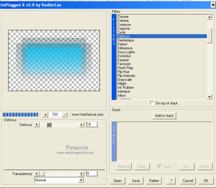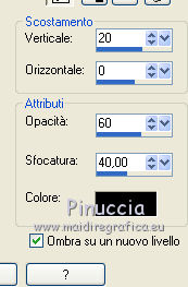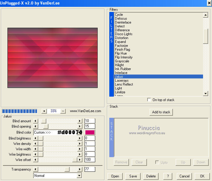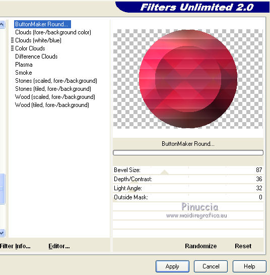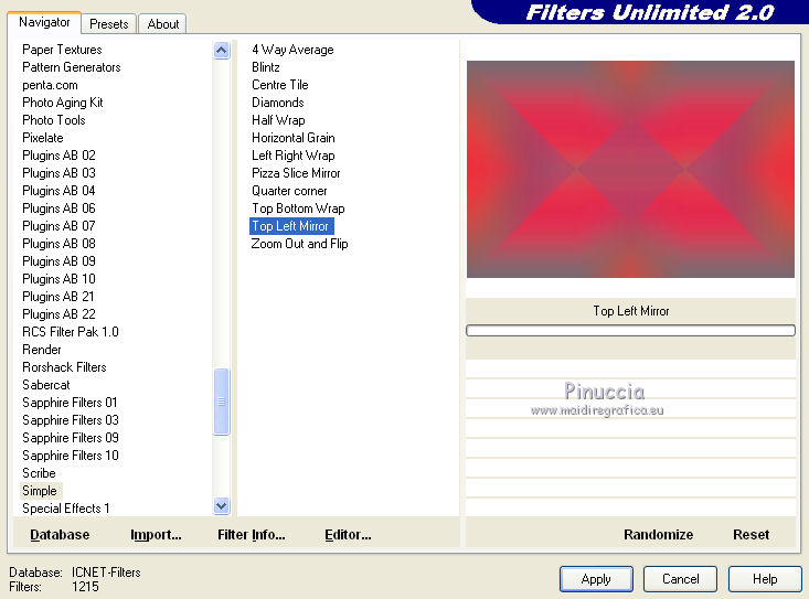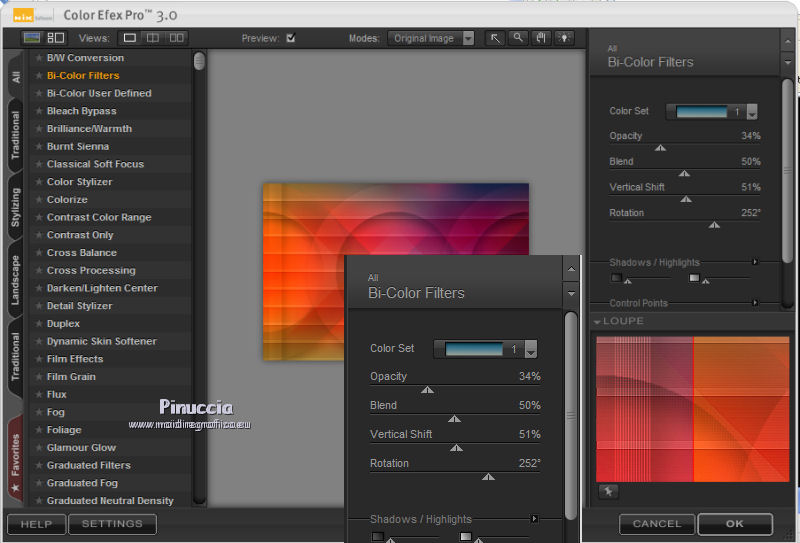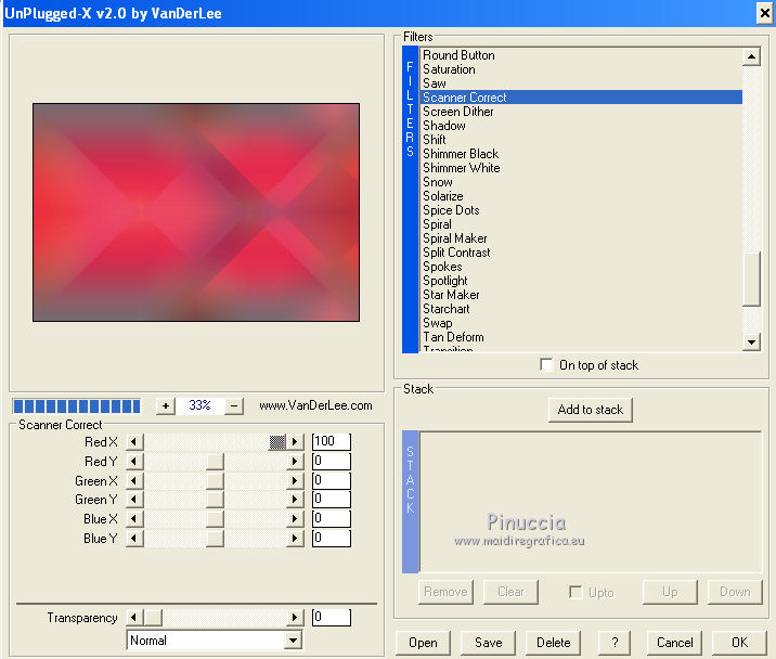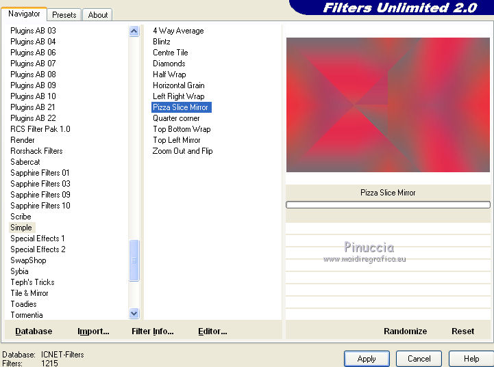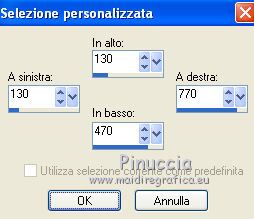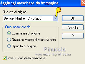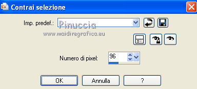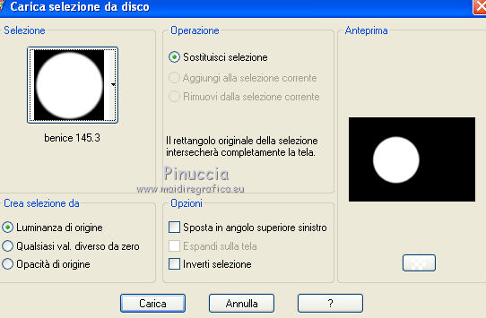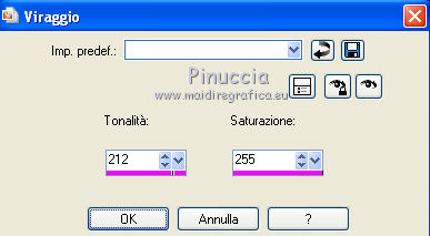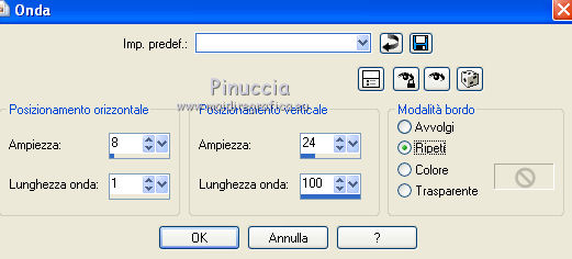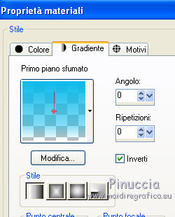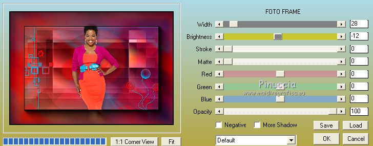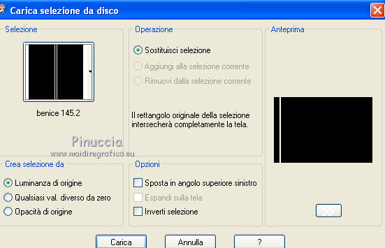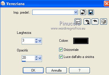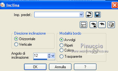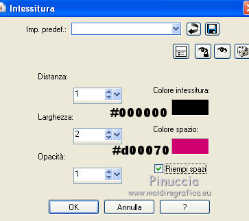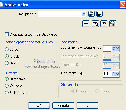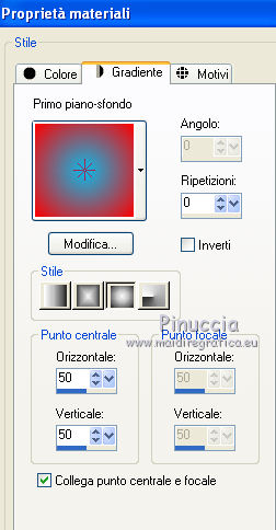 qui puoi trovare qualche risposta ai tuoi dubbi. Se l'argomento che ti interessa non è presente, ti prego di segnalarmelo. Occorrente: Materiale qui Il tube della donna è di DBK. Filtri: consulta, se necessario, la mia sezione filtri qui Filters Unlimited 2.0 qui Render - ButtonMaker Round qui VanDeLee - Unplugged-X qui Simple qui Nik Software - Color Efex qui °v° Kiwi's Oelfilter qui Dégradés cône simple qui AAA Frames - Foto Frame qui I filtri Kiwi e Simple si possono usare da soli o importati in Filters Unlimited ![]() Il gradiente Corel_06_026 è standard nelle versioni più recenti di PSP, e corrisponde al gradiente standard Primo piano sfumato delle versioni precedenti. Se non lo trovi nel tuo PSP, metti quello fornito nella cartella Gradienti. Metti le selezioni nella cartella Selezioni. Apri le maschere in PSP e minimizzale con il resto del materiale. Imposta il colore di primo piano con #0abaea, e il colore di sfondo con #ff0000. ![]() 1. Apri una nuova immagine trasparente 900 x 600 pixels. Selezione>Seleziona tutto. Apri l'immagine BG_Benice_L145 e vai a Modifica>Copia. Torna al tuo lavoro e vai a Modifica>Incolla nella selezione. Selezione>Deseleziona. Effetti>Effetti geometrici>Inclina. ![]() 2. Effetti>Plugins>Filters Unlimited 2.0 - Simple - Pizza Slice Mirror. ![]() Effetti>Plugins>Filters Unlimited 2.0 - Simple - Top Left Mirror. ![]() Effetti>Plugins> VanDerLee - Unplugged-X - Scanner Correct. ![]() 3. Livelli>Duplica. Effetti>Plugins> VanDerLee - Unplugged-X - Jalusi. ![]() Effetti>Effetti di bordo>Aumenta. Cambia la modalità di miscelatura di questo livello in Luminanza (esistente). Livelli>Unisci>Unisci giù. 4. Livelli>Duplica. Effetti>Plugins>Filters Unlimited 2 - Render - ButtonMaker Round. ![]() Selezione>Seleziona tutto. Selezione>Mobile. Selezione>Modifica>Contrai - 96 pixels. ![]() Premi sulla tastiera il tasto CANC. Selezione>Deseleziona. 5. Effetti>Effetti di immagine>Motivo unico. ![]() Effetti>Effetti di trama>Veneziana. ![]() Abbassa l'opacità di questo livello al 33%. Effetti>Effetti 3D>Sfalsa ombra, ombra su nuovo livello selezionato. ![]() 6. Rimani posizionato sul livello dell'ombra. Effetti>Effetti di trama>Intessitura. colore intessitura #000000 - colore spazio #d00070. ![]() Selezione>Carica/Salva selezione>Carica selezione da disco. Cerca e carica la selezione Benice 145.1. ![]() Premi sulla tastiera il tasto CANC. Selezione>Deseleziona. Cambia la modalità di miscelatura di questo livello in Luce netta, e abbassa l'opacità al 50%. Livelli>Unisci>Unisci visibile. 7. Selezione>Carica/Salva selezione>Carica selezione da disco. Cerca e carica la selezione Benice 145.2. ![]() Selezione>Innalza selezione a livello. Selezione>Deseleziona. Regola>Messa a fuoco>Metti a fuoco. Effetti>Effetti 3D>Sfalsa ombra. non dimenticare di togliere la selezione a Ombra su nuovo livello. ![]() Livelli>Unisci>Unisci giù. 8. Livelli>Duplica. Attiva il livello inferiore. Regola>Tonalità e saturazione>Viraggio. ![]() Attiva il livello superiore. Effetti>Plugins>Nik Software - Color Efex Pro 3.0 - Bi-Color Filters. Color set: Cool/Warm 1. ![]() Abbassa l'opacità di questo livello all'82%. Livelli>Unisci>Unisci giù. Dovresti avere questo: ![]() 9. Passa il colore di primo piano a Gradiente Primo piano sfumato (o Corel_06_26). ![]() Livelli>Nuovo livello raster. Attiva lo strumento Selezione ,clicca sull'icona Selezione personalizzata ![]() e imposta i seguenti settaggi: ![]() Riempi la selezione con il gradiente.Selezione>Deseleziona. 10. Effetti>Plugins> VanDerLee - Unplugged-X - Defocus. ![]() Effetti>Plugins> Dégradés - Dégradé cône Simple. ![]() Cambia la modalità di miscelatura di questo livello in Indebolisci. 11. Livelli>Duplica. Effetti>Plugins>Filters Unlimited 2.0 - Kiwi's Oelfilter - Setzboard. ![]() Riporta la modalità di miscelatura di questo livello in Normale. Livelli>Unisci>Unisci visibile. Dovresti avere questo: ![]() 12. Livelli>Nuovo livello raster. Riempi il livello con il colore di sfondo.Livelli>Nuovo livello maschera>Da immagine. Apri il menu sotto la finestra di origine e vedrai la lista dei files aperti. Seleziona la maschera Masker_Benice_L145, con i seguenti settaggi: ![]() Livelli>Unisci>Unisci gruppo. 13. Selezione>Carica/Salva selezione>Carica selezione da disco. Cerca e carica la selezione Benice 145.3. ![]() Selezione>Innalza selezione a livello. Selezione>Deseleziona. Effetti>Effetti di immagine>Scostamento. ![]() Livelli>Unisci>Unisci giù. Abbassa l'opacità di questo livello al 60%. 14. Imposta il colore di primo piano con #0abaea. ![]() Livelli>Nuovo livello raster. Riempi il livello con il colore di primo piano.Livelli>Nuovo livello maschera>Da immagine. Apri il menu sotto la finestra di origine e seleziona la maschera Benice_Masker_L145.2, con i seguenti settaggi: ![]() Livelli>Unisci>Unisci gruppo. Abbassa l'opacità di questo livello al 48%. 15. Livelli>Duplica. Effetti>Effetti di distorsione>Onda. ![]() Immagine>Rifletti. Immagine>Capovolgi. Effetti>Effetti di immagine>Scostamento. ![]() Lascia l'opacità al 48%. Dovresti avere questo: ![]() 16. Livelli>Unisci>Unisci visibile. Finestra>Duplica (o, sulla tastiera maiuscola+D) per fare una copia. Minimizza il duplicato. 17. Torna al tuo lavoro originale. Livelli>Nuovo livello raster. Selezione>Carica/Salva selezione>Carica selezione da disco. Cerca e carica la selezione Benice 145.4. ![]() Riempi la selezione con il colore di primo piano.Selezione>Deseleziona. Effetti>Effetti 3D>Sfalsa ombra. ![]() 18. Passa il colore di primo piano a Gradiente, stile Sprazzo di luce: ![]() Livelli>Nuovo livello raster. Selezione>Carica/Salva selezione>Carica selezione da disco. Cerca e carica la selezione Benice 145.5. ![]() Riempi la selezione con il gradiente.Selezione>Deseleziona. Effetti>Effetti 3D>Sfalsa ombra. ![]() Effetti>Effetti 3D>Sfalsa ombra. ![]() 19. Livelli>Nuovo livello raster. Selezione>Carica/Salva selezione>Carica selezione da disco. Cerca e carica la selezione 