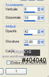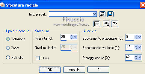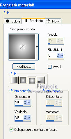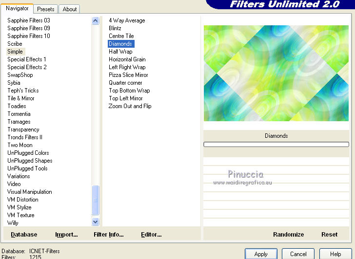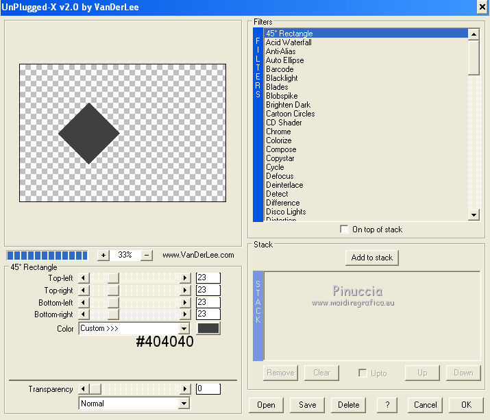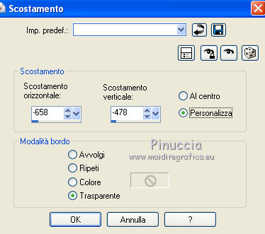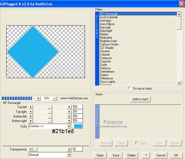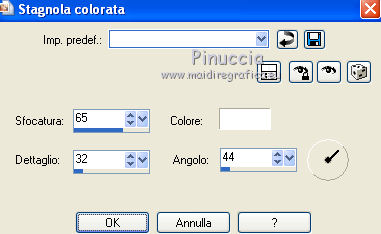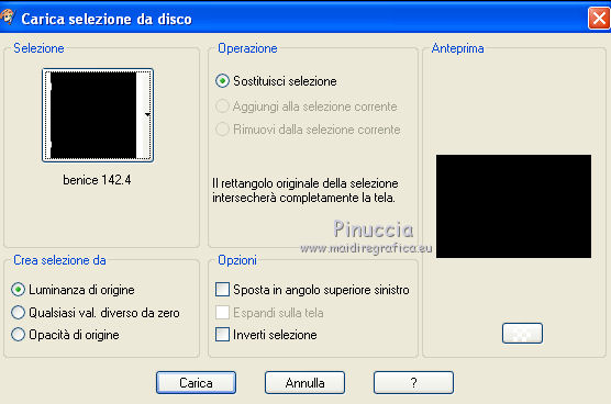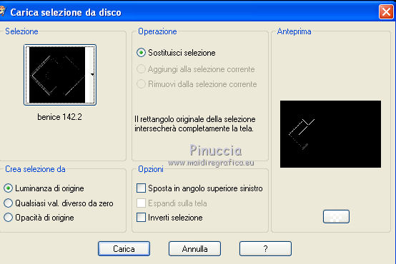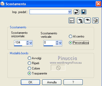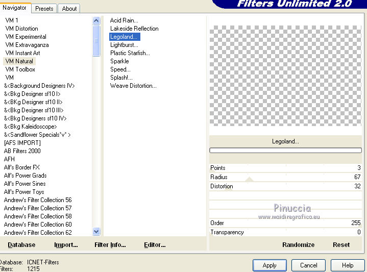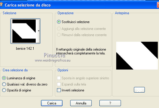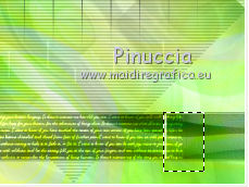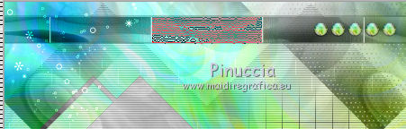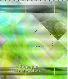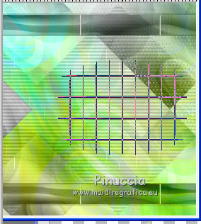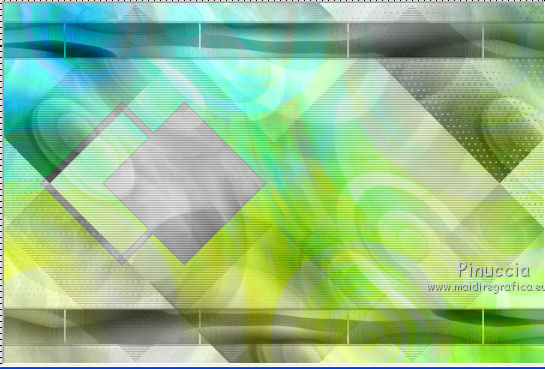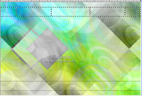 qui puoi trovare qualche risposta ai tuoi dubbi. Se l'argomento che ti interessa non è presente, ti prego di segnalarmelo. Occorrente: Materiale qui Il tube della donna è di Annelies Filtri: consulta, se necessario, la mia sezione filtri qui Filters Unlimited 2.0 qui VanDerLee Unplugged-X qui Simple qui VM Natural qui VM Extravaganza qui i filtri VM Natural e VM Extravaganza, come tutti quelli della serie Visman e i filtri Simple si possono usare da soli o importati in Unlimited ![]() Metti i pennelli nella cartella Pennelli. Attenzione, ogni pennello è composto da due files che non devono essere separati. Vedi gli appunti sui pennelli qui Metti le selezioni nella cartella Selezioni. Imposta il colore di primo piano con #404040, e il colore di sfondo con #ffffff. ![]() 1. Apri una nuova immagine trasparente 900 x 600 pixels. Selezione>Seleziona tutto. Apri l'immagine BG_Benice_142 e vai a Modifica>Copia. Torna al tuo lavoro e vai a Modifica>Incolla nella selezione. Selezione>Deseleziona. 2. Livelli>Nuovo livello raster. Selezione>Seleziona tutto. Apri l'immagine Trippy_by_charly_v e vai a Modifica>Copia. Torna al tuo lavoro e vai a Modifica>Incolla nella selezione. Selezione>Deseleziona. Cambia la modalità di miscelatura di questo livello in Sovrapponi, e abbassa l'opacità al 55%. 3. Livelli>Duplica. Immagine>Capovolgi. Cambia la modalità di miscelatura di questo livello in Luminanza (esistente), e abbassa l'opacità di questo livello al 14%. Livelli>Unisci>Unisci visibile. Immagine>Rifletti. 4. Livelli>Duplica. Effetti>Plugins>Filters Unlimited 2.0 - Simple - Diamonds. ![]() Immagine>Capovolgi. Cambia la modalità di miscelatura di questo livello in Luminanza (esistente). 5. Livelli>Nuovo livello raster. Effetti>Plugins>VanDerLee - Unplugged-X - 45° Rectangle. Colore #21b1e8. ![]() Effetti>Plugins>Filters Unlimited - VM Extravaganza - Transmission. ![]() Livelli>Duplica. Immagine>Rifletti. Livelli>Unisci>Unisci giù. Cambia la modalità di miscelatura di questo livello in Luminanza (esistente), e abbassa l'opacità di questo livello al 20%. Livelli>Unisci>Unisci visibile. Dovresti avere questo. ![]() 6. Livelli>Duplica. Effetti>Plugins>Filters Unlimited 2.0 - VM Natural - Legoland. ![]() Abbassa l'opacità di questo livello al 75%. Selezione>Carica/Salva selezione>Carica selezione da disco. Cerca e carica la selezione Benice 142.1. ![]() Premi sulla tastiera il tasto CANC. Selezione>Deseleziona. Livelli>Unisci>Unisci giù. 7. Finestra>Duplica (o, sulla tastiera, maiuscola+D) per fare una copia, e minimizza questa copia che userai più tardi. 8. Torna al tuo lavoro originale. Livelli>Nuovo livello raster. Effetti>Plugins>VanDerLee - Unplugged-X - 45° Rectangle. Colore #404040. ![]() Livelli>Duplica. Effetti>Effetti di immagine>Scostamento. ![]() Selezione>Seleziona tutto. Selezione>Mobile. Selezione>Modifica>Contrai - 12 pixels. Premi sulla tastiera il tasto CANC. Selezione>Deseleziona. Livelli>Unisci>Unisci giù. Cambia la modalità di miscelatura di questo livello in Saturazione. 9. Livelli>Nuovo livello raster. Selezione>Carica/Salva selezione>Carica selezione da disco. Cerca e carica la selezione Benice 142.2. ![]() Ingrandisci l'immagine con lo strumento zoom o usando la rotellina del mouse.Riempi la selezione con il colore di primo piano.Selezione>Deseleziona. Abbassa l'opacità di questo livello al 34%. Livelli>Unisci>Unisci visibile. Dovresti avere questo. ![]() 10. Livelli>Nuovo livello raster. Selezione>Carica/Salva selezione>Carica selezione da disco. Cerca e carica la selezione Benice 142.3. ![]() Riempi la selezione con il colore di primo piano.Selezione>Deseleziona. Cambia la modalità di miscelatura di questo livello in Luminanza (esistente), e abbassa l'opacità al 59%. 11. Attiva lo strumento Bacchetta magica ![]() ![]() e seleziona i cinque riquadri superiori. ![]() Livelli>Nuovo livello raster. Lascia il lavoro in attesa. 12. Attiva il duplicato che hai minimizzato al punto 7. Su questo duplicato: Immagine>Ridimensiona - 100 x 20% - tutti i livelli selezionato, mantieni proporzioni non selezionato. ![]() Regola>Sfocatura>Sfocatura gaussiana - raggio 13. ![]() Immagine>Capovolgi. Modifica>Copia. Torna al tuo lavoro originale e vai a Modifica>Incolla nella selezione. Effetti>Effetti artistici>Stagnola colorata. ![]() Selezione>Deseleziona. Livelli>Duplica. Immagine>Rifletti. Immagine>Capovolgi. Effetti>Effetti di immagine>Scostamento. ![]() Livelli>Unisci>Unisci giù. Cambia la modalità di miscelatura di questo livello in Luminanza (esistente), e abbassa l'opacità al 78%. Dovresti avere questo. ![]() 13. Livelli>Nuovo livello raster. Selezione>Carica/Salva selezione>Carica selezione da disco. Cerca e carica la selezione Benice 142.4. ![]() Ingrandisci l'immagine per visualizzare meglio lo spazio da riempire, e riempi la selezione con il colore di sfondo.Selezione>Deseleziona. 14. Livelli>Nuovo livello raster. Selezione>Carica/Salva selezione>Carica selezione da disco. Cerca e carica la selezione Benice 142.5. ![]() Ingrandisci l'immagine, e riempi la selezione con il colore di sfondo.Selezione>Deseleziona. Cambia la modalità di miscelatura di questo livello in Indebolisci, e abbassa l'opacitàal 27%. 15. Attiva lo strumento Selezione a mano libera ,e traccia una selezione intorno alle tre linee, come si vede nell'esempio. ![]() Premi sulla tastiera il tasto CANC. Selezione>Deseleziona. 16. Imposta il colore di primo piano con #202020. ![]() Livelli>Nuovo livello raster. Attiva lo strumento Pennello ![]() cerca e seleziona il pennello Benice_brush_L142. ![]() Applica il pennello in alto a destra, come nell'esempio, cliccando con il tasto sinistro del mouse per usare il colore di primo piano. ![]() 17. Apri il tube Benice_L142_deco e vai a Modifica>Copia. Torna al tuo lavoro e vai a Modifica>Incolla come nuovo livello. Effetti>Effetti di immagine>Scostamento. ![]() Livelli>Duplica. Effetti>Effetti di immagine>Scostamento. ![]() 18. Apri il tube Benice_L142_deco2