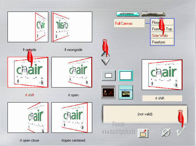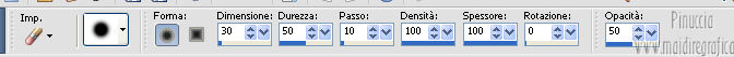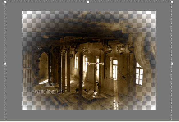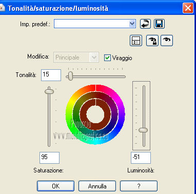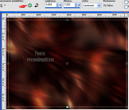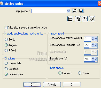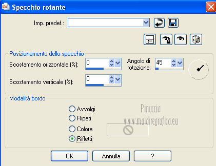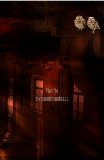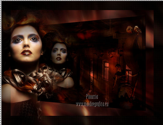 qui puoi trovare qualche risposta ai tuoi dubbi. Se l'argomento che ti interessa non è presente, ti prego di segnalarmelo. Occorrente: Materiale qui Filtri: Penta.com - Dot and Cross qui FM Tile Tools - Blend Emboss qui Andromeda - Perspective qui ![]() Imposta il colore di primo piano con #4e3630, e il colore di sfondo con il colore nero. 1. Apri una nuova immagine trasparente 800 x 600 pixels, e riempila con il colore di primo piano.Livelli>Nuovo livello raster. Selezione>Seleziona tutto. Apri l'immagine Cain-1086, e vai a Modifica>Copia. Torna al tuo lavoro e vai a Modifica>Incolla nella selezione. Selezione>Deseleziona. Cambia la modalità di miscelatura di questo livello in Luce netta. Regola>Sfocatura>Sfocatura radiale. ![]() Effetti>Effetti di immagine>Motivo unico. ![]() Attiva lo strumento Ritaglio ![]() e traccia un ritaglio come mostrato nella schermata sotto, in modo che i punti bianchi non siano visibili. Clicca sul segno di spunta in alto per applicare il ritaglio. ![]() Effetti>Effetti di riflesso>Specchio rotante. ![]() Livelli>Unisci>Unisci giù. Finestra>Duplica - due volte e minimizza i duplicati che ti serviranno più tardi. 2. Torna al tuo lavoro originale. Livelli>Nuovo livello raster. Selezione>Seleziona tutto. Apri il tube NS-126-0809 e vai a Modifica>Copia. Torna al tuo lavoro e vai a Modifica>Incolla nella selezione. Selezione>Deseleziona. Immagine>Rifletti. Premi il tasto K per attivare lo strumento Puntatore ![]() se stai usando PSP 9 il tasto D (valido per tutte le versioni) per attivare lo strumento Deformazione ![]() In modalità Scala spingi i nodi centrali verso l'esterno, in modo che l'immagine riempia tutta l'ampiezza della tela. ![]() Premi il tasto M per deselezionare lo strumento. Cambia la modalità di miscelatura di questo livello in Sovrapponi. Effetti>Plugins>FM Tile Tools - Blend Emboss, con i settaggi standard. ![]() 3. Livelli>Nuovo livello raster. Selezione>Seleziona tutto. Selezione>Modifica>Contrai - 20 pixels. ![]() Selezione>Inverti. Riempi la selezione con il colore di sfondo.Selezione>Deseleziona. Effetti>Plugins>Penta.com - Dot and Cross. ![]() Cambia la modalità di miscelatura di questo livello in Sovrapponi, e abbassa l'opacità al 50%. 4. Apri il tube Narah_0516_Animals_Jan2010 e vai a Modifica>Copia. Torna al tuo lavoro e vai a Modifica>Incolla come nuovo livello. Attiva lo strumento Gomma ![]() e cancella il ramo sotto le zampe degli uccelli. ![]() Immagine>Ridimensiona, al 20%, tutti i livelli non selezionato. Sposta il tube in alto a destra![]() Cambia la modalità di miscelatura di questo livello in Luce netta. 5. Apri il tube Calguisoiseau1829 e vai a Modifica>Copia. Torna al tuo lavoro e vai a Modifica>Incolla come nuovo livello. Immagine>Ridimensiona, all'80%, tutti i livelli non selezionato. Sposta il tube in alto a sinistra.![]() Cambia la modalità di miscelatura di questo livello in Luce netta. 6. Apri il tube Misssilly-Man- Jan 2010 e vai a Modifica>Copia. Torna al tuo lavoro e vai a Modifica>Incolla come nuovo livello. Immagine>Ridimensiona, al 50%, tutti i livelli non selezionato. Sposta il tube in basso a destra, contro il bordo.![]() Cambia la modalità di miscelatura di questo livello in Luce diffusa. 7. Apri il tube GlamourQueen-Fire e vai a Modifica>Copia. non chiuderlo perchè ti servirà ancora Torna al tuo lavoro e vai a Modifica>Incolla come nuovo livello. Immagine>Ridimensiona, al 70%, tutti i livelli non selezionato. Regola>Messa a fuoco>Metti a fuoco. Spostalo in basso a sinistra.8. Immagine>Aggiungi bordatura, 2 pixels, simmetriche, con il colore nero. Immagine>Ridimensiona, al 90, tutti i livelli selezionato. Regola>Messa a fuoco>Metti a fuoco. Modifica>Copia. Attiva uno dei duplicato che hai minimizzato al punto 1. Modifica>Incolla come nuovo livello. Effetti>Plugins>Andromeda - Perspective Clicca sull'icona Presets ![]() e imposta i seguenti settaggi (clicca sulle frecce a destra per scorrere il menu), clicca sul segno di spunta per confermare i settaggi. ![]() Ancora clicca sul segno di spunta per chiudere la finestra del filtro. ![]() Regola>Messa a fuoco>Metti a fuoco. 9. Immagine>Aggiungi bordatura, 50 pixels, simmetriche, con il colore nero. Seleziona questo bordo con la bacchetta magica ![]() Livelli>Nuovo livello raster. Attiva il secondo duplicato che hai minimizzato al punto 1. Modifica>Copia. Torna al tuo lavoro e vai a Modifica>Incolla nella selezione. Effetti>Plugins>Penta.com - Dot and Cross, con i settaggi precedenti. Selezione>Deseleziona. Abbassa l'opacità di questo livello al 20%. 10. Attiva nuovamente il tube GlamourQueen-Fire e vai a Modifica>Copia. Torna al tuo lavoro e vai a Modifica>Incolla come nuovo livello. Immagine>Ridimensiona, al 90%, tuttii livelli non selezionato. Immagine>Rifletti. Regola>Messa a fuoco>Accentua messa a fuoco. Sposta il tube a sinistra.![]() Attiva lo strumento Gomma con i seguenti settaggi![]() Clicca un paio di volte sulla spalla destra del tube, in modo da fonderlo con il tube più piccolo. 11. Apri il tube Xtreme-Flower-20_Calla-Heart-01-06-08 e vai a Modifica>Copia. Torna al tuo lavoro e vai a Modifica>Incolla come nuovo livello. Immagine>Ridimensiona, al 45%, tutti i livelli non selezionato. Immagine>Ruota per gradi - 15 gradi a sinistra. ![]() Regola>Tonalità e saturazione>Tonalità/Saturazione/Luminosità. ![]() Sposta il tube in basso a destra.Immagine>Aggiungi bordatura, 2 pixels, simmetriche, con il colore #943d11. Aggiungi il tuo nome e/o il tuo watermark e salva in formato jpg. ![]() Se hai problemi o dubbi, o trovi un link non funzionante, o anche soltanto per un saluto, scrivimi 1 Novembre 2012 |