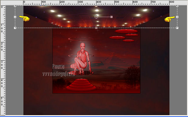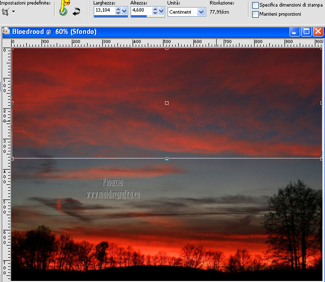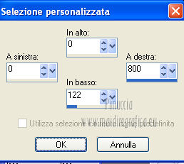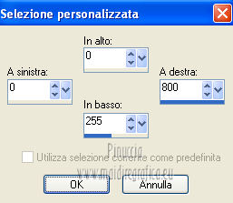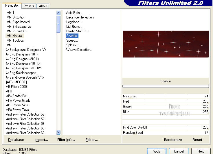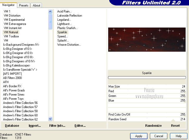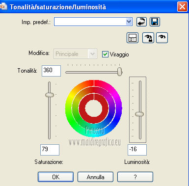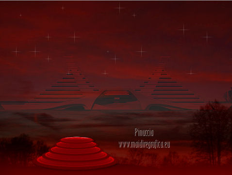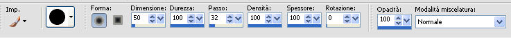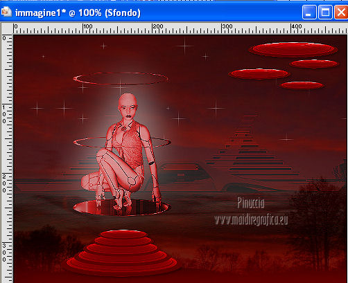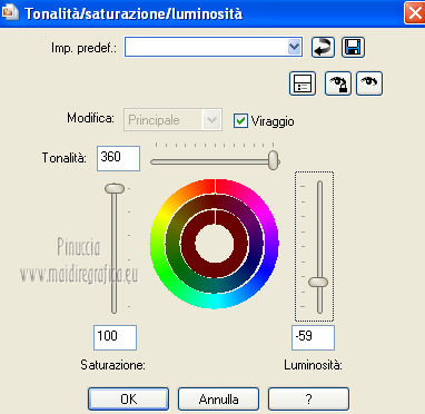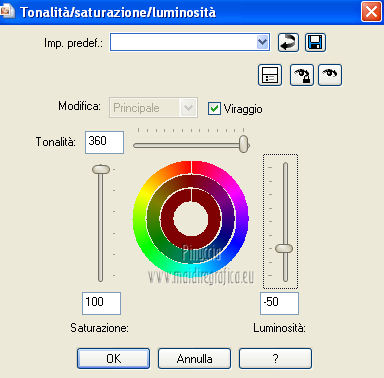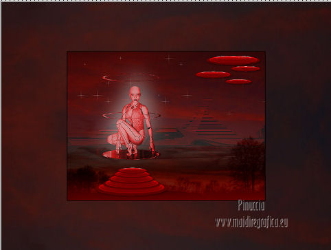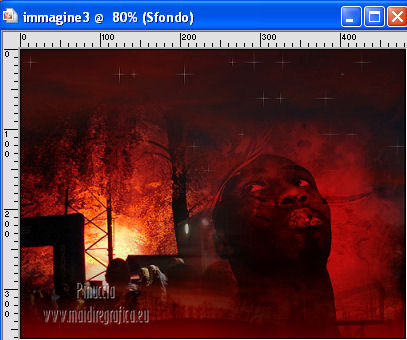 qui puoi trovare qualche risposta ai tuoi dubbi. Se l'argomento che ti interessa non è presente, ti prego di segnalarmelo. Occorrente: Materiale qui Filtri: consulta, se necessario, la mia sezione filtri qui Filters Unlimited 2.0 qui VM Natural - Sparkle qui ![]() Metti la maschera 20-20 nella cartella Maschere. Imposta il colore di primo piano con il colore nero, e il colore di sfondo con #8e0407. 1. Apri una nuova immagine trasparente 800 x 600 pixels, e riempila con il colore nero.Selezione>Seleziona tutto. Apri l'immagine Bloedrood e vai a Modifica>Copia. Torna al tuo lavoro e vai a Modifica>Incolla nella selezione. Selezione>Deseleziona. Abbassa l'opacità di questo livello al 50%. 2. Livelli>Nuovo livello raster. Attiva lo strumento Pennello con i seguenti settaggi.![]() Striscia con il tasto destro del mouse per usare il colore rosso di sfondo, sopra il bordo nero ![]() Regola>Sfocatura>Sfocatura gaussiana - raggio 40. ![]() Livelli>Unisci>Unisci tutto. Finestra>Duplica (o, sulla tastiera, maiuscola+D) - due volte, per avere due copie del lavoro. Minimizza le copie che userai più tardi. 3. Torna al tuo lavoro originale. Livelli>Nuovo livello raster. Selezione>Seleziona tutto. Apri l'immagine Cool e vai a Modifica>Copia. Torna al tuo lavoro e vai a Modifica>Incolla nella selezione. Selezione>Deseleziona. Regola>Tonalità e saturazione>Tonalità/Saturazione/Luminosità. ![]() Abbassa l'opacità di questo livello al 30%. Effetti>Effetti di bordo>Aumenta. Livelli>Unisci>Unisci tutto. 4. Apri il tube Benice 29.1 e vai a Modifica>Copia. Torna al tuo lavoro e vai a Modifica>Incolla come nuovo livello. Sposta il tube in basso a sinistra.![]() Effetti>Effetti 3D>Sfalsa ombra, con il colore nero. ![]() 5. Apri il tube Calguisorbit14190 e vai a Modifica>Copia. Torna al tuo lavoro e vai a Modifica>Incolla come nuovo livello. Immagine>Ridimensiona, al 40%, tutti i livelli non selezionato. Regola>Tonalità e saturazione>Viraggio ![]() Sposta il tube sopra il tube precedente.Livelli>Duplica. Attiva il livello sottostante dell'originale. Regola>Sfocatura>Sfocatura gaussiana - raggio 40. Abbassa l'opacità di questo livello al 60%. Sposta la sfocatura un po' più in alto.Livelli>Duplica. Sposta questa sfocatura un po' più in basso.![]() Livelli>Unisci>Unisci giù. Attiva il livello superiore. Regola>Tonalità e saturazione>Tonalità/Saturazione/Luminosità. ![]() Regola>Messa a fuoco>Metti a fuoco. Abbassa l'opacità di questo livello a tuo piacimento. 6. Apri il tube Benice29.2 e vai a Modifica>Copia. Torna al tuo lavoro e vai a Modifica>Incolla come nuovo livello. Immagine>Ridimensiona, al 40%, tutti i livelli non selezionato. Regola>Messa a fuoco>Metti a fuoco. Sposta il tube in alto a destra.Livelli>Duplica. Immagine>Ridimensiona, al 70%, tutti i livelli non selezionato. Livelli>Duplica. Immagine>Ridimensiona, all'80%, tutti i livelli non selezionato. Livelli>Duplica. Immagine>Ridimensiona, al 90%, tutti i livelli non selezionato. Posiziona i tubes come nell'esempio.![]() Assicurati di essere posizionato sul livello superiore. Livelli>Unisci>Unisci giù - 3 volte. Effetti>Effetti 3D>Sfalsa ombra, con il colore nero. ![]() 7. Attiva il livello inferiore. Attiva lo strumento Selezione ,clicca sull'icona Selezione personalizzata ![]() e imposta i seguenti settaggi: ![]() Selezione>Innalza selezione a livello. Effetti>Plugins>Filters Unlimited 2.0 - VM Natural - Sparkle. ![]() Selezione>Deseleziona. Abbassa l'opacità di questo livello al 30%. Immagine>Aggiungi bordatura, 2 pixels, simmetriche, con il colore nero. Immagine>Ridimensiona, al 60%, tutti i livelli selezionato. Regola>Messa a fuoco>Metti a fuoco. Salva l'immagine con il nome "immagine 1" e minimizzala. ![]() 8. Attiva uno dei duplicati che hai minimizzato al punto 2. ![]() Livelli>Duplica. Selezione personalizzata come al punto 7.![]() Effetti>Plugins>Filters Unlimited 2.0 - VM Natural - Sparkle ![]() Abbassa l'opacità di questo livello al 30%. Selezione>Deseleziona. 9. Apri il tube Marif_2006_septembre_misted_paysage18 e vai a Modifica>Copia. Torna al tuo lavoro e vai a Modifica>Incolla come nuovo livello. Immagine>Rifletti. Immagine>Ridimensiona, al 115%, tutti i livelli non selezionato. Regola>Tonalità e saturazione>Tonalità/Saturazione/Luminosità. ![]() Sposta il tube in basso a sinistra.10. Apri il tube Marif_2006_misted_paysage10 e vai a Modifica>Copia. Torna al tuo lavoro e vai a Modifica>Incolla come nuovo livello. Sposta questo tube nell'angolo in alto a destra.11. Apri il tube Mou_mentalist e vai a Modifica>Copia. Torna al tuo lavoro e vai a Modifica>Incolla come nuovo livello. Regola>Tonalità e saturazione>Tonalità/Saturazione/Luminosità. ![]() Sposta in basso, in modo che l'uomo si trovi al centro.Immagine>Aggiungi bordatura, 2 pixels, simmetriche, con il colore nero. Immagine>Ridimensiona, al 60%, tutti i livelli selezionato. Regola>Messa a fuoco>Metti a fuoco. Salva l'immagine con il nome "immagine 2" e minimizzala. ![]() 12. Attiva il secondo duplicato che hai minimizzato al punto 2. Livelli>Duplica. Selezione personalizzata come al punto 7.![]() Effetti>Plugins>Filters Unlimited 2.0 - VM Natural - Sparkle ![]() Abbassa l'opacità di questo livello al 30%. Selezione>Deseleziona. 13. Apri l'immagine vuur. Livelli>Carica/Salva maschera>Carica maschera da disco. Cerca e carica la maschera 20-20. ![]() Livelli>Unisci>Unisci gruppo. Di nuovo Livelli>Carica/Salva maschera>Carica maschera da disco. Carica la maschera 20-20, con gli stessi settaggi. Livelli>Unisci>Unisci gruppo. Modifica>Copia. Torna al tuo lavoro e vai a Modifica>Incolla come nuovo livello. Immagine>Ridimensiona, al 130%, tutti i livelli non selezionato. Sposta il tube a sinistra, sul bordo inferiore.Livelli>Duplica. Livelli>Unisci>Unisci giù. 14. Apri il tube Man e vai a Modifica>Copia. Torna al tuo lavoro e vai a Modifica>Incolla come nuovo livello. Regola>Tonalità e saturazione>Tonalità/Saturazione>Luminosità. ![]() Sposta il tube in basso a de