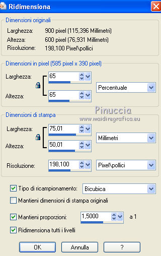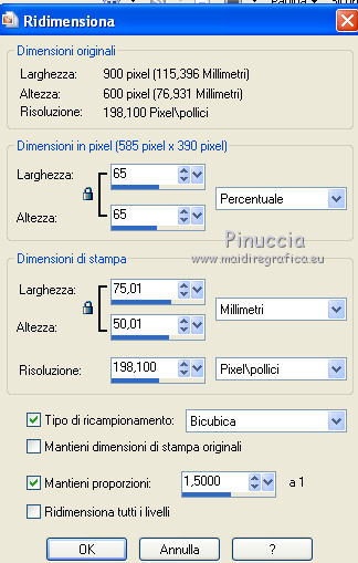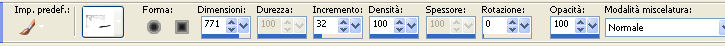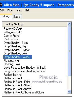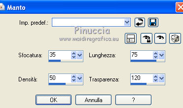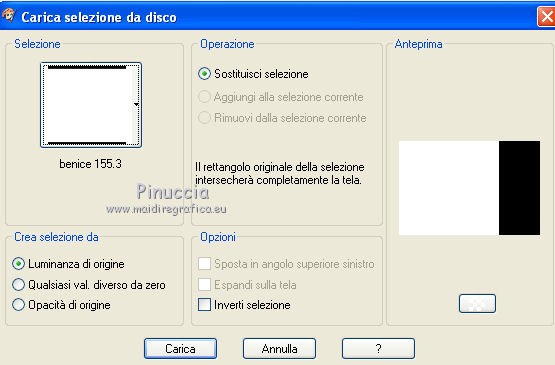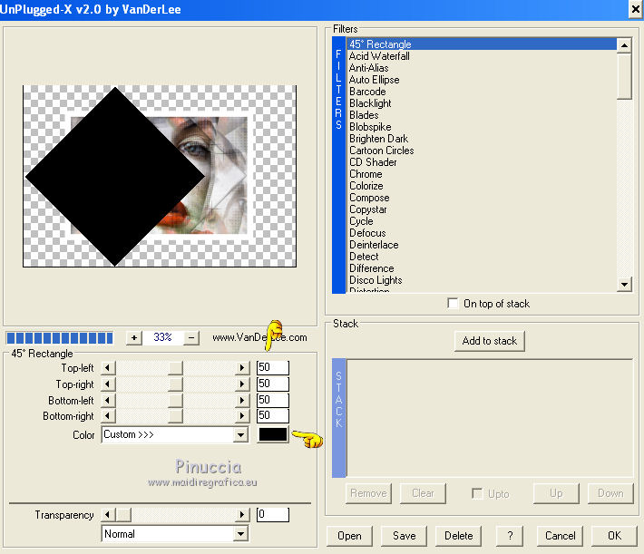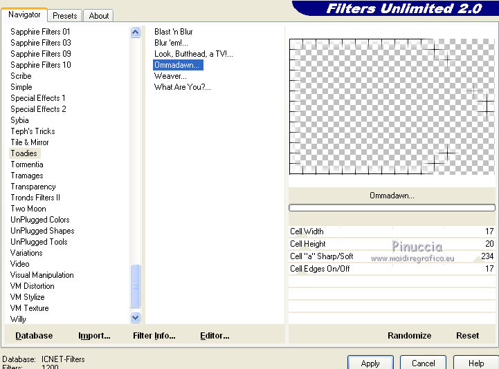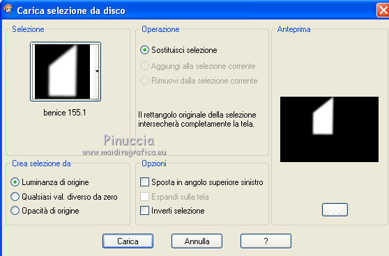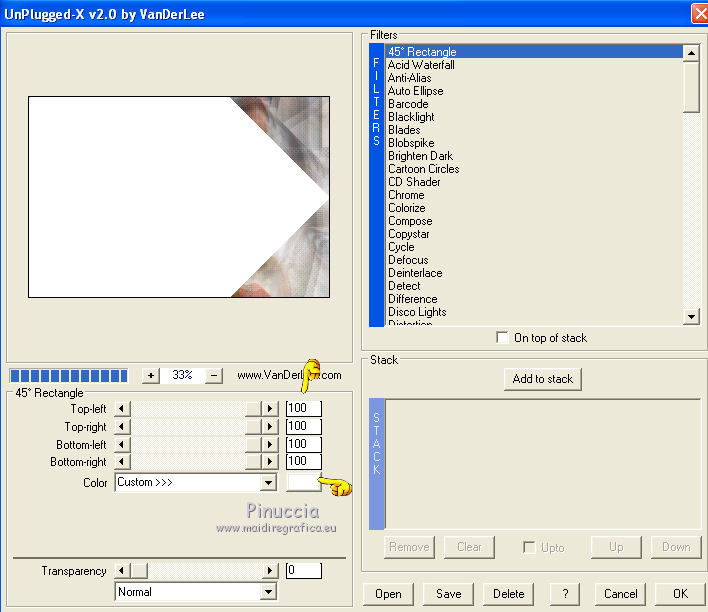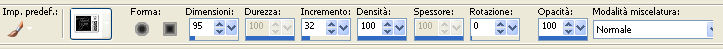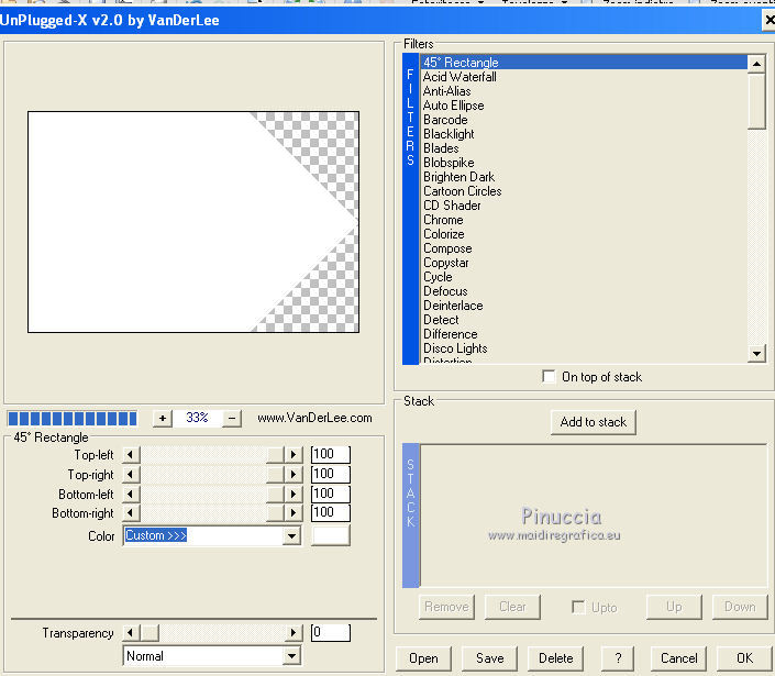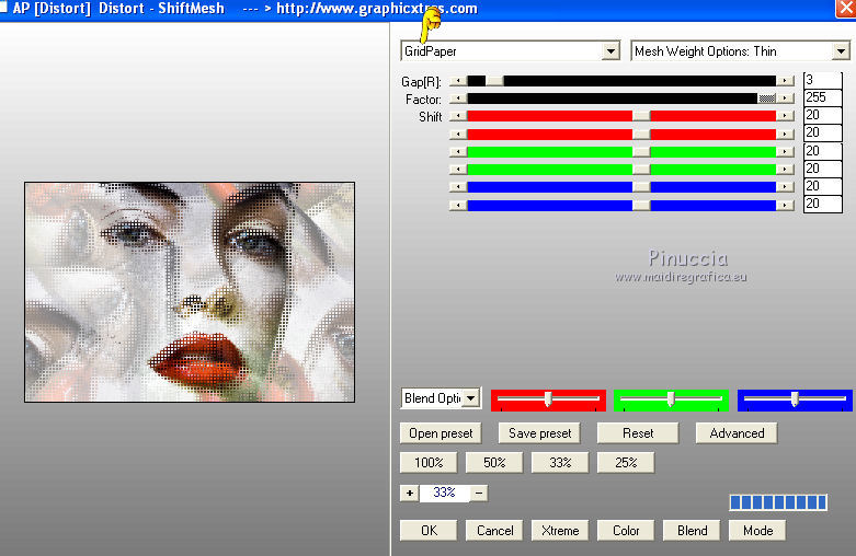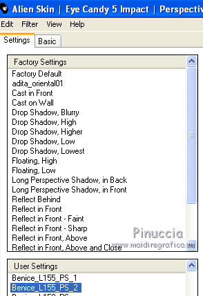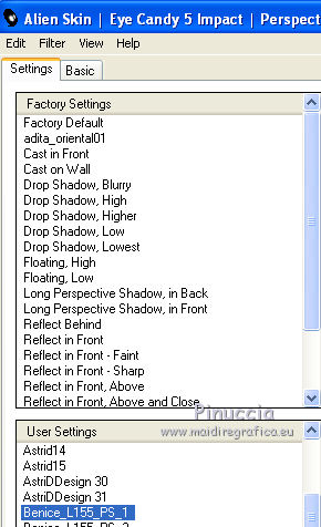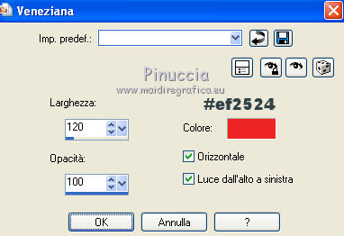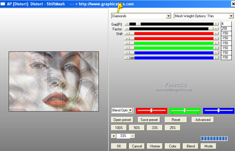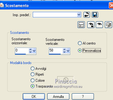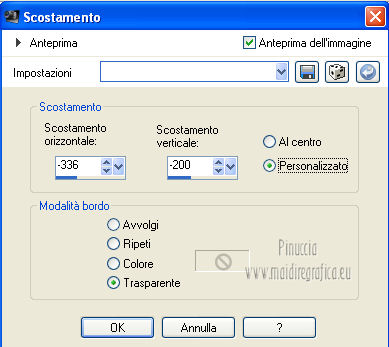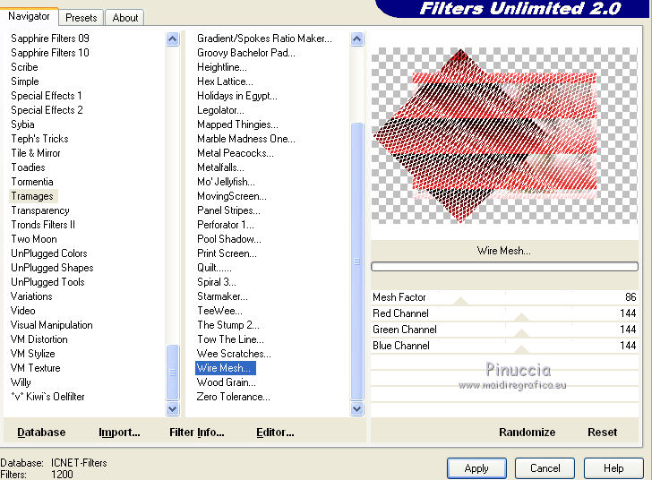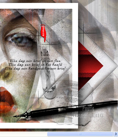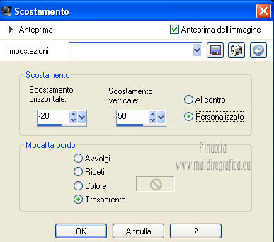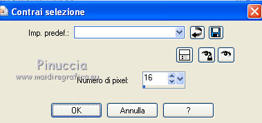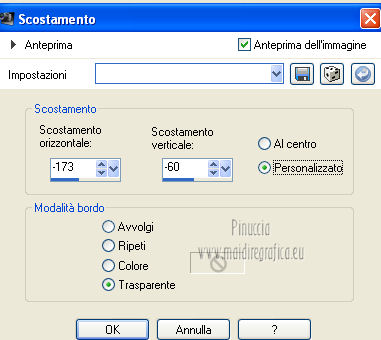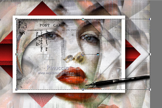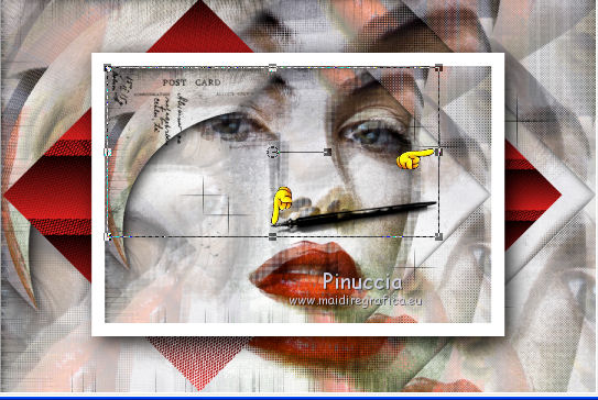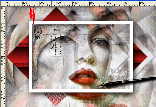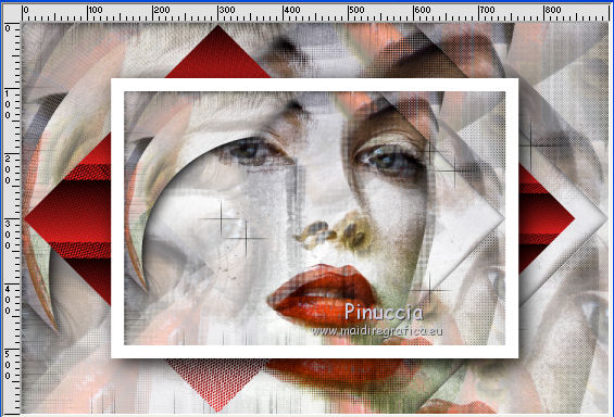 qui puoi trovare qualche risposta ai tuoi dubbi. Se l'argomento che ti interessa non è presente, ti prego di segnalarmelo. Occorrente: Materiale qui Filtri: consulta, se necessario, la mia sezione filtri qui AP 01 Innovations and Idea qui Filters Unlimited 2.0 qui Toadies qui Tramage qui Alien Skin Eye Candy 5 Impact qui VanDerLee Unplugged-X qui I filtri Toadies e Tramages si possono usare importandoli in Filters Unlimited, ma possono funzionare anche da soli ![]() Metti i preset Benice_L155_PS_1 e Benice_L155_PS_2 nella cartella del filtro Alien Skin Eye Candy 5 Impact>Settings>Shadow. Cliccando sul file il preset sarà automaticamente installato nella cartella corretta. Metti i pennelli nella cartella Pennelli. Attenzione, ogni pennello è composto da due files che non devono essere separati. Vedi gli appunti sui pennelli qui Metti le selezioni nella cartella Selezioni. Imposta il colore di primo piano con il colore nero #000000. 1. Apri l'immagine BG_L155. Finestra>Duplica (o, sulla tastiera, maiuscola+D) per fare una copia. Chiudi l'originale. La copia sarà la base del tuo lavoro. 2. Livelli>Duplica. Chiudi questo livello e attiva il livello sottostante dell'originale. Effetti>Plugins>AP [Distort] - Distort-ShiftMesh. ![]() 3. Apri e attiva il livello superiore. Effetti>Plugins>AP [Distort] - Distort-ShiftMesh. ![]() Effetti>Plugins>VanDerLee - Unplugged-X seleziona 45° Rectangle - Color: #ffffff. ![]() Attiva lo strumento Bacchetta magica ![]() ![]() Clicca sullo spazio bianco per selezionarlo. ![]() Premi sulla tastiera il tasto CANC. Selezione>Deseleziona. Effetti>Plugins>Alien Skin Eye Candy 5 Impact - Perspective Shadow. Seleziona il preset Benice_L155_PS_1 e ok. ![]() 4. Livelli>Duplica. Immagine>Rifletti. Effetti>Effetti di distorsione>Coordinate polari. ![]() Selezione>Carica/Salva selezione>Carica selezione da disco. Cerca e carica la selezione Benice 155.1. ![]() Premi sulla tastiera il tasto CANC. Selezione>Deseleziona. Immagine>Ridimensiona - 100% x 120%, tutti i livelli e mantieni proporzioni non selezionato. ![]() Effetti>Effetti di immagine>Scostamento. ![]() Effetti>Plugins>Alien Skin Eye Candy 5 Impact - Perspective Shadow. Seleziona il preset Benice_L155_PS_2 e ok. ![]() 5. Livelli>Nuovo livello raster. Effetti>Plugins>VanDerLee - Unplugged-X - 45° Rectangle. ![]() 6. Seleziona la parte bianca con la bacchetta magica , con i precedenti settaggi:![]() Selezione>Modifica>Contrai - 16 pixels. ![]() Premi sulla tastiera il tasto CANC. Selezione>Deseleziona. Effetti>Plugins>Filters Unlimited 2.0 - Toadies - Ommadawn. ![]() Cambia la modalità di miscelatura di questo livello in Moltiplica. 6. Livelli>Duplica. Chiudi il livello sottostante dell'originale, e rimani posizionato sul livello superiore. Selezione>Carica/Salva selezione>Carica selezione da disco. Cerca e carica la selezione Benice 155.2. ![]() Premi sulla tastiera il tasto CANC. Selezione>Deseleziona. Immagine>Rifletti. Immagine>Capovolgi. Effetti>Effetti di immagine>Scostamento. ![]() 7. Apri e attiva il livello sottostante Raster 1. Selezione>Carica/Salva selezione>Carica selezione da disco. Cerca e carica la selezione Benice 155.3. ![]() Effetti>Effetti di trama>Manto. ![]() Selezione>Deseleziona. Livelli>Unisci>Unisci visibile. Dovresti avere questo. ![]() 8. Finestra>Duplica (o maiuscola+D) e continua su questo duplicato. Immagine>Ridimensiona, al 65%, tutti i livelli selezionato. ![]() Immagine>Aggiungi bordatura, 20 pixels, simmetriche, con il colore bianco #ffffff. Modifica>Copia. Attiva il tuo lavoro originale e vai a Modifica>Incolla come nuovo livello. E continua su questo lavoro. Livelli>Duplica. Chiudi questo livello e attiva il livello centrale - Raster 1. Effetti>Plugins>VanDerLee - Unplugged-X 45° Rectangle, con i seguenti settaggi Color: nero #000000. ![]() Effetti>Effetti di trama>Veneziana - colore #ef2524. ![]() Effetti>Plugins>Filters Unlimited 2.0 - Tramages - Wire Mesh. ![]() 10. Apri e attiva il livello superiore. Selezione>Seleziona tutto. Selezione>Mobile. Selezione>Immobilizza. Chiudi nuovamente il livello superiore. Attiva il livello centrale - raster 1. Premi sulla tastiera il tasto CANC. Selezione>Deseleziona. 11. Livelli>Duplica. Immagine>Ridimensiona, al 65%, tutti i livelli non selezionato. ![]() Immagine>Rifletti. Effetti>Effetti di immagine>Scostamento. ![]() 12. Apri e attiva il livello superiore. Effetti>Plugins>Alien Skin Eye Candy 5 Impact - Perspective Shadow. Seleziona il preset Drop Shadow Lowest e ok. ![]() Livelli>Unisci>Unisci visibile. Dovresti avere questo. ![]() 13. Livelli>Nuovo livello raster. Attiva lo strumento Pennello ![]() cerca e seleziona il pennello Benice_L155_postcard. ![]() Ingrandisci l'immagine attivando lo strumento Zoom o usando la rotellina del mouse,e applica il pennello in alto all'interno del bordo bianco, cliccando con il tasto sinistro del mouse per usare il colore di primo piano. ![]() Se il tuo PSP, non supporta pennelli superiori a 500 pixels, troverai la dimensione del pennello impostata a 32. ![]() Imposta la dimensione massima di 500 pixels, ![]() e, dopo aver applicato il pennello, premi il tasto D per attivare lo strumento Deformazione ![]() e, in modalità Scala, usa i nodi centrali ![]() per allargare il pennello come nell'esempio. ![]() 14. Apri il tube Benice_L155_brief e vai a Modifica>Copia. Torna al tuo lavoro e vai a Modifica>Incolla come nuovo livello. Effetti>Effetti di immagine>Scostamento. ![]() Abbassa l'opacità di questo livello al 75%. 15. Livelli>Nuovo livello raster. Attiva nuovamente lo strumento Pennello ![]() cerca e seleziona il pennello Benice_L155_fles. ![]() e applicalo nel riquadro centrale, cliccando con il tasto sinistro del mouse per usare il colore di primo piano. ![]() 16. Apri il tube Benice_L155_misted_deco e vai a Modifica>Copia. Torna al tuo lavoro e vai a Modifica>Incolla come nuovo livello. Effetti>Effetti di immagine>Scostamento. ![]() 17. Livelli>Nuovo livello raster. Attiva ancora lo stru