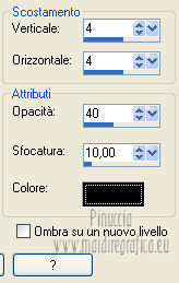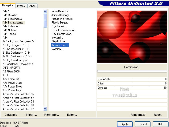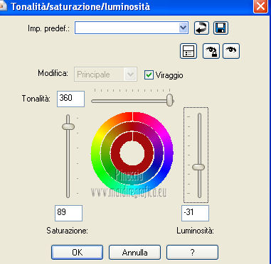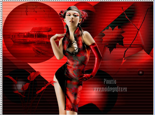 qui puoi trovare qualche risposta ai tuoi dubbi. Se l'argomento che ti interessa non è presente, ti prego di segnalarmelo. Occorrente: Materiale qui Filtri: consulta, se necessario, la mia sezione filtri qui Filters Unlimited 2.0 qui Colors (da importare in Unlimited) qui VM Extravaganza qui Transparency - Eliminate White qui VM Natural qui I filtri VM Extravaganza, VM Natural e Transparency si possono usare da soli o importati in Filters Unlimited. ![]() Metti la maschera 20-20 nella cartella Maschere. Metti la selezione nella cartella Selezioni. Imposta il colore di primo piano con #ff201b, e il colore di sfondo con il colore nero #000000. 1. Apri una nuova immagine trasparente 800 x 600 pixels. Selezione>Seleziona tutto. Apri l'immagine Abstract_500 e vai a Modifica>Copia. Torna al tuo lavoro e vai a Modifica>Incolla nella selezione. Selezione>Deseleziona. Effetti>Plugins>Filters Unlimited 2.0 - Colors - Chrome. ![]() Effetti>Plugins>Filters Unlimited 2.0 - VM Natural - Acid Rain. ![]() Effetti>Plugins>Filters Unlimited 2.0 - VM Extravaganza - Transmission. ![]() 2. Apri il tube KTs_Japan_Digital_Landscape05 e vai a Modifica>Copia. Torna al tuo lavoro e vai a Modifica>Incolla come nuovo livello. Immagine>Ridimensiona, al 75%, tutti i livelli non selezionato. Regola>Tonalità e saturazione>Tonalità/Saturazione/Luminosità. ![]() Sposta il tube nel cerchio in alto a sinistra.![]() Regola>Messa a fuoco>Metti a fuoco. Selezione>Carica/Salva selezione>Carica selezione da disco. Cerca e carica la selezione Bernice 22. ![]() Selezione>Inverti. Premi sulla tastiera il tasto CANC. Selezione>Deseleziona. Cambia la modalità di miscelatura di questo livello in Moltiplica. 3. Apri l'immagine Vaas. Su questo tube: Livelli>Carica/Salva maschera>Carica maschera da disco. Cerca e carica la maschera 20-20. ![]() Livelli>Unisci>Unisci gruppo. Di nuovo Livelli>Carica/Salva maschera>Carica maschera da disco. Carica nuovamente la maschera 20-20. Livelli>Unisci>Unisci gruppo. Modifica>Copia. Torna al tuo lavoro e vai a Modifica>Incolla come nuovo livello. Immagine>Ridimensiona, al 90%, tutti i livelli non selezionato. Regola>Tonalità e saturazione>Tonalità/Saturazione/Luminosità, come al punto 2. ![]() Sposta il tube a destra.Regola>Messa a fuoco>Metti a fuoco. Cambia la modalità di miscelatura di questo livello in Differenza. 4. Apri il tube Rosy-Ikebana-L Farinelli4 e vai a Modifica>Copia. Torna al tuo lavoro e vai a Modifica>Incolla come nuovo livello. Immagine>Ridimensiona, al 35%, tutti i livelli non selezionato. Regola>Tonalità e saturazione>Tonalità/Saturazione/Luminosità. ![]() Sposta il tube in basso a sinistra,in modo che siano visibili soltanto i fiori. ![]() Regola>Messa a fuoco>Metti a fuoco. Effetti>Effetti 3D>Sfalsa ombra, con il colore nero. ![]() 5. Apri il tube Asiatique (2) e vai a Modifica>Copia. Torna al tuo lavoro e vai a Modifica>Incolla come nuovo livello. Immagine>Ridimensiona, al 75%, tutti i livelli non selezionato. Regola>Messa a fuoco>Metti a fuoco. Regola>Luminosità e contrasto>Luminosità e contrasto. ![]() Sposta il tube al centro.Livelli>Disponi>Sposta giù. ![]() Effetti>Effetti 3D>Sfalsa ombra, con il colore nero. ![]() 6. Apri l'immagine Logo-the-rising-sun. Su questa immagine: Livelli>Innalza livello di sfondo. Effetti>Plugins>Tranparency - Eliminate White. Modifica>Copia. Torna al tuo lavoro e vai a Modifica>Incolla come nuovo livello. Regola>Tonalità e saturazione>Tonalità/Saturazione/Luminosità, come al punto 2. ![]() Sposta il tube in basso a destra.Livelli>Unisci>Unisci tutto. 7. Imposta il colore di primo piano con #210c0b. Immagine>Aggiungi bordatura, 2 pixels, simmetriche, con il colore nero. Immagine>Aggiungi bordatura, 30 pixels, simmetriche, con il colore bianco. Immagine>Aggiungi bordatura, 2 pixels, simmetriche, con il colore nero. Seleziona il bordo bianco con la bacchetta magica ![]() e riempilo con il colore di primo piano.Effetti>Effetti di trama>Veneziana. ![]() Regola>Messa a fuoco>Accentua messa a fuoco. Selezione>Deseleziona. Aggiungi il tuo nome e/o il tuo watermark e salva in formato jpg. ![]() Le vostre versioni. Grazie ![]() Thafs ![]() Se hai problemi o dubbi, o trovi un link non funzionante, o anche soltanto per un saluto, scrivimi 4 Novembre 2012 |