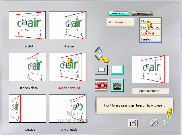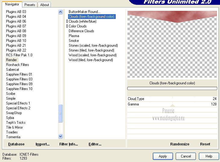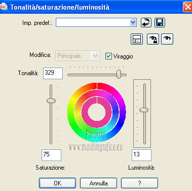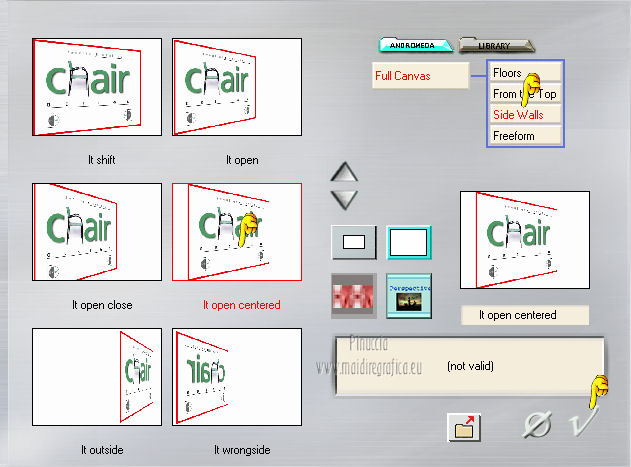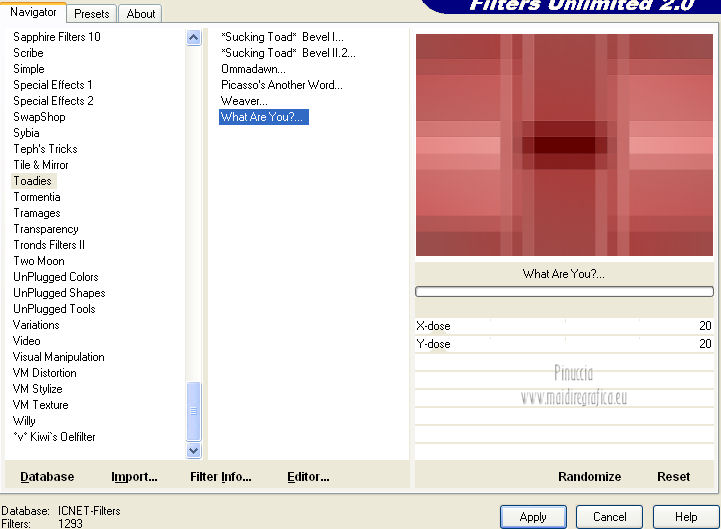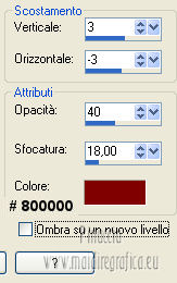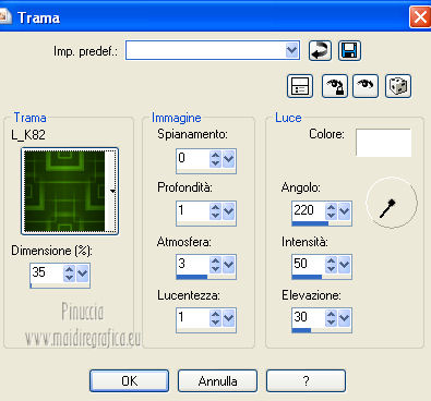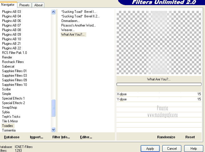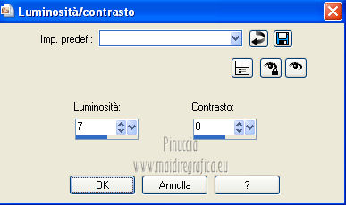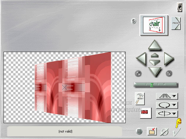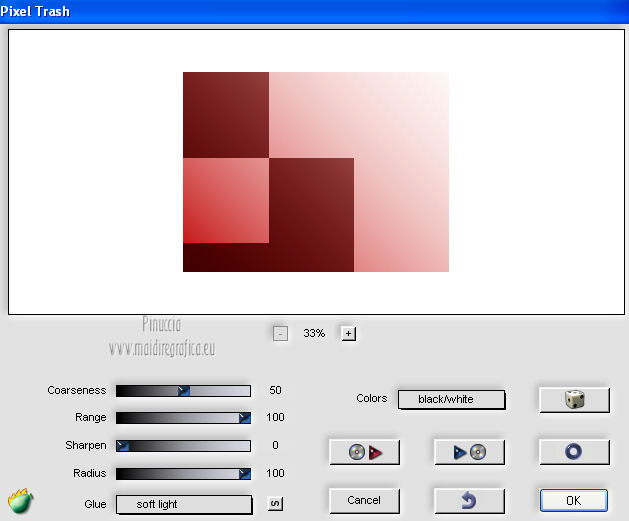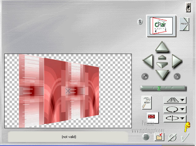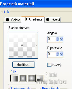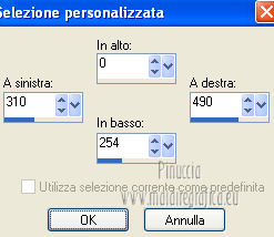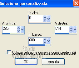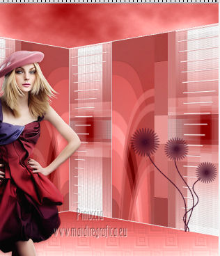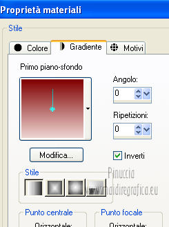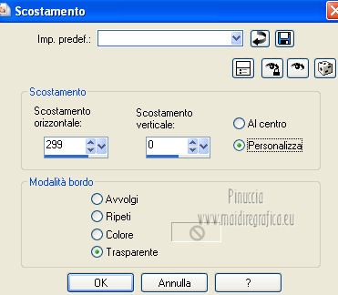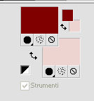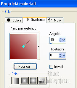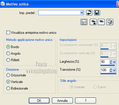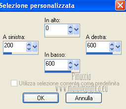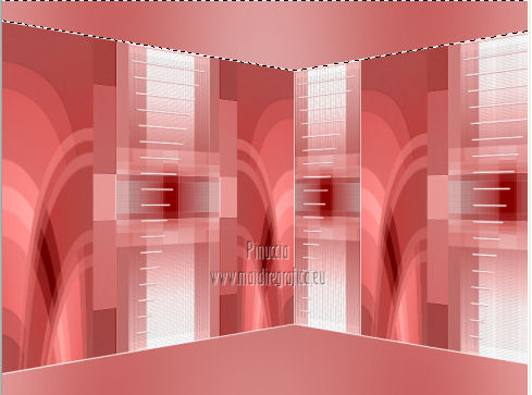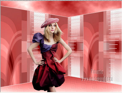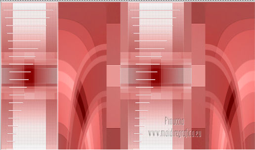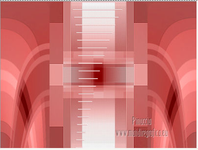 qui puoi trovare qualche risposta ai tuoi dubbi. Se l'argomento che ti interessa non è presente, ti prego di segnalarmelo. Occorrente: Materiale qui Filtri: consulta, se necessario, la mia sezione filtri qui Filters Unlimited 2.0 qui Andromeda - Perspective qui Flaming Pear - Pixel Trash qui Toadies qui I filtri Toadies si possono usare da soli, o importati in Filters Unlimited. Come importare un filtro in Unlimited qui ![]() Metti la trama L_K82 nella cartella Trame. Il gradiente Vervaging wit corrisponde al gradiente Bianco sfumato, standard in PSP. Se non lo trovi nel tuo PSP, metti quello fornito nella cartella Gradienti. Imposta il colore di primo piano con #800000, e il colore di sfondo con #edd4d1. ![]() Passa il colore di primo piano a Gradiente, stile Lineare. ![]() 1. Apri una nuova immagine trasparente 800 x 600 pixels, e riempila con il gradiente.Effetti>Plugins>Flaming Pear - Pixel Trash. Livelli>Duplica. Immagine>Rifletti. Abbassa l'opacità di questo livello al 40%. Livelli>Unisci>Unisci giù. 2. Livelli>Duplica. Immagine>Rifletti. Immagine>Capovolgi. Abbassa l'opacità di questo livello al 50%. Livelli>Unisci>Unisci giù. 3. Livelli>Duplica. Cambia la modalità di miscelatura di questo livello in Rafforza e abbassa l'opacità al 40%. Livelli>Unisci>Unisci giù. Effetti>Effetti di bordo>Aumenta. 4. Livelli>Duplica. Effetti>Plugins>Filters Unlimited 2.0 - Toadies > What Are You?. ![]() Immagine>Ridimensiona, al 50%, tutti i livelli non selezionato. Chiudi il livello inferiore per visualizzare meglio la prossima mossa. Sposta il livello superiore,nell'angolo in alto a sinistra. ![]() Riapri il livello inferiore, rimanendo posizionato sul livello superiore. Effetti>Effetti di distorsione>Coordinate polari. ![]() Livelli>Duplica. Immagine>Rifletti. Livelli>Unisci>Unisci giù. Livelli>Duplica. Cambia la modalità di miscelatura di questo livello in Indebolisci, e abbassa l'opacità al 18%. 5. Cambia il gradiente e imposta il gradiente Bianco sfumato, stile Lineare. ![]() Livelli>Nuovo livello raster. Attiva lo strumento Selezione ,clicca sull'icona Selezione personalizzata ![]() e imposta i seguenti settaggi: ![]() Riempi la selezione con il gradiente bianco sfumato.Effetti>Effetti di trama>Intessitura. ![]() Selezione>Deseleziona. Livelli>Duplica. Immagine>Capovolgi. Livelli>Unisci>Unisci giù. Effetti>Plugins>Filters Unlimited - Toadies > What Are You? ![]() Livelli>Duplica. Cambia la modalità di miscelatura di questo livello in Indebolisci, e abbassa l'opacità al 33%. Effetti>Effetti di bordo>Aumenta. Livelli>Unisci>Unisci visibile. 6. Selezione personalizzata ![]() ![]() Selezione>Innalza selezione a livello. Selezione>Deseleziona. Immagine>Ruota per gradi - 90 gradi a sinistra. ![]() Immagine>Ridimensiona, al 48%, tutti i livelli non selezionato. Cambia la modalità di miscelatura di questo livello in Filtra, e abbassa l'opacità al 60%. 7. Apri il tube Benice lijnen e vai a Modifica>Copia. Torna al tuo lavoro e vai a Modifica>Incolla come nuovo livello. Lascialo come sta. Effetti>Effetti 3D>Sfalsa ombra, con il colore #d16e6e. ![]() Livelli>Unisci>Unisci tutto. Finestra>Duplica (o, sulla tastiera maiuscola+D) per fare una copia. Minimizza il duplicato e torna al tuo lavoro originale. 8. Immagine>Aggiungi bordatura, 2 pixels, simmetriche, con il colore bianco #ffffff. Minimizza l'immagine. 9. Attiva il duplicato del punto 7. ![]() Selezione personalizzata ![]() ![]() Selezione>Innalza selezione a livello. Selezione>Deseleziona. Copia il livello superiore: Modifica>Copia. Minimizza l'immagine. 10. Apri una nuova immagine trasparente 229 x 600 pixels. Modifica>Incolla come nuovo livello. Livelli>Unisci>Unisci tutto. Immagine>Aggiungi bordatura, 2 pixels, simmetriche, con il colore bianco #ffffff. Minimizza l'immagine per il momento. Puoi chiudere il duplicato perchè non ti serve più. 11. Attiva l'immagine originale del punto 8 (800 x 600 con il bordo bianco). ![]() Modifica>Copia e minimizza l'immagine che ti servirà ancora. Apri una nuova immagine trasparente 1031 x 604 pixels. Modifica>Incolla come nuovo livello. Effetti>Effetti di immagine>Scostamento. ![]() Attiva la piccola immagine del punto 10. ![]() Modifica>Copia. Torna all'immagine 1031 x 604 e vai a Modifica>Incolla come nuovo livello. Effetti>Effetti di immagine>Scostamento. ![]() Livelli>Unisci>Unisci tutto. ![]() Modifica>Copia e minimizza l'immagine. 12. Attiva l'originale del punto 8 (800x600). Modifica>Incolla come nuovo livello Efftti>Plugins>Andromeda - Perspective Shadow, clicca sull'icona Presets ![]() e imposta i seguenti settaggi: Side Walls - It open centered, e clicca sul segno di spunta in basso a destra per confermare. ![]() Di nuovo clicca sul segno di spunta per chiudere la finestra del filtro. ![]() Effetti>Effetti di immagine>Scostamento. ![]() Attiva nuovamente l'immagine 1031 x 640. Modifica>Copia. Torna al lavoro originale 800 x 600 e vai a Modifica>Incolla come nuovo livello. Effetti>Plugins>Andromeda - Perspective seleziona Side Wall e rt open centered (per cercare l'opzione usa la freccia a destra della finestra di anteprima). ![]() Di nuovo clicca sul segno di spunta per chiudere. ![]() Effetti>Effetti di immagine>Scostamento. ![]() Livelli>Unisci>Unisci giù. Dovresti avere questo. ![]() 13. Attiva il livello inferiore. Effetti>Effetti di immagine>Motivo unico. ![]() Regola>Sfocatura>Sfocatura gaussiana - raggio 100. ![]() 14. Attiva il livello superiore. Attiva lo strumento Bacchetta magica ![]() e clicca sullo spazio trasparente in alto. ![]() Attiva il livello inferiore. Selezione>Innalza selezione a livello. Selezione>Deseleziona. Effetti>Plugins>Filters Unlimited - Render - Clouds (fore-/background color). ![]() Livelli>Duplica. Cambia la modalità di miscelatura di questo livello in Indebolisci, e abbassa l'opacità al 34%. 15. Riporta il colore di primo piano a Gradiente di primo piano-sfondo, con i seguenti settaggi. ![]() Attiva il livello superiore. Attiva nuovamente lo 