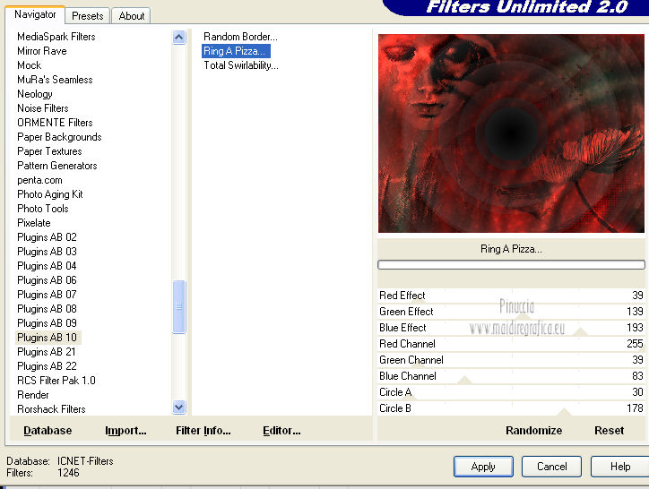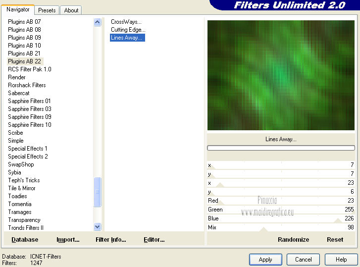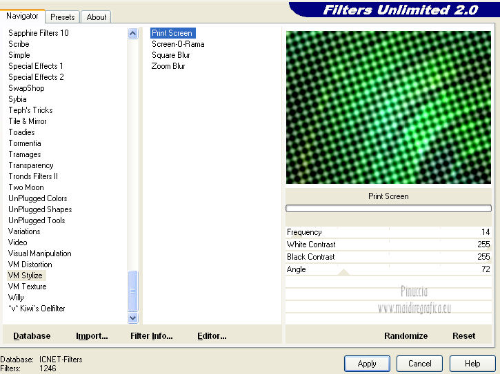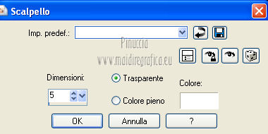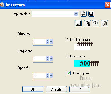 qui puoi trovare qualche risposta ai tuoi dubbi. Se l'argomento che ti interessa non è presente, ti prego di segnalarmelo. Occorrente: Materiale qui I tubes sono di Johanna e Nikita Filtri: consulta, se necessario, la mia sezione filtri qui Filters Unlimited 2.0 qui VM Stylize qui Transparency - Eliminate Black qui Plugins AB10 (da importare in Unlimited) qui Plugins AB22 (da importare in Unlimited) qui I filtri VM Stylize si possono usare da soli o importati in Filters Unlimited. Come importare un filtro in Unlimited, vedi qui ![]() Metti il preset Emboss 3 nella cartella Impostazioni predefinite. 1. Apri una nuova immagine trasparente 800 x 600 pixels. Selezione>Seleziona tutto. Apri Achtergrond L100, e vai a Modifica>Copia. Torna al tuo lavoro e vai a Modifica>Incolla nella selezione. Selezione>Deseleziona. Regola>Sfocatura>Sfocatura gaussiana - raggio 10. ![]() 2. Livelli>Nuovo livello raster. Selezione>Seleziona tutto. Apri Plaatje L100, e vai a Modifica>Copia. Torna al tuo lavoro e vai a Modifica>Incolla nella selezione. Selezione>Deseleziona. Cambia la modalità di miscelatura di questo livello in Indebolisci, e abbassa l'opacità al 50%. Livelli>Unisci>Unisci giù. 3. Livelli>Duplica. Effetti>Plugins>Filters Unlimited 2.0 - VM Stylize - Printscreen. ![]() Effetti>Plugins>Transparency - Eliminate Black. Cambia la modalità di miscelatura di questo livello in Luce netta, e abbassa l'opacità al 18%. Livelli>Unisci>Unisci giù. Finestra>Duplica (o, sulla tastiera, maiuscola+D) per fare una copia, e minimizza il duplicato che userai più tardi. 4. Torna al tuo lavoro originale. Livelli>Nuovo livello raster. Selezione>Seleziona tutto. Apri il tube NS_20_1901_10, che ha una selezione attiva. Mantieni selezionato e vai a Modifica>Copia. Torna al tuo lavoro e vai a Modifica>Incolla nella selezione. Selezione>Deseleziona. Cambia la modalità di miscelatura di questo livello in Luce diffusa, e abbassa l'opacità al 23%. 5. Apri il tube Freshemedia_gradientshapes_4 e vai a Modifica>Copia. Torna al tuo lavoro e vai a Modifica>Incolla come nuovo livello. Effetti>Effetti di immagine>Scostamento. ![]() Effetti>Effetti di trama>Intessitura. ![]() Cambia la modalità di miscelatura di questo livello in Luce diffusa. Livelli>Duplica. Effetti>Effetti di immagine>Scostamento. ![]() Livelli>Duplica. Immagine>Rifletti. Immagine>Capovolgi. 6. Apri il tube Stait_SimplePrecious e vai a Modifica>Copia. Torna al tuo lavoro e vai a Modifica>Incolla come nuovo livello. Spostalo nell'angolo in basso a sinistra.Cambia la modalità di miscelatura di questo livello in Luminanza, e abbassa l'opacità al 50%. Effetti>Filtro definito dall'utente - seleziona il preset Emboss_3 e ok. ![]() 7. Apri il tube Birds_in_the_yellow_sky_TbS e vai a Modifica>Copia. Torna al tuo lavoro e vai a Modifica>Incolla come nuovo livello. Spostalo in alto a destra.Cambia la modalità di miscelatura di questo livello in Luce diffusa, e abbassa l'opacità all'85%. Effetti>Filtro definito dall'utente - Emboss_3. 8. Apri il tube 1228507087_feerie_nikita e vai a Modifica>Copia. Torna al tuo lavoro e vai a Modifica>Incolla come nuovo livello. Immagine>Ridimensiona, all'80%, tutti i livelli non selezionato. Spostalo in alto a sinistra.Cambia la modalità di miscelatura di questo livello in Luminanza (esistente), e abbassa l'opacità al 60%. Effetti>Filtro definito dall'utente - Emboss 3. 9. Apri il tube JHanna_377 tube e vai a Modifica>Copia. Torna al tuo lavoro e vai a Modifica>Incolla come nuovo livello. Immagine>Ridimensiona, al 65%, tutti i livelli non selezionato. Spostalo in basso a destra.Cambia la modalità di miscelatura di questo livello in Luce diffusa. Effetti>Filtro definito dall'utente - Emboss 3. 10. Attiva lo strumento Selezione a mano libera , da punto a punto,e seleziona il gambo del fiore. ![]() Attiva il livello copia di Raster 3. Premi sulla tastiera il tasto CANC. Selezione>Deseleziona. 11. Livelli>Unisci>Unisci tutto. Immagine>Aggiungi bordatura, 2 pixels, simmetriche, con il colore #16382a. Livelli>Duplica. Effetti>Plugins>Filters Unlimited 2.0 - Plugins AB10 - Ring a Pizza. ![]() Cambia la modalità di miscelatura di questo livello in Luce diffusa, e abbassa l'opacità al 60%. Livelli>Unisci>Unisci tutto. Immagine>Ridimensiona, all'85%, tutti i livelli selezionato. Regola>Messa a fuoco>Metti a fuoco. Lascia il lavoro in attesa. 12. Attiva il duplicato del punto 3. ![]() Questa sarà la nuova base del tuo lavoro. Livelli>Duplica. Effetti>Plugins>Filters Unlimited 2.0 - Plugins AB10 - Ring a Pizza, come al punto 11. Cambia la modalità di miscelatura di questo livello in Luce diffusa, e abbassa l'opacità al 60%. Livelli>Unisci>Unisci giù. 13. Livelli>Duplica. Immagine>Rifletti. Immagine>Capovolgi. Abbassa l'opacità di questo livello al 50%. Livelli>Unisci>Unisci giù. Immagine>Capovolgi. Regola>Sfocatura>Sfocatura gaussiana - raggio 20. ![]() 14. Effetti>Plugins>Filters Unlimited 2.0 - Plugins AB22 - Lines Away. ![]() Effetti>Effetti di bordo>Aumenta. Livelli>Duplica. Cambia la modalità di miscelatura di questo livello in Indebolisci, e abbassa l'opacità al 50%. Livelli>Unisci>Unisci giù. Livelli>Duplica. Cambia la modalità di miscelatura di questo livello in Moltiplica, e abbassa l'opacità al 60%. 15. Attiva il lavoro originale che hai lasciato in attesa al punto 11. Modifica>Copia. Torna al duplicato e vai a Modifica>Incolla come nuovo livello. Selezione>Seleziona tutto. Selezione>Mobile. Effetti>Effetti 3D>Scalpello. ![]() Selezione>Deseleziona. Livelli>Unisci>Unisci tutto. Immagine>Aggiungi bordatura, 2 pixels, simmetriche, con il colore #36510a. Aggiungi il tuo nome e/o il tuo watermark e salva in formato jpg. ![]() Se hai problemi o dubbi, o trovi un link non funzionante, o anche soltanto per un saluto, scrivimi 4 Ottobre 2012 |