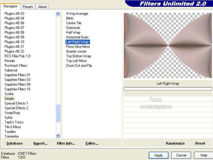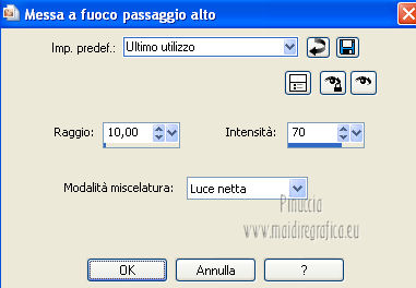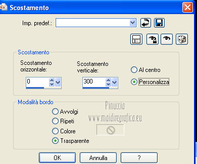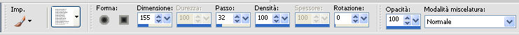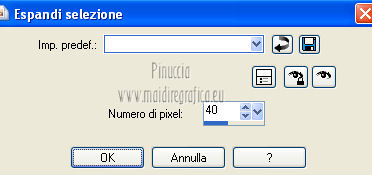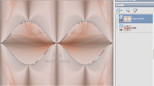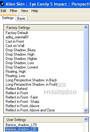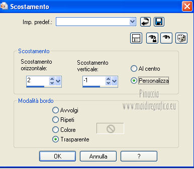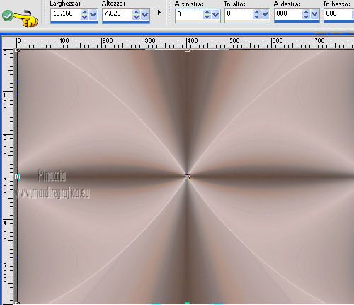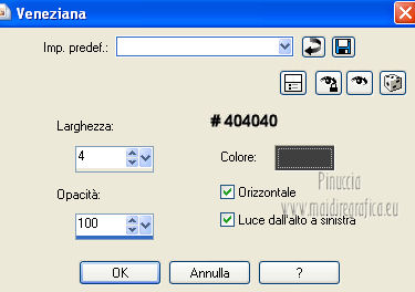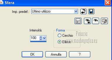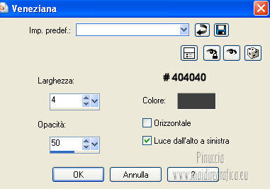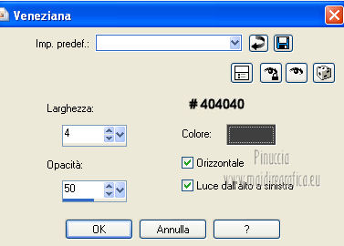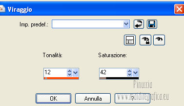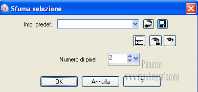 qui puoi trovare qualche risposta ai tuoi dubbi. Se l'argomento che ti interessa non è presente, ti prego di segnalarmelo. Occorrente: Materiale qui Filtri: consulta, se necessario, la mia sezione filtri qui Filters Unlimited 2.0 qui Simple - Left Right Wrap (bonus) qui Alien Skin Eye Candy 5 Impact qui I filtri Simple si possono usare da soli o importati in Filters Unlimited 2.0 ![]() Metti il preset nella cartella del filtro Alien Skin Eye Candy 5 Impact>Settings>Shadow. Cliccando sul file una o due volte (a seconda delle tue impostazioni), automaticamente il preset si installerà nella cartella corretta. Metti il pennello nella cartella Pennelli. Attenzione, il pennello è composto da due files che non devono essere separati. Vedi gli appunti sui pennelli qui Imposta il colore di primo piano con #6d564f. ![]() 1. Apri una nuova immagine trasparente 800 x 600 pixels. Selezione>Seleziona tutto. Apri l'immagine di sfondo Achtergrond Benice L82, e vai a Modifica>Copia. Torna al tuo lavoro e vai a Modifica>Incolla nella selezione. Selezione>Deseleziona. Livelli>Duplica. Immagine>Rifletti. Abbassa l'opacità di questo livello al 50%. Livelli>Unisci>Unisci giù. 2. Livelli>Duplica. Effetti>Effetti geometrici>Cerchio. ![]() Modifica>Ripeti Cerchio. Immagine>Ruota per gradi - 90 gradi a sinistra. ![]() Immagine>Ridimensiona, al 135%, tutti i livelli non selezionato. Effetti>Effetti di immagine>Scostamento. ![]() Effetti>Plugins>Filters Unlimited 2.0 - Simple > Left Right Wrap. ![]() Immagine>Ridimensiona, al 110%, tutti i livelli non selezionato. Livelli>Duplica. Immagine>Rifletti. Abbassa l'opacità di questo livello al 50%. Livelli>Unisci>Unisci giù. 3. Attiva lo strumento Ritaglio ![]() e seleziona l'intera immagine ![]() Clicca sul segno di spunta nella barra superiore per applicare il ritaglio. ![]() Premi il tasto M per deselezionare lo strumento. 4. Selezione>Seleziona tutto. Selezione>Mobile. Selezione>Modifica>Sfuma - 2 pixels. ![]() Selezione>Inverti. Premi 6 o 7 volte sulla tastiera il tasto CANC. Selezione>Deseleziona. 5. Livelli>Duplica. Effetti>Effetti geometrici>Sfera. ![]() Livelli>Unisci>Unisci visibile. 6. Livelli>Nuovo livello raster. Selezione>Seleziona tutto. Apri l'immagine Laurengary e vai a Modifica>Copia. Torna al tuo lavoro e vai a Modifica>Incolla nella selezione. Selezione>Deseleziona. Regola>Tonalità e saturazione>Tonalità/Saturazione/Luminosità. ![]() Livelli>Duplica. Immagine>Rifletti. Abbassa l'opacità di questo livello al 50%. Livelli>Unisci>Unisci giù. Abbassa l'opacità di questo livello al 39%. Livelli>Unisci>Unisci visibile. Regola>Messa a fuoco>Messa a fuoco passaggio alto. ![]() 7. Livelli>Duplica. Effetti>Effetti geometrici>Cerchio. ![]() Effetti>Effetti di distorsione>Coordinate polari. ![]() Effetti>Effetti di immagine>Scostamento. ![]() Livelli>Duplica. Immagine>Capovolgi. Livelli>Unisci>Unisci giù. 8. Attiva lo strumento Bacchetta magica ![]() ![]() Clicca nella parte trasparente per selezionarla. ![]() Selezione>Modifica>Espandi - 40 pixels. ![]() Selezione>Inverti. Premi sulla tastiera il tasto CANC. Selezione>Deseleziona. Effetti>Effetti di trama>Veneziana. ![]() Cambia la modalità di miscelatura di questo livello in Luce diffusa. Livelli>Duplica. Riporta la modalità di miscelatura di questo livello a Normale, e abbassa l'opacità al 17%. 9. Attiva nuovamente lo strumento Bacchetta magica ![]() Clicca nella parte trasparente per selezionarla. Livelli>Nuovo livello raster. Apri il Tube mist_melizaM_16sept09 e vai a Modifica>Copia. Torna al tuo lavoro e vai a Modifica>Incolla nella selezione. Selezione>Deseleziona. Cambia la modalità di miscelatura di questo livello in Luminanza (esistente). Livelli>Unisci>Unisci visibile. 10. Apri il tube Anna em dourado e vai a Modifica>Copia. Torna al tuo lavoro e vai a Modifica>Incolla come nuovo livello. Sposta il tube sul bordo inferiore, un po' più a destra,vedi il mio esempio. Livelli>Duplica. Attiva il livello sottostante dell'originale (raster 1). Regola>Tonalità e saturazione>Viraggio. ![]() Attiva nuovamente il livello superiore. Abbassa l'opacità di questo livello al 39%. Livelli>Unisci>Unisci giù. Effetti>Plugins>Alien Skin Eye Candy 5 Impact - Perspective Shadow Seleziona il preset Benice_shadow_L82 e ok. ![]() 11. Livelli>Unisci>Unisci tutto. Immagine>Aggiungi bordatura, 2 pixels, simmetriche, con il colore #513630. Immagine>Ridimensiona, al l'80%, tutti i livelli selezionato. Regola>Messa a fuoco>Metti a fuoco. Minimizza il lavoro. 12. Apri nuovamente l'immagine di sfondo Achtergrond Benice L82, che sarà la tua nuova area di lavoro. Regola>Tonalità e saturazione>Viraggio. ![]() Regola>Sfocatura>Sfocatura gaussiana - raggio 100. ![]() Livelli>Duplica. Effetti>Effetti di trama>Veneziana. ![]() Ripeti l'Effetto Veneziana, togliendo la selezione a Orizzontale. ![]() Cambia la modalità di miscelatura di questo livello in Filtra. Effetti>Effetti di bordo>Aumenta. 13. Attiva il lavoro originale che hai minimizzato al punto 11 e vai a Modifica>Copia. Torna all'immagine di sfondo e vai a Modifica>Incolla come nuovo livello. 14. Apri il tube Calguisflamant459 e vai a Modifica>Copia. Torna al tuo lavoro e vai a Modifica>Incolla come nuovo livello. Immagine>Ridimensiona, al 70%, tutti i livelli non selezionato. Sposta il tube in alto a sinistra,come nel mio esempio. Livelli>Duplica. Attiva il livello sottostante dell'originale - Raster 2. Regola>Tonalità e saturazione>Viraggio. ![]() Attiva nuovamente il livello superiore. Abbassa l'opacità di questo livello al 50%. Livelli>Unisci>Unisci giù. Effetti>Plugins>Alien Skin Eye Candy 5 Impact - Perspective Shadow, come al punto 10. 15. Apri il tube Benice e vai a Modifica>Copia. Torna al tuo lavoro e vai a Modifica>Incolla come nuovo livello. Sposta il tube in basso a destra.16. Attiva lo strumento Pennello ![]() cerca e seleziona il pennello Benice_brush_tekst_008, con i seguenti settaggi. ![]() Livelli>Nuovo livello raster. Applica il pennello
