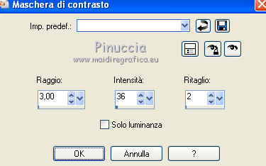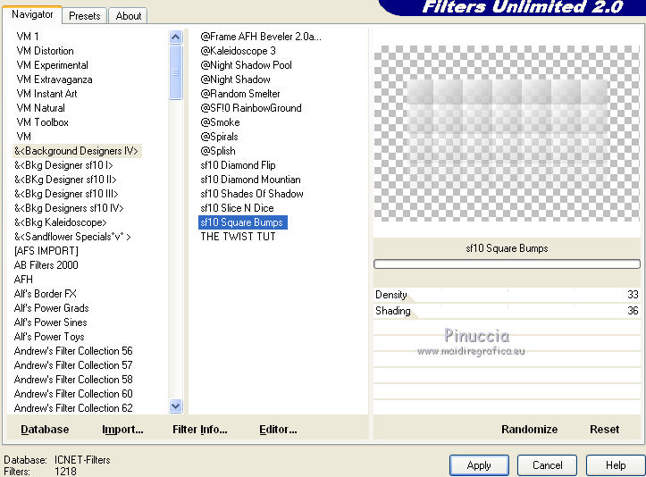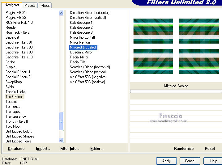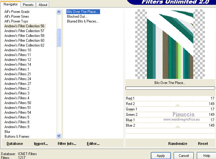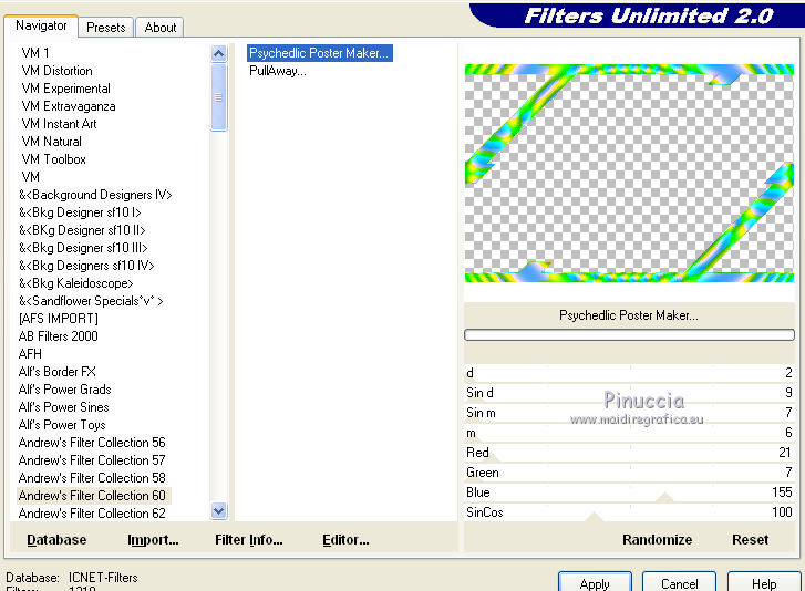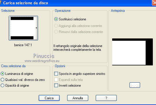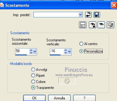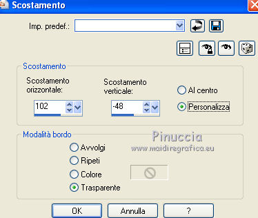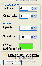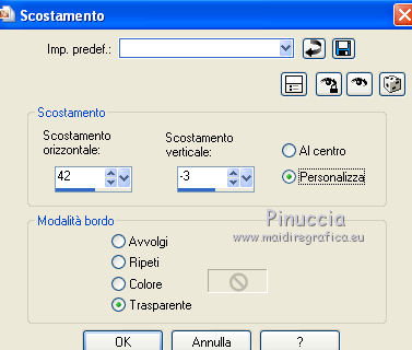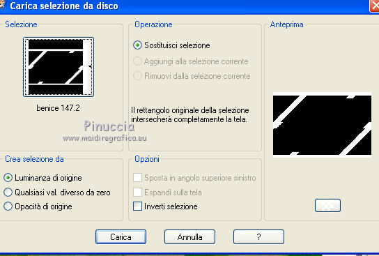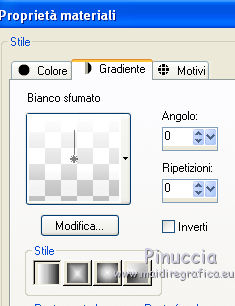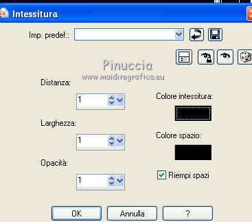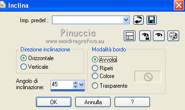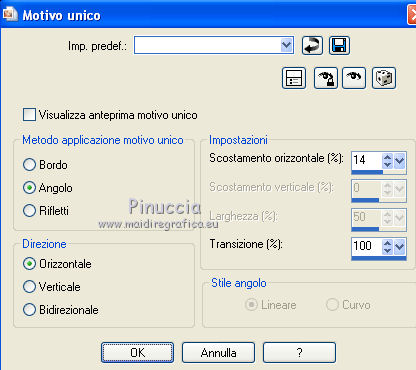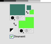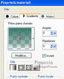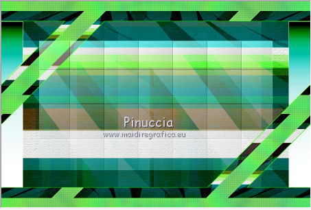 qui puoi trovare qualche risposta ai tuoi dubbi. Se l'argomento che ti interessa non è presente, ti prego di segnalarmelo. Occorrente: Materiale qui Il tube della donna è di Betsie La trama è di Cameron. Filtri: consulta, se necessario, la mia sezione filtri qui Filters Unlimited 2.0 qui &<Background Designers IV> (da importare in Unlimited) qui Andrews Filter Collection 56 qui Andrews Filter Collection 60 qui I filtri Andrew's per essere usati devono prima essere convertiti. Come fare vedi qui Si usano importandoli in Filters Unlimited (come fare vedi qui) ma possono funzionare anche da soli. I filtri forniti sono stati già convertiti. ![]() I gradienti Corel_06_026 e Corel_06_028 sono standard nelle versioni più recenti di PSP, e corrispondono ai gradiente standard delle versioni precedenti Gradiente di primo piano sfumato e Gradiente bianco sfumato. Se non li trovi nel tuo PSP, metti quelli fornito nella cartella Gradienti. Metti le selezioni nella cartella Selezioni. Imposta il colore di primo piano con #60f93b, e il colore di sfondo con #ffffff. ![]() 1. Apri una nuova immagine trasparente 900 x 600 pixels. Selezione>Seleziona tutto. Apri la trama Paperturquesa1_camerontags e vai a Modifica>Copia. Torna al tuo lavoro e vai a Modifica>Incolla nella selezione. Selezione>Deseleziona. Regola>Messa a fuoco>Metti a fuoco. 2. Livelli>Duplica. Cambia la modalità di miscelatura di questo livello in Moltiplica. Livelli>Unisci>Unisci giù. 3. Livelli>Duplica. Immagine>Ruota per gradi - 90 gradi a destra. ![]() Effetti>Plugins>Filters Unlimited 2.0 - Andrews Filter Collection 56 - Bits Over The Place. ![]() Effetti>Effetti di immagine>Motivo unico. ![]() Cambia la modalità di miscelatura di questo livello in Rafforza, e abbassa l'opacità al 47%. Livelli>Unisci>Unisci giù. 4. Selezione>Carica/Salva selezione>Carica selezione da disco. Cerca e carica la selezione Benice 147.1. ![]() Immagine>Ritaglia la selezione. Immagine>Aggiungi bordatura - 60 pixels, simmetriche, con il colore bianco #ffffff. Immagine>Ridimensiona, 900 x 600 pixels, tutti i livelli selezionato, mantieni proporzioni non selezionato. ![]() 5. Livelli>Duplica. Effetti>Plugins> Unlimited2 - Tile & Mirror - Mirrored & Scaled. ![]() Selezione>Seleziona tutto. Selezione>Mobile. Selezione>Immobilizza. Selezione>Modifica>Contrai - 57 pixels. Premi sulla tastiera il tasto CANC. Selezione>Deseleziona. 6. Effetti>Effetti geometrici>Inclina. ![]() Effetti>Effetti 3D>Sfalsa ombra, colore #4fee1d. ![]() Ripeti l'Effetto Sfalsa ombra, cambiando verticale e orizzontale con -1. ![]() Livelli>Duplica. Cambia la modalità di miscelatura di questo livello in Rafforza, e abbassa l'opacità al 33%. Livelli>Unisci>Unisci visibile. 7. Livelli>Nuovo livello raster. Selezione>Carica/Salva selezione>Carica selezione da disco. Cerca e carica la selezione Benice 147.2 ![]() Riempi la selezione con il colore di primo piano.Mantieni selezionato. Abbassa l'opacità di questo livello al 50%. 8. Livelli>Duplica. Effetti>Plugins>Filters Unlimited 2.0 - Andrews Filter Collection 60 - Psychedlic Poster Maker ![]() Regola>Sfocatura>Sfocatura gaussiana - raggio 10. ![]() Selezione>Deseleziona. Cambia la modalità di miscelatura di questo livello in Moltiplica, e riporta l'opacità a 100. Livelli>Unisci>Unisci giù. 9. Livelli>Duplica. Effetti>Effetti di trama>Veneziana. ![]() Ripeti Effetti>Effetti di trama>Veneziana, questa volta Orizzontale non selezionato. ![]() Effetti>Effetti di bordo>Aumenta. Abbassa l'opacità di questo livello al 40%. Livelli>Unisci>Unisci visibile. Dovresti avere questo: ![]() 10. Inverti i colori nella paletta dei materiali, cliccando sulla freccina al centro delle palettine. Passa il colore di primo piano con a Gradiente e seleziona il gradiente Bianco sfumato (Corel_06_028), stile lineare. ![]() 11. Livelli>Nuovo livello raster. Attiva lo strumento Selezione ,clicca sull'icona Selezione personalizzata ![]() e imposta i seguenti settaggi: ![]() Riempi la selezione con il gradiente.Selezione>Deseleziona. Effetti>Plugins>Filters Unlimited 2.0 - &<Background Designers IV> - sf10 Square Bumps. ![]() Effetti>Effetti di bordo>Aumenta di più. Cambia la modalità di miscelatura di questo livello in Luminanza (esistente), e abbassa l'opacità di questo livello al 65%. 12. Imposta il colore di primo piano con #3a7a6b. ![]() Passa il colore di primo piano a Gradiente e seleziona il gradiente Primo piano sfumato (Corel_06_026) ![]() Livelli>Nuovo livello raster. Selezione>Carica/Salva selezione>Carica selezione da disco. Cerca e carica la selezione Benice 147.3. ![]() Riempi la selezione con il gradiente.Selezione>Deseleziona. 14. Livelli>Duplica. Effetti>Effetti di trama>Intessitura. ![]() Cambia la modalità di miscelatura di questo livello in Rafforza. Livelli>Duplica. Effetti>Effetti di bordo>Aumenta di più. Cambia la modalità di miscelatura di questo livello in Indebolisci, e abbassa l'opacità all'85%. Livelli>Unisci>Unisci visibile. Dovresti avere questo: ![]() 15. Apri il tube ROSE by_Mago74 ramka (10) e vai a Modifica>Copia. Torna al tuo lavoro e vai a Modifica>Incolla come nuovo livello. Immagine>Ridimensiona, al 95%, tutti i livelli non selezionato, non dimenticare di riselezionare mantieni proporzioni. ![]() Effetti>Effetti di immagine>Scostamento. ![]() Cambia la modalità di miscelatura di questo livello in Luminanza (esistente), e abbassa l'opacità al 50%. 16. Apri il tube Benice_Art_Is_Expression e vai a Modifica>Copia. Torna al tuo lavoro e vai a Modifica>Incolla come nuovo livello. Effetti>Effetti di immagine>Scostamento. ![]() Cambia la modalità di miscelatura di questo livello in Luminanza (esistente), e abbassa l'opacità al 40%. 17. Imposta il colore di primo piano con il colore nero #000000. Livelli>Nuovo livello raster. Selezione>Carica/Salva selezione>Carica selezione da disco. Cerca e carica la selezione Benice 147.4. ![]() Ingrandisci l'immagine per visualizzare meglio la selezionee riempi la selezione con il