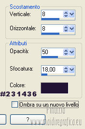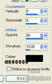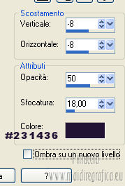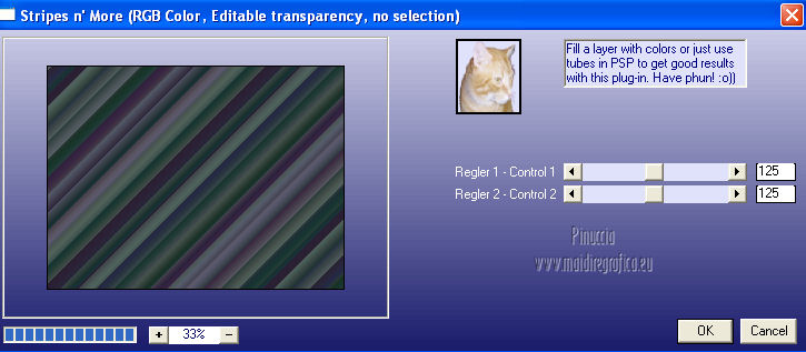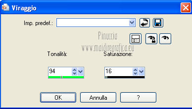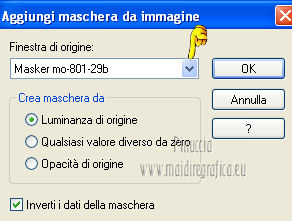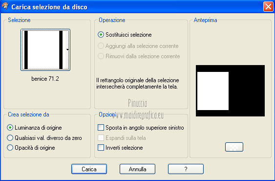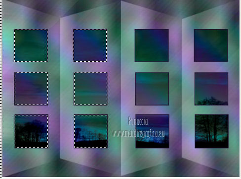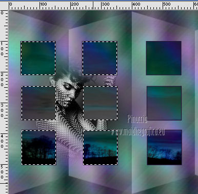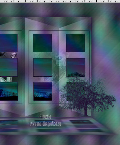 qui puoi trovare qualche risposta ai tuoi dubbi. Se l'argomento che ti interessa non è presente, ti prego di segnalarmelo. Occorrente: Materiale qui Filtri: consulta, se necessario, la mia sezione filtri qui Alien Skin Eye Candy 5 Impact qui Background Maniac qui ![]() Metti il gradiente nella cartella Gradienti. Metti le selezioni nella cartella Selezioni. Importa il pennello in PSP. Vedi gli appunti sui pennelli qui Metti le selezioni nella cartella Selezioni. Apri la maschera in PSP e minimizzala con il resto del materiale. Imposta il colore di primo piano il colore bianco, e il colore di sfondo con #231436. ![]() Passa il colore di primo piano a Gradiente, seleziona il gradiente BHW5, con i seguenti settaggi. ![]() 1. Apri una nuova immagine trasparente 800 x 600 pixels. Selezione>Seleziona tutto. Apri l'immagine Achtergrond les 71, e vai a Modifica>Copia. Torna al tuo lavoro e vai a Modifica>Incolla nella selezione. Selezione>Deseleziona. 2. Livelli>Nuovo livello raster. Riempi il livello con il gradiente.Cambia la modalità di miscelatura di questo livello in Tonalità (esistente). Livelli>Unisci>Unisci giù. Livelli>Duplica. Effetti>Plugins>Backgroundmaniac - Stripes n' More. ![]() Cambia la modalità di miscelatura di questo livello in Filtra, e abbassa l'opacità al 27%. Livelli>Unisci>Unisci giù. Finestra>Duplica (o, sulla tastiera, maiuscola+D) per fare una copia. Minimizza la copia che ti servirà più tardi, e torna al tuo lavoro originale. 3. Riporta il colore di primo piano al colore bianco. Livelli>Nuovo livello raster. Riempi con il colore bianco.Livelli>Nuovo livello maschera>Da immagine. Apri il menu sotto la finestra di origine e vedrai la lista dei files aperti. Seleziona la maschera Masker M0801-29b, con i seguenti settaggi: ![]() Livelli>Unisci>Unisci gruppo. Cambia la modalità di miscelatura di questo livello in Luminanza (esistente), e abbassa l'opacità al 36%. Immagine>Ridimensiona, al 102%, tutti i livelli non selezionato. 4. Livelli>Nuovo livello raster. Selezione>Carica/Salva selezione>Carica selezione da disco. Cerca e carica la selezione Benice 71.1. ![]() Riempi la selezione con il colore di sfondo.Selezione>Modifica>Contrai - 2 pix. Premi sulla tastiera il tasto CANC. Livelli>Nuovo livello raster. Apri l'immagine Blutrot e vai a Modifica>Copia. Torna al tuo lavoro e vai a Modifica>Incolla nella selezione. Selezione>Deseleziona. Cambia la modalità di miscelatura di questo livello in Luminanza (esistente). Livelli>Duplica. Cambia la modalità di miscelatura di questo livello in Differenza, e abbassa l'opacità al 34%. 5. Attiva il livello Raster 2. Attiva lo strumento Bacchetta magica ![]() e clicca nei quadri a sinistra per selezionarli. ![]() Apri il tube WP_1024 - 24 e vai a Modifica>Copia. Torna al tuo lavoro e vai a Modifica>Incolla come nuovo livello. Sposta il tube sotto le selezioni.![]() Premi sulla tastiera il tasto CANC. Selezione>Deseleziona. Cambia la modalità di miscelatura di questo livello in Luce netta. Livelli>Disponi>Sposta giù. Livelli>Duplica. Immagine>Rifletti. Cambia la modalità di miscelatura di questo livello in Luce diffusa, e abbassa l'opacità al 50%. 6. Attiva nuovamente il livello superiore. Livelli>Nuovo livello raster. Selezione>Carica/Salva selezione>Carica selezione da disco. Cerca e carica la selezione Benice 71.2. ![]() Riempi la selezione con il colore di sfondo.Selezione>Modifica>Contrai - 2 pixels. Premi sulla tastiera il tasto CANC. Selezione>Deseleziona. Livelli>Duplica. Immagine>Rifletti. Livelli>Unisci>Unisci giù. Cambia la modalità di miscelatura di questo livello in Luminanza (esistente), e abbassa l'opacità all'85%. 7. Immagine>Aggiungi bordatura, 2 pixels, simmetriche, con il colore #231436. Immagine>Ridimensiona, al 70%, tutti i livelli selezionato. Regola>Messa a fuoco>Metti a fuoco. Modifica>Copia. Attiva il duplicato che hai minimizzato al punto 2. ![]() Modifica>Incolla come nuovo livello. Effetti>Effetti di immagine>Scostamento. ![]() Effetti>Plugins>Alien Skin Eye Candy 5 Impact - Perspective Shadow seleziona il preset Reflect in Front, Short e ok. ![]() Effetti>Effetti 3D>Sfalsa ombra - colore #231436. ![]() Ripeti Effetti>Effetti 3D>Sfalsa ombra, cambiando verticale e orizzontale con -8. ![]() 8. Imposta il colore di primo piano con #50a886. ![]() Livelli>Nuovo livello raster. Attiva lo strumento Pennello ![]() cerca e seleziona il pennello Tree-brushes-by-Blatzer-JanvierZHX, con i seguenti settaggi. ![]() Applicalo a destra, come nell'esempio, cliccando con il tasto sinistro del mouse, per usare il colore di primo piano. ![]() Livelli>Nuovo livello raster. Applica il pennello sopra il precedente, cliccando con il tasto destro del mouse per usare il colore di sfondo. ![]() Sposta questo pennello leggermente più a destra.![]() Livelli>Unisci>Unisci giù. Effetti>Effetti di bordo>Aumenta. Effetti>Effetti 3D>Sfalsa ombra. ![]() 9. Apri il tube Jet-man 1-januari- 2008 e vai a Modifica>Copia. Torna al tuo lavoro e vai a Modifica>Incolla come nuovo livello. Immagine>Ridimensiona, al 80 %, tutti i livelli non selezionato. Regola>Tonalità e saturazione>Viraggio. ![]() Posiziona il tube come nel mio esempio.Regola>Messa a fuoco>Metti a fuoco. Effetti>Effetti 3D>Sfalsa ombra. ![]() 10. Apri il tube Line Brushes_19 e vai a Modifica>Copia. Torna al tuo lavoro e vai a Modifica>Incolla come nuovo livello. Immagine>Ruota per gradi - 90 gradi a destra. >br>Sposta il tube a sinistra.Immagine>Aggiungi bordatura, 2 pixels, simmetriche, con il colore #231436. Aggiungi il tuo nome e/o il tuo watermark e salva in formato jpg. ![]() Se hai problemi o dubbi, o trovi un link non funzionante, o anche soltanto per un saluto, scrivimi 19 Ottobre 2012 |