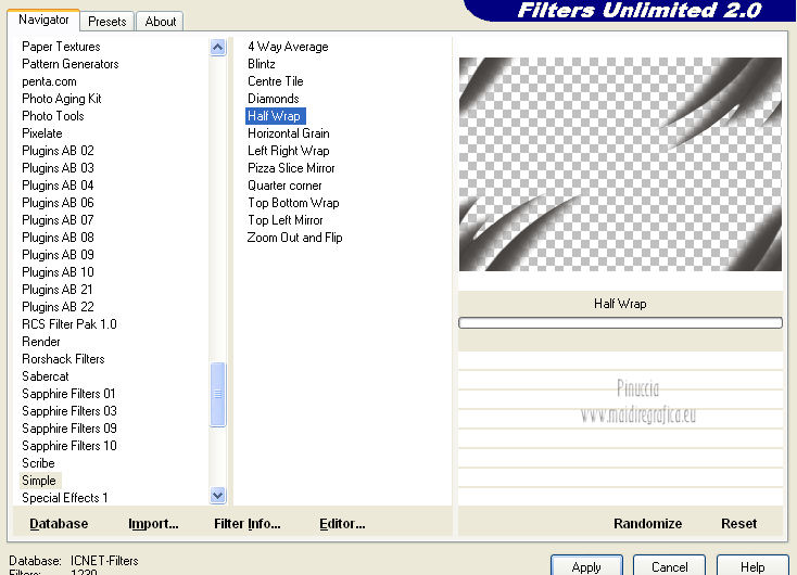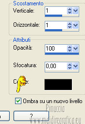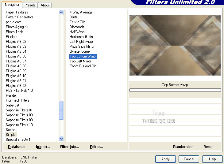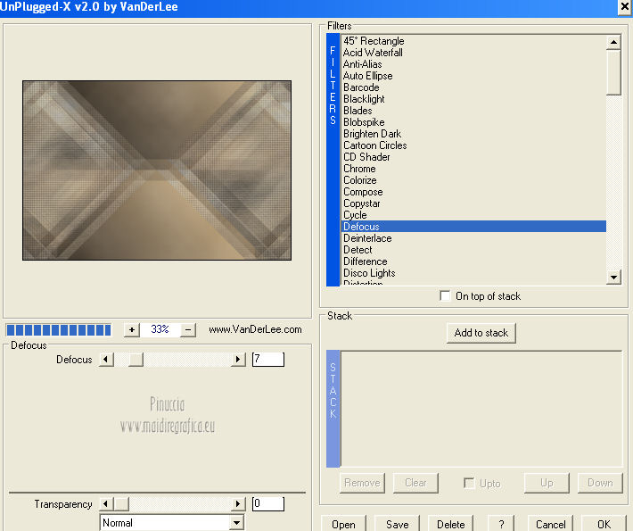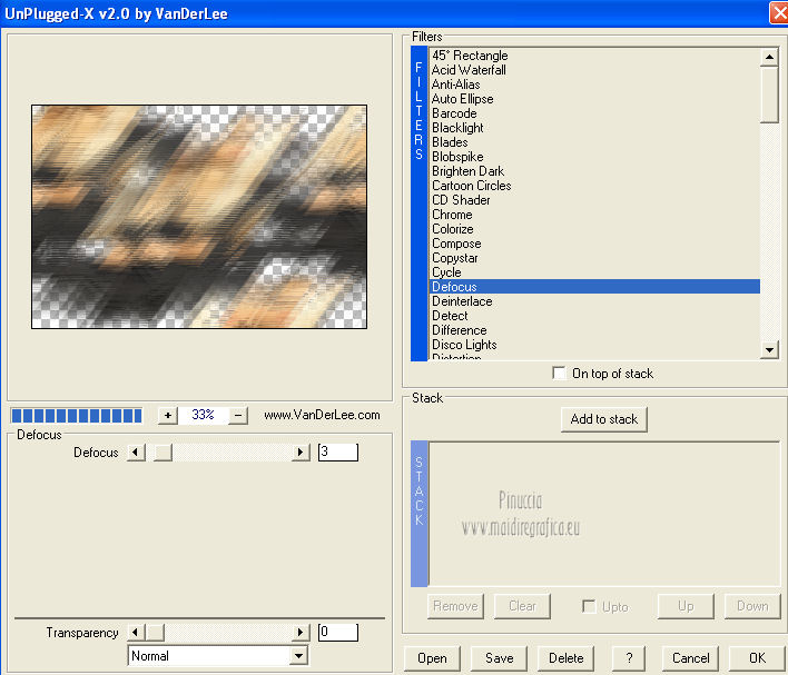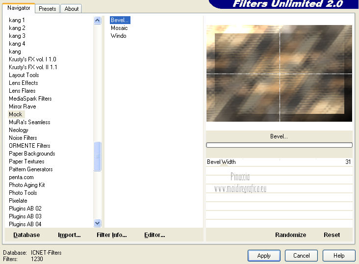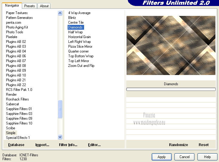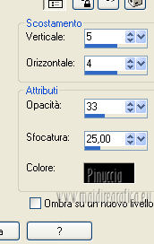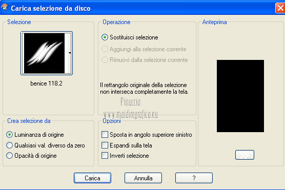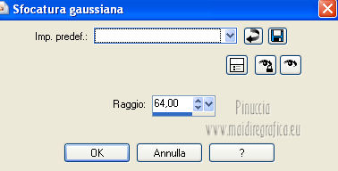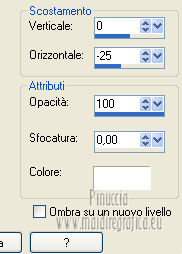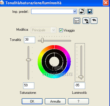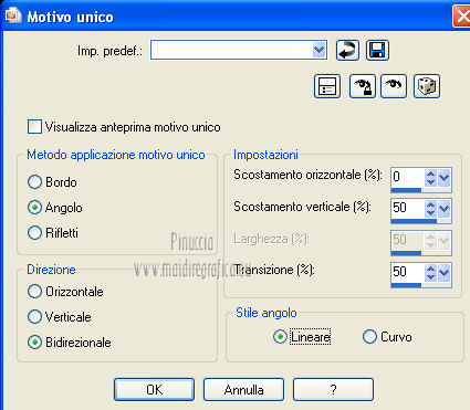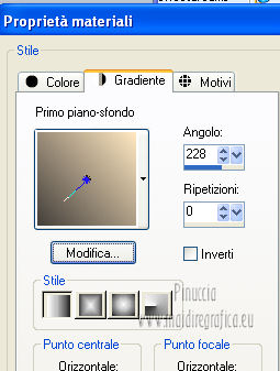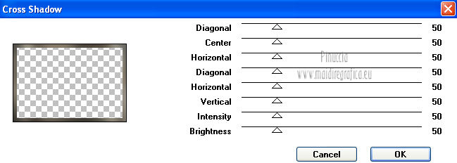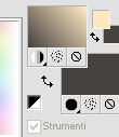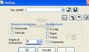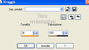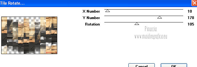 qui puoi trovare qualche risposta ai tuoi dubbi. Se l'argomento che ti interessa non è presente, ti prego di segnalarmelo. Occorrente: Materiale qui Filtri: consulta, se necessario, la mia sezione filtri qui Graphics Plus qui Filters Unlimited 2.0 qui Mock qui Mura's Meister - Cloud qui Mura's Seamless qui Simple qui Simple - Top Bottom Wrap (bonus) qui VanDerLee - Unplugged X qui i filtri Mock e Simple si possono usare da soli o importati in Filters Unlimited ![]() Apri il font e minimizzalo. Lo troverai nella lista dei font disponibili quando ti servirà. Metti le selezioni nella cartella Selezioni. Imposta il colore di primo piano con #ffe8c1, e il colore di sfondo con #443f3b. ![]() Passa il colore di primo piano a Gradiente di primo piano sfondo, stile Lineare. ![]() 1. Apri una nuova immagine trasparente 900 x 600 pixels. Selezione>Seleziona tutto. Apri l'immagine Benice AG e vai a Modifica>Copia. Torna al tuo lavoro e vai a Modifica>Incolla nella selezione. Selezione>Deseleziona. 2. Livelli>Nuovo livello raster. Selezione>Seleziona tutto. Apri il tube Karine_dreams_Pretty_Woman_1466_Fevrier_2011 e vai a Modifica>Copia. non chiuderlo perchè ti servirà ancora Torna al tuo lavoro e vai a Modifica>Incolla nella selezione. Selezione>Deseleziona. Effetti>Effetti di immagine>Motivo unico. ![]() Effetti>Plugins>MuRa's Seamless - Tile Rotate. ![]() Effetti>Effetti geometrici>Inclina. ![]() Effetti>Plugins>VanDerLee - Unplugged X - Defocus. ![]() Livelli>Unisci>Unisci giù. Regola>Sfocatura>Sfoctura gaussiana - raggio 3. ![]() Livelli>Duplica. Immagine>Rifletti. Immagine>Capovolgi. Abbassa l'opacità di questo livello al 50%. Livelli>Unisci>Unisci giù. 3. Livelli>Duplica. Effetti>Plugins>Filters Unlimited 2.0 - Mock - Bevel. ![]() Effetti>Effetti di bordo>Aumenta. Effetti>Plugins>Filters Unlimited 2.0 - Simple - Diamonds. ![]() Cambia la modalità di miscelatura di questo livello in Filtra. Livelli>Unisci>Unisci giù. 4. Selezione>Carica/Salva selezione>Carica selezione da disco. Cerca e carica la selezione Benice 118.1. ![]() Premi sulla tastiera il tasto CANC. Selezione>Inverti. Effetti>Effetti di trama>Intessitura. ![]() Selezione>Inverti. Selezione>Modifica>Espandi - 2 pixels. Livelli>Nuovo livello raster. Riempi la selezione con il gradiente.Mantieni selezionato. 5. Livelli>Duplica. Selezione>Deseleziona. Attiva lo strumento Ritaglio e imposta manualmente i settaggi.poi clicca su Unito opaco. ![]() Clicca sul segno di spunta per applicare il ritaglio. ![]() 6. Selezione>Seleziona tutto. Selezione>Mobile. Selezione>Immobilizza. Effetti>Plugins>Mura's Meister - Cloud. Seleziona Fog e ok. ![]() Selezione>Deseleziona. Cambia la modalità di miscelatura di questo livello in Moltiplica. Livelli>Unisci>Unisci visibile. 7. Livelli>Duplica. Effetti>Plugins>Filters Unlimited 2.0 - Simple - Top Bottom Wrap. ![]() Effetti>Plugins>VanDerLee - Unplugged X - Defocus. ![]() Abbassa l'opacità di questo livello al 44%. Livelli>Unisci>Unisci giù. Livelli>Duplica. Cambia la modalità di miscelatura di questo livello in Indebolisci, e abbassa l'opacità al 33%. Livelli>Unisci>Unisci giù. 8. Imposta il colore di sfondo con #46423f. ![]() Livelli>Nuovo livello raster. Selezione>Carica/Salva selezione>Carica selezione da disco. Cerca e carica la selezione Benice 118.2. ![]() Riempi la selezione con il colore di sfondo.Selezione>Deseleziona. Cambia la modalità di miscelatura di questo livello in Indebolisci, e abbassa l'opacità al 36%. Livelli>Duplica. Effetti>Plugins>Filters Unlimited 2.0 - Simple - Half Wrap. ![]() Lascia la modalità di miscelatura del livello in Indebolisci, ma alza l'opacità al 53%. 9. Livelli>Nuovo livello raster. Selezione>Seleziona tutto. Apri il tube Light Effect Stuff - 013 e vai a Modifica>Copia. Torna al tuo lavoro e vai a Modifica>Incolla nella selezione. Selezione>Deseleziona. Immagine>Ridimensiona, al 115%, tutti i livelli non selezionato. Regola>Tonalità e saturazione>Viraggio>Tonalità/Saturazione/Luminosità. ![]() Effetti>Effetti di bordo>Aumenta. Cambia la modalità di miscelatura di questo livello in Differenza. 10. Apri il tube Benice decoratie e vai a Modifica>Copia. Torna al tuo lavoro e vai a Modifica>Incolla come nuovo livello. Effetti>Effetti di immagine>Scostamento. ![]() Effetti>Effetti 3D>Sfalsa ombra, con il colore bianco. ![]() Livelli>Duplica. Immagine>Rifletti. Livelli>Unisci>Unisci giù. Regola>Tonalità e saturazione>Viraggio. ![]() 11. Apri il Benice misted rose e vai a Modifica>Copia. Torna al tuo lavoro e vai a Modifica>Incolla come nuovo livello. Effetti>Effetti di immagine>Scostamento. ![]() Cambia la modalità di miscelatura di questo livello in Filtra, e abbassa l'opacità al 66%. Livelli>Duplica. Immagine>Rifletti. Immagine>Capovolgi. Effetti>Effetti di immagine>Scostamento. ![]() 12. Livelli>Unisci>Unisci visibile. Finestra>Duplica (o, sulla tastiera, maiuscola+D) per fare una copia. Minimizza la copia che userai più tardi e torna al tuo lavoro e originale. 13. Apri il tube Karine_dreams_Pretty_Woman_1446_Fevrier_2011 e vai a Modifica>Copia. Torna al tuo lavoro e vai a Modifica>Incolla come nuovo livello. Immagine>Ridimensiona, al 75%, tutti i livelli non selezionato. Non spostare il tube. Apri il tube "Benice mouwdeel" e vai a Modifica>Copia. Torna al tuo lavoro e vai a Modifica>Incolla come nuovo livello. Effetti>Effetti di immagine>Scostamento. ![]() Livelli>Unisci>Unisci giù. Effetti>Effetti di immagine>Scostamento. ![]() Effetti>Effetti 3D>Sfalsa ombra. ![]() 14. Imposta entrambi i colori nella paletta con #46423f. ![]() Attiva lo strumento Testo ![]() font TheNautigalROB, con i seguenti settaggi. ![]() Scrivi la lettera maiuscola Y. Livelli>Converti in livello raster. Cambia la dimensione del font con 100. Scrivi il resto del nome in lettere minuscole "asmin". Livelli>Converti in livello raster. Posiziona correttamente le due parti del testo.![]() Assicurati di essere assicurato sul livello superiore dei due testi, e vai a Livelli
