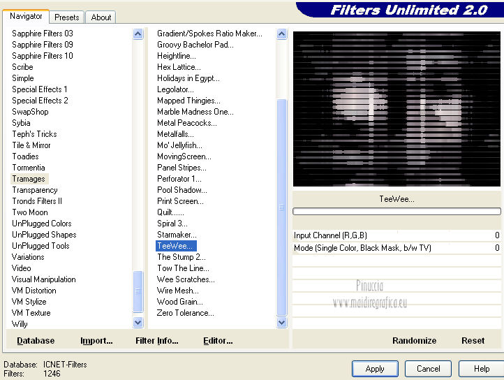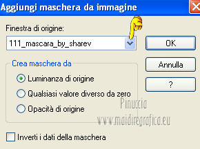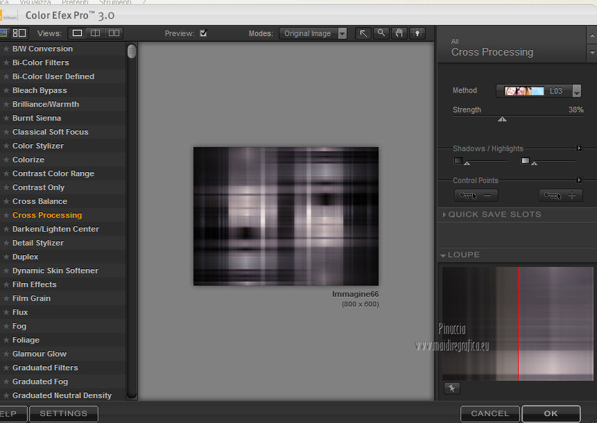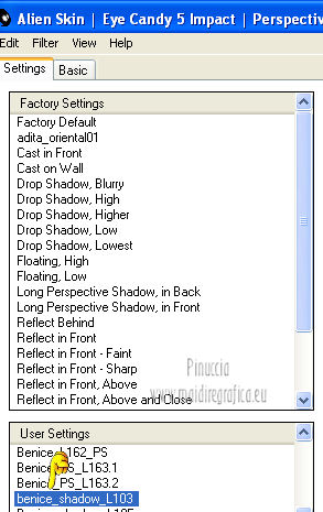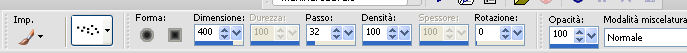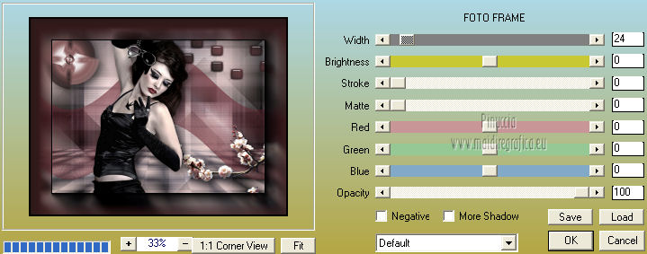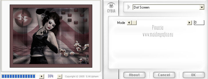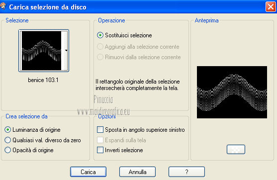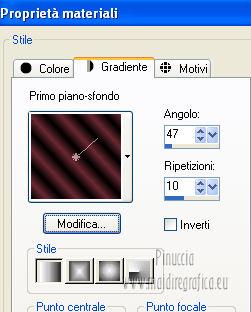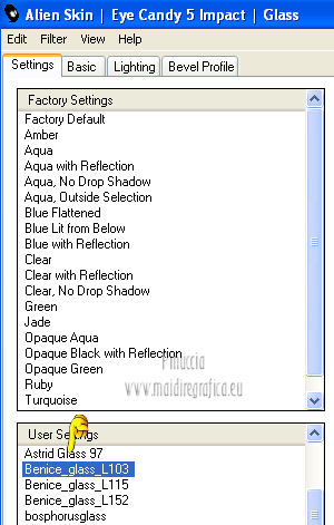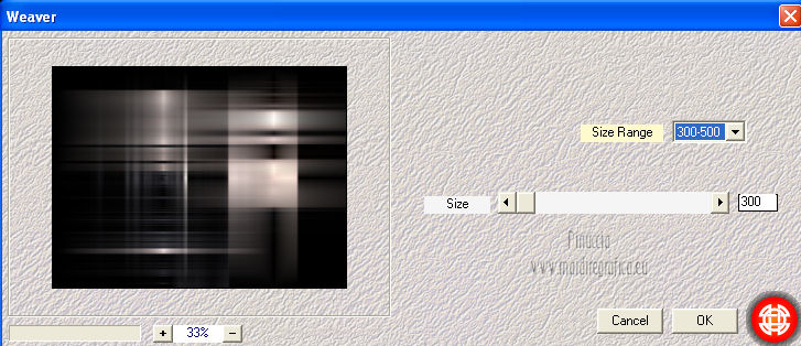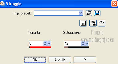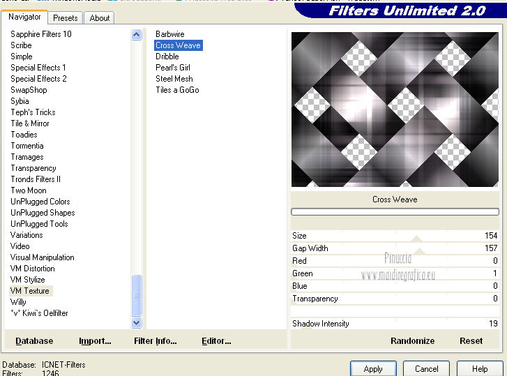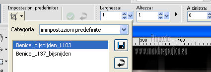 qui puoi trovare qualche risposta ai tuoi dubbi. Se l'argomento che ti interessa non è presente, ti prego di segnalarmelo. Occorrente: Materiale qui Il tube usato è di Annelies Filtri: consulta, se necessario, la mia sezione filtri qui Filters Unlimited 2.0 qui AAA Filters qui Mehdi qui Tramages qui VM Texture (da importare in Filters Unlimited) qui Cybia Screenworks qui Nik Software - Color Efex Pro qui Alien Skin Eye Candy 5 Impact qui I filtri Tramages si possono usare da soli o importati in Filters Unlimited. Come importare un filtro in Unlimited, vedi qui ![]() Metti i preset nelle rispettive cartelle del Filtro Alien Skin Eye Candy 5 Impact>Settings>Shadow/Glass. Cliccando sul file una o due volte (a seconda delle tue impostazioni) automaticamente il preset si installerà nella cartella corretta. Metti il pennello nella cartella Pennelli. Attenzione il pennello è composto da due files che non devono essere separati. Vedi gli appunti sui Pennelli qui Metti il preset "Preset Crop Benice bijsnijden L103" nella cartella Impostazioni Predefinite. Metti la selezione nella cartella Selezioni. Apri la maschera in PSP e minimizzala con il resto del materiale. Imposta il colore di primo piano con #000000 (nero), e il colore di sfondo con #faded9. ![]() 1. Apri una nuova immagine trasparente 800 x 600 pixels, e riempila con il colore di primo piano.Selezione>Seleziona tutto. Apri il tube Alies 328-vrouwen-14102010 e vai a Modifica>Copia. non chiuderlo perchè ti servirà ancora Torna al tuo lavoro e vai a Modifica>Incolla nella selezione. Selezione>Deseleziona. Effetti>Plugins>Mehdi - Weaver. ![]() Attiva lo strumento Ritaglio ,apri il menu delle impostazioni e seleziona il preset Benice_bijsnijden_L103. ![]() Clicca sul segno di spunta per applicare il ritaglio. ![]() Clicca sulla tastiera il tasto M per non visualizzare la griglia dello strumento. Modifica>Copia. 2. Apri una nuova immagine trasparente 800 x 600 pixels. Selezione>Seleziona tutto. Modifica>Incolla nella selezione. Selezione>Deseleziona. puoi chiudere la piccola immagine ritagliata perchè non ti serve più Livelli>Duplica. Immagine>Rifletti. Immagine>Capovolgi. Abbassa l'opacità di questo livello al 50%. Livelli>Unisci>Unisci giù. Effetti>Plugins>Nik Software - Color Efex Pro - Cross Processing. ![]() 3. Livelli>Duplica. Effetti>Plugins>Filters Unlimited 2.0 - VM Texture - Cross Weave. ![]() Abbassa l'opacità di questo livello al 36%. Regola>Messa a fuoco>Metti a fuoco. Livelli>Unisci>Unisci giù. 4. Livelli>Duplica. Effetti>Plugins>Filters Unlimited 2.0 - Tramages - TeeWee. ![]() Cambia la modalità di miscelatura di questo livello in Indebolisci, e abbassa l'opacità al 20%. Livelli>Unisci>Unisci giù. 5. Livelli>Nuovo livello raster. Riempi il livello con il colore di sfondo.Livelli>Nuovo livello maschera>Da immagine. Apri il menu sotto la finestra di origine e vedrai la lista dei files aperti. Seleziona la maschera 111_mascara_by_sharev, con i seguenti settaggi: ![]() Livelli>Unisci>Unisci gruppo. Immagine>Ridimensiona - 100x120%, mantieni proporzioni e tutti i livelli non selezionati. ![]() 6. Imposta il colore di sfondo con #692932. ![]() Livelli>Nuovo livello raster. Selezione>Carica/Salva selezione>Carica selezione da disco. Cerca e carica la selezioneCerca e carica la selezione Benice 103.1. ![]() Ingrandisci molto l'immagine per visualizzare meglio l'area selezionata,e riempi la selezione con il colore di sfondo, cliccando 4 volte.Selezione>Deseleziona. 7. Passa il colore di primo piano a Gradiente, stile Lineare. ![]() Livelli>Nuovo livello raster. Attiva lo strumento Pennello ![]() cerca e seleziona il pennello Designalbrushes1_338, con i seguenti settaggi. ![]() Applica il pennello in alto a destra, cliccando con il tasto sinistro del mouse per usare il gradiente di primo piano. ![]() Livelli>Duplica. Effetti>Plugins>Alien Skin Eye Candy 5 Impact - Glass. Seleziona il preset Benice_glass_L103 e ok. ![]() 8. Apri il tube 12206401585_fleurs e vai a Modifica>Copia. Torna al tuo lavoro e vai a Modifica>Incolla come nuovo livello. Immagine>Ridimensiona, al 60%, tutti i livelli non selezionato, (non dimenticare di selezionare mantieni proporzioni). ![]() Sposta il tube in basso a destra.![]() Effetti>Plugins>Alien Skin Eye Candy 5 Impact - Perspective Shadow. Seleziona il preset Benice_shadow_L103 e ok. ![]() 9. Apri il tube Benice tube 22 e vai a Modifica>Copia. Torna al tuo lavoro e vai a Modifica>Incolla come nuovo livello. Immagine>Ridimensiona, al 90%, tutti i livelli non selezionato. Regola>Tonalità e saturazione>Viraggio. ![]() Sposta il tube in alto a sinistra.![]() Regola>Messa a fuoco>Metti a fuoco. Effetti>Plugins>Alien Skin Eye Candy 5 Impact - Perspective Shadow, con i settaggi precedenti. 10. Attiva nuovamente il tube Alies 328-vrouwen-14102010 e vai a Modifica>Copia. Torna al tuo lavoro e vai a Modifica>Incolla come nuovo livello. Immagine>Ridimensiona, all'80%, tutti i livelli non selezionato. Posiziona il tube come nel mio esempio.![]() Regola>Messa a fuoco>Metti a fuoco. Effetti>Plugins>Alien Skin Eye Candy 5 Impact - Perspective Shadow, con i settaggi precedenti. 11. Livelli>Nuovo livello raster. Riempi il livello con il colore di sfondo.Selezione>Seleziona tutto. Selezione>Modifica>Contrai - 2 pixels. Premi sulla tastiera il tasto CANC. Selezione>Deseleziona. 12. Immagine>Aggiungi bordatura 30 pixels, simmetriche, con il colore #8c6464. Seleziona il bordo con la bacchetta magica ![]() Effetti>Plugins>Cybia - Screenwork - Dot Screen. ![]() Selezione>Innalza selezione a livello. Selezione>Deseleziona. Cambia la modalità di miscelatura di questo livello in Moltiplica, e abbassa l'opacità all'80%. Livelli>Unisci>Unisci tutto. Effetti>Plugins>AAA Frames - Foto Frame. ![]() Immagine>Aggiungi bordatura, 1 pixel, simmetriche, con il colore #8c6464. Aggiungi il tuo nome e/o il tuo watermark e salva in formato jpg. ![]() Se hai problemi o dubbi, o trovi un link non funzionante, o anche soltanto per u
