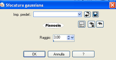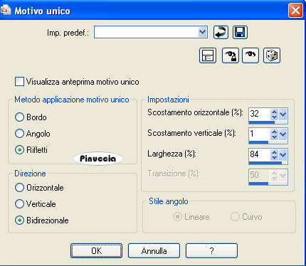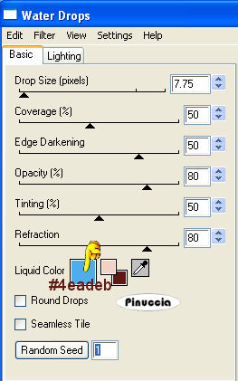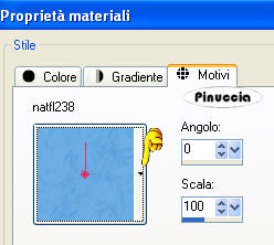 qui puoi trovare qualche risposta ai tuoi dubbi. Se l'argomento che ti interessa non è presente, ti prego di segnalarmelo. Occorrente: Materiale qui Il tube è di Jet. Filtro: Eye Candy 4000 qui Metti la maschera nella cartella Maschere. 1. Apri una nuova immagine trasparente 750 x 500 pixels. 2. Selezione>Seleziona tutto. 3. Apri il file di sfondo "blue-abstract-composition", e vai a Modifica>Copia. Torna al tuo lavoro e vai a Modifica>Incolla nella selezione. 4. Selezione>Deseleziona. 5. Effetti>Plugins>Eye Candy 4000 - Waterdrops, con i seguenti settaggi, colore #4eadeb. ![]() 6. Regola>Sfocatura>Sfocatura gaussiana, raggio 3. ![]() 7. Apri l'immagine con il fiore e vai a Modifica>Copia. Torna al tuo lavoro e vai a Modifica>incolla come nuovo livello. 8. Livelli>Carica/Salva maschera>Carica maschera da disco. Cerca e carica la maschera 20-20: ![]() 9. Immagine>Aggiungi bordatura, 1 pixel, simmetriche, con il colore nero. 10. Immagine>Aggiungi bordatura, 30 pixels, simmetriche, con il colore #84afdc. 11. Seleziona questo bordo con la bacchetta magica ![]() ![]() 12. Crea una nuova trama usando la trama natfl238 fornita con il tutorial e impostala come motivo di primo piano. ![]() Riempi la trama con questo motivo.13. Effetti>Effetti di bordo>Aumenta di più. 14. Selezione>Deseleziona. 15. Apri il tube di Jet e vai a Modifica>Copia. Torna al tuo lavoro e vai a Modifica>Incolla come nuovo livello. Immagine>Ridimensiona, al 70%, tutti i livelli non selezionato. Posiziona il tube come preferisci, o vedi il mio esempio.16. Immagine>Aggiungi bordatura, 1 pixel, simmetriche, con il colore nero. 17. Livelli>Unisci>Unisci tutto. 18. Se vuoi, ridimensiona l'immagine: Immagine>Ridimensiona, ricampionamento bicubica. Se ridimensioni: Regola>Messa a fuoco>Metti a fuoco. 19. Aggiungi il tuo nome e/o il tuo watermark e salva in formato jpg. Se vuoi creare uno sfondo: Apri una nuova immagine trasparente 300x300, e riempila con il motivo che hai creato al punto 12. Effetti>Effetti di immagine>Motivo unico. ![]() Salva in formato jpg. ![]() Se hai problemi o dubbi, o trovi un link non funzionante, o anche soltanto per un saluto, scrivimi. 15 Settembre 2008 ![]()