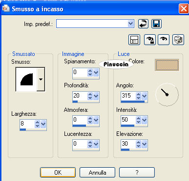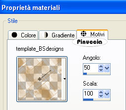qui puoi trovare qualche risposta ai tuoi dubbi. Se l'argomento che ti interessa non è presente, ti prego di segnalarmelo. Occorrente: Materiale qui Filtri: FM Tile Tools - Blend Emboss qui Xero - Porcelain qui 1. Apri una nuova immagine trasparente 500 x 400 pixels. 2. Selezione>Seleziona tutto. 3. Imposta il colore di primo piano con #a09a82. 4. Riempi con il colore di primo piano.5. Livelli>Nuovo livello raster. 6. Apri il template "Template60" e vai a Modifica>Copia. Torna al tuo lavoro e vai a Modifica>Incolla nella selezione. Nella paletta dei livelli abbassa l'opacità di questo livello al 53%. 7. Effetti>Plugins>FM Tile Tools - Blend Emboss, con i settaggi standard. ![]() 8. Selezione>Deseleziona. 9. Apri Les_rochers e vai a Modifica>Copia. Torna al tuo lavoro e vai a Modifica>Incolla come nuovo livello. Abbassa l'opacità di questo livello al 79%. Sposta il tube un po' più a sinistra:![]() 10. Apri il tube !angelina-yvonnepower-56489 e vai a Modifica>Copia. Torna al tuo lavoro e vai a Modifica>Incolla come nuovo livello. Effetti>Plugins>FM Tile Tools - Blend Emboss, con i settaggi standard. 11. Apri il tube rw-thedockofthebay~misted e vai a Modifica>Copia. Torna al tuo lavoro e vai a Modifica>Incolla come nuovo livello. Sposta il tube in alto, come nel mio esempio.Nella paletta dei livelli sposta questo livello sotto quello degli altri tubes. ![]() 12. Effetti>Plugins>Xero - Porcelain, con i settaggi standard. ![]() 13. Immagine>Aggiungi bordatura, 7 pixels, simmetriche, con il colore #aa8d8a. Seleziona questo bordo con la bacchetta magica ![]() ![]() 14. Apri Template BSdesigns, e minimizzalo nella tua area di lavoro. Passa il colore di primo piano a Motivi e seleziona il template. ![]() Riempi la selezione con questo motivo.15. Effetti>Effetti 3D>Smusso a incasso: ![]() Selezione>Deseleziona. 16. Immagine>Aggiungi bordatura, 15 pixels, simmetriche, con il colore #571156. Seleziona il bordo con la bacchetta magica ![]() e riempilo con il motivo di primo piano.Selezione>Deseleziona. 17. Immagine>Aggiungi bordatura, 7 pixels, simmetriche, con il colore #aa8d8a. Seleziona il bordo con la bacchetta magica ![]() e riempilo con la trama.Effetti>Effetti 3D>Smusso a incasso, con i settaggi precedenti. Selezione>Deseleziona. 18. Livelli>Unisci>Unisci tutto. Se vuoi, ridimensiona l'immagine (Immagine>Ridimensiona, ricampionamento bicubico). In questo caso: Regola>Messa a fuoco>Metti a fuoco. Aggiungi il tuo nome e/o il tuo watermark e salva in formato jpg. ![]() Se hai problemi o dubbi, o trovi un link non funzionante, o anche soltanto per un saluto, scrivimi. 19 Settembre 2008