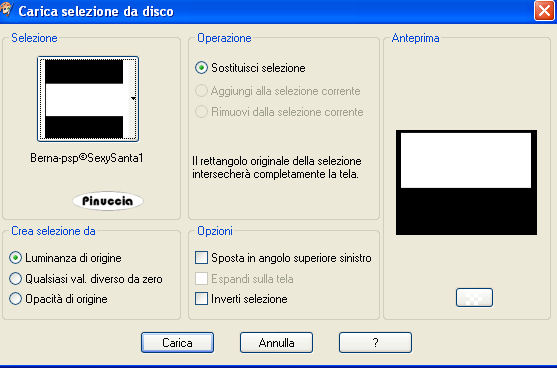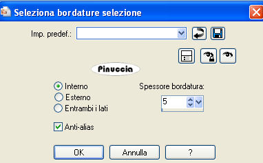 qui puoi trovare qualche risposta ai tuoi dubbi. Se l'argomento che ti interessa non è presente, ti prego di segnalarmelo. Occorrente: Materiale qui Metti la Selezione nella cartella Selezioni. Filtri: Xero qui 1. Apri una nuova immagine trasparente 800 x 600 pixels. 2. Selezione>Seleziona tutto. 3. Apri Berna_Christmastemplate e vai a Modifica>Copia. Torna al tuo lavoro e vai a Modifica>incolla nella selezione. Selezione>Deseleziona. 4. Livelli>Duplica. 5. Immagine>Ruota per gradi - 270 gradi a destra. ![]() Cambia la modalità di miscelatura di questo livello in Luce diffusa. 6. Livelli>Nuovo livello raster. 7. Selezione>Carica/salva selezione>Carica selezione da disco. Cerca e carica la selezione Berna-psp©SexySanta1: ![]() 8. Selezione>modifica>Seleziona bordature selezione: ![]() 9. Riempi la selezione con il colore #7c2d30.10. Attiva la strumento Bacchetta magica ![]() ![]() Clicca sul rettangolo per selezionarlo. ![]() 11. Livelli>Nuovo livello raster. 12. Apri l'immagine del paesaggio "3 800x600" e vai a Modifica>Copia. Torna al tuo lavoro e vai a Modifica>Incolla nella selezione. 13. Selezione>Deseleziona. 14. Apri il tube Bow-Red-KKs-DeZines e vai a Modifica>Copia. non chiuderlo perchè ti servirà ancora Torna al tuo lavoro e vai a Modifica>Incolla come nuovo livello. 15. Immagine>Ridimensiona, 4 volte all'80%, ricampionamento bicubica, tutti i livelli non selezionato. ![]() 16. Sposta il nastro nell'angolo in basso a sinistra.17. Livelli>Duplica. Immagine>Rifletti. 18. Apri il tube Berna_Christmas_14_2008" e vai a Modifica>Copia. Torna al tuo lavoro e vai a Modifica>incolla come nuovo livello. 19. Immagine>ridimensiona, al 120%, tutti i livelli non selezionato, bicubica. 20. Posiziona il tube al centro.21. Controlla che ogni cosa sia al posto giusto e vai a Livelli>Unisci>Unisci tutto. 22. Immagine>Aggiungi bordatura, 5 pixels, simmetriche, con il colore #a32f39. Immagine>Aggiungi bordatura, 50 pixels, simmetriche, con il colore #7c2d30. Seleziona questo bordo con la bacchetta magica ![]() ![]() Livelli>Nuovo livello raster. Attiva nuovamente il paesaggio "3 800x600" e vai a Modifica>Copia. Torna al tuo lavoro e vai a Modifica>incolla nella selezione. 23. Regola>Sfocatura>Sfocatura gaussiana - raggio 5 - 2 volte. ![]() 24. Selezione>Seleziona tutto. 25. Selezione>Modifica>Contrai - 20 pixels. 26. Selezione>inverti. 27. Riempi la selezione con il colore #a32f39.28. Effetti>Effetti 3D>Smusso a rilievo, con un settaggio a tua scelta: per il mio esempio ho usato le impostazioni predefinite. ![]() 29. Selezione>Deseleziona. 30. Effetti>Plugins>Xero - Porcelain, con i settaggi standard. ![]() 31. Livelli>Unisci>Unisci tutto. 32. Se vuoi, aggiungi un testo e il tuo watermark. 33. Se vuoi, ridimensiona l'immagine. Se ridimensioni: Regola>Messa a fuoco>Metti a fuoco. Salva in formato jpg. Se vuoi creare uno sfondo, puoi usare il template. Apri l'immagine e ridimensionala a 300 x 300 pixels. Effetti>Effetti di immagine>Motivo unico, con i settaggi standard. ![]() Salva in formato jpg. ![]() Se hai problemi o dubbi, o trovi un link non funzionante, o anche soltanto per un saluto, scrivimi. 29 Novembre 2008