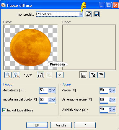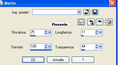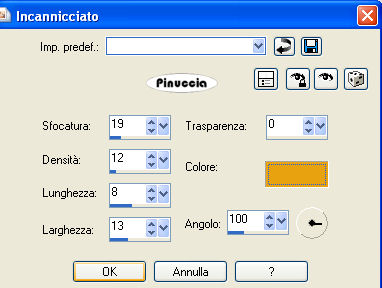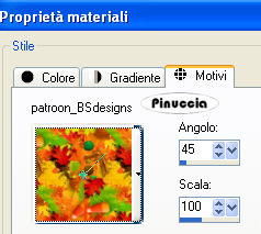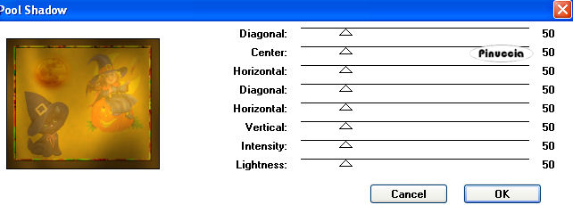 qui puoi trovare qualche risposta ai tuoi dubbi. Se l'argomento che ti interessa non è presente, ti prego di segnalarmelo. Occorrente: Materiale qui Filtri: Greg's Factory Output qui 1. Apri una nuova immagine trasparente 600 x 500 pixels. 2. Imposta il colore di primo piano con #e9a210. Riempi l'immagine trasparente con il colore di primo piano.3. Effetti>Effetti di trama>Incannicciato, con i seguenti settaggi, colore #e0960f. ![]() 4. Effetti>Effetti di trama>Manto, con i seguenti settaggi: ![]() 5. Apri il tube Halloween28 BSdesigns e vai a Modifica>Copia. Torna al tuo lavoro e vai a Modifica>Incolla come nuovo livello. Sposta la gatta nell'angolo in basso a sinistra.Abbassa l'opacità di questo livello al 47%. 6. Apri Halloween32 BSdesigns e vai a Modifica>copia. Torna al tuo lavoro e vai a Modifica>Incolla come nuovo livello. Sposta la streghetta in alto a destra.Abbassa l'opacità di questo livello al 33%. 7. Immagine>Aggiungi bordatura, 10 pixels, simmetriche, con il colore nero. Seleziona questo bordo con la bacchetta magica ![]() ![]() Apri il motivo Patroon BSdesigns e minimizzalo nella tua area di lavoro. Passa il colore di primo piano a Motivi e seleziona il motivo con i seguenti settaggi. ![]() Riempi la selezione con il motivo di primo piano.Effetti>Effetti 3D>Smusso a incasso, con i seguenti settaggi. ![]() Selezione>Deseleziona. 8. Immagine>Aggiungi bordatura, 30 pixels, simmetriche, con il colore #865810. Seleziona il bordo con la bacchetta magica ![]() Effetti>Plugins>Greg's Factory Output - Pool Shadow: ![]() Selezione>Deseleziona. 9. Immagine>Aggiungi bordatura, 10 pixels, simmetriche, con il colore nero. Seleziona il bordo con la bacchetta magica ![]() e riempilo con il motivo di primo piano.Selezione>Deseleziona. 10. Apri il tube della luna (Halloween 11 BSdesigns) e vai a Modifica>Copia. Torna al tuo lavoro e vai a Modifica>Incolla come nuovo livello. Posiziona la luna in alto a sinistra.11. Regola>Morbidezza>Fuoco diffuso, con i settaggi standard. ![]() Livelli>Unisci>Unisci tutto. Se vuoi, ridimensiona l'immagine (Immagine>Ridimensiona, ricampionamento bicubico). In questo caso: Regola>Messa a fuoco>Metti a fuoco. Salva in formato jpg. ![]() Se hai problemi o dubbi, o trovi un link non funzionante, o anche soltanto per un saluto, scrivimi. 19 Settembre 2008