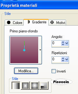 qui puoi trovare qualche risposta ai tuoi dubbi. Se l'argomento che ti interessa non è presente, ti prego di segnalarmelo. Occorrente: Materiale qui Il tube del fiore è di Sorensen. Filtri: FM Tile Tools - Blend Emboss qui Filters Unlimited qui 1. Apri una nuova immagine trasparente 600 x 400 pixels. 2. Crea un gradiente di primo piano sfondo con i colori #783150 e #ad8597. Questi i miei settaggi: ![]() 3. Selezione>Seleziona tutto. 4. Livelli>Nuovo livello raster. 5. Apri mds2539Nature e vai a Modifica>Copia. Torna al tuo lavoro e vai a Modifica>Incolla nella selezione. Selezione>Deseleziona. 5. Apri 8Mermaid%rockcfg e vai a Modifica>Copia. Torna al tuo lavoro e vai a Modifica>Incolla come nuovo livello. Sposta il tube in basso a sinistra.6. Regola>Tonalità e saturazione>Viraggio: ![]() 7. Apri il tube Misted By Sorensen_Designs, e vai a Modifica>Copia. Torna al tuo lavoro e vai a Modifica>Incolla come nuovo livello. Spostalo nell'angolo in basso a destra.![]() Abbassa l'opacità di questo livello all'85%. 8. Effetti>Plugins>FM Tile Tools - Blend Emboss, con i settaggi standard. ![]() 9. Apri il tube flying_birds e vai a Modifica>Copia. Torna al tuo lavoro e vai a Modifica>Incolla come nuovo livello. Attiva lo strumento Puntatore ![]() e allarga il tube per tre quarti della larghezza dell'immagine: ![]() 10. Regola>Tonalità e Saturazione>Viraggio, con i settaggi precedenti. 11. Immagine>Aggiungi bordatura, 4 pixels, simmetriche, con il colore #423526. 12. Immagine>Aggiungi bordatura, 15 pixels, simmetriche, con il colore #e0afaf. Seleziona il bordo con la bacchetta magica ![]() ![]() 13. Selezione>Inverti. 14. Modifica>Copia. 15. Selezione>Inverti. 16. Modifica>Incolla nella selezione (hai così copiato l'immagine nel bordo). 17. Effetti>Plugins>Filters Unlimited - Buttons and Frames - 3D Glass Frame 1: ![]() Selezione>Deseleziona. 18. Immagine>Aggiungi bordatura, 4 pixels, simmetriche, con il colore #423526. Se vuoi, ridimensiona l'immagine (Immagine>Ridimensiona, ricampionamento bicubico). In questo caso: Regola>Messa a fuoco>Metti a fuoco. Aggiungi il tuo nome e/o il tuo watermark e salva in formato jpg. ![]() Se hai problemi o dubbi, o trovi un link non funzionante, o anche soltanto per un saluto, scrivimi. 19 Settembre 2008 ![]()
