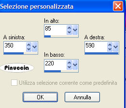 qui puoi trovare qualche risposta ai tuoi dubbi. Se l'argomento che ti interessa non è presente, ti prego di segnalarmelo. Occorrente: Materiale qui I tubes sono di Patry. 1. Apri in PSP il tube del fiore. 2. Scegli da questo tube due colori e imposta un colore scuro come colore di primo piano, e un colore chiaro come colore di sfondo Passa il colore di primo piano a Gradiente di primo piano/sfondo, con i seguenti settaggi: (il colore scuro deve trovarsi sotto): ![]() 3. Apri una nuova immagine trasparente 600 x 450 pixels, e riempila con il gradiente.4. Attiva il tube del fiore e vai a Modifica>Copia. Torna al tuo lavoro e vai a Modifica>Incolla>Incolla come nuovo livello. 5. Livelli>Nuovo livello raster. 6. Riempi il nuovo livello con uno dei due colori che hai scelto all'inizio del tutorial.7. Livelli>Carica/Salva maschera>Carica maschera da disco. Cerca e carica la maschera msk-cat016. ![]() Livelli>Elimina e rispondi sì alla domanda Unire la maschera nel livello corrente? ![]() Livelli>Unisci>Unisci gruppo. 8. Effetti>Effetti 3D>Sfalsa ombra, con i seguenti settaggi. ![]() 9. Regola>Messa a fuoco>Metti a fuoco. 10. Livelli>Unisci tutto. 11. Apri il tube della donna e vai a Modifica>Copia. Torna al tuo lavoro e vai a Modifica>Incolla>Incolla come nuovo livello. Sposta il tube a sinistra.12. Apri il tube con i cuori. Posizionati sul livello del cuore dorato (gold) e vai a Modifica>Copia. Torna al tuo lavoro e vai a Modifica>Incolla>Incolla come nuovo livello. Sposta il tube accanto alla donna.13. Controlla che tutto sia al posto giusto. Livelli>Unisci>Unisci tutto. 14. Copia l'immagine: Modifica>Copia. 15. Attiva lo strumento Selezione , rettangolo,selezione personalizzata , con i seguenti settaggi:![]() Livelli>Nuovo livello raster. Modifica>Incolla>Incolla nella selezione. 16. Effetti>Effetti 3D>Sfalsa ombra, con i seguenti settaggi: ![]() Ripeti l'Effetto Sfalsa ombra, ma cambiando verticale e orizzontale a -3. 16. Immagine>Aggiungi bordatura, 2 pixels, simmetriche, con il colore scuro. 17. Immagine>Aggiungi bordatura, 20 pixels, simmetriche, con il colore chiaro. 18. Immagine>Aggiungi bordatura, 2 pixels, simmetriche, con il colore scuro. 19. Aggiungi il tuo nome e/o il tuo watermark su un nuovo livello. 20. Livelli>Unisci>Unisci tutto e salva in formato jpg. ![]() Se hai problemi o dubbi, o trovi un link non funzionante, o anche soltanto per un saluto, scrivimi 29 Luglio 2007 |