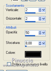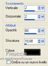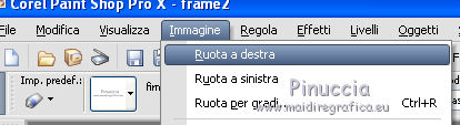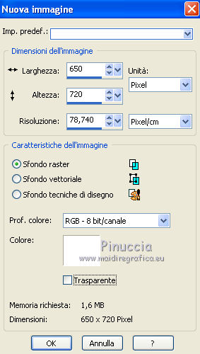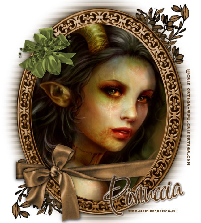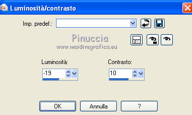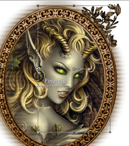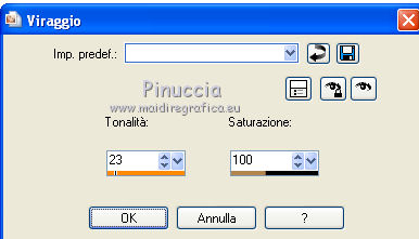 qui puoi trovare qualche risposta ai tuoi dubbi. Se l'argomento che ti interessa non è presente, ti prego di segnalarmelo. Questo tutorial è stato scritto con PSP X2, ma può essere eseguito anche con le altre versioni di PSP. Per tradurlo, ho usato PSP X. ©Biene - tutti i diritti riservati. Il © della traduzione è mio. Occorrente: Un tube a scelta. Per il mio esempio ho usato un'immagine http://candra.deviantart.com/ ©Candra Lo scrapkit Autumnangel di Tami che puoi trovare http://addictivepleasures.blogspot.com/ >qui, sotto 14.September 2009. Un ringraziamento ai creatori di tubes dei vari gruppi cui appartengo. Il watermark di ognuno è inserito nei tubes. Per favore, rispetta il lavoro degli autori: non cambiare il nome del file e non rimuovere il watermark. Il © appartiene agli artisti originali. Filtri: VM Extravaganza - Transmission qui Imposta il colore di primo piano con #644c2a. Apri una nuova immagine bianca 650 x 720 pixels. ![]() Dallo scrapkit apri frame2.png. Immagine>Ruota a destra. ![]() se stai usando PSP 9: Immagine>Ruota - 90 gradi in senso orario. Modifica>Copia. Torna al tuo lavoro e vai a Modifica>Incolla come nuovo livello. Regola>Tonalità e saturazione>Viraggio. ![]() Regola>Tonalità e saturazione>Tonalità/Saturazione/Luminosità. ![]() Di nuovo Regola>Tonalità e saturazione>Viraggio, con i settaggi precedenti. Regola>Luminosità e contrasto>Luminosità e contrasto. ![]() Attiva lo strumento Bacchetta magica ![]() e clicca sullo spazio bianco all'esterno della cornice. Selezione>Inverti. Livelli>Nuovo livello raster. Livelli>Disponi>Sposta giù. Riempi il livello con il colore di primo piano.Selezione>Deseleziona. Regola>Sfocatura>Sfocatura gaussiana - raggio 15. ![]() Effetti>Plugins>VM Extravaganza - Transmission, con i settaggi standard. ![]() Livelli>Duplica, e attiva il livello sottostante dell'originale. Immagine>Ridimensiona, al 105%, tutti i livelli non selezionato. Abbassa l'opacità di entrambi i livelli al 55%. ![]() Attiva il livello Copia di Raster 2. Apri il tuo tube. Eventualmente, se ne necessario, ritaglia una selezione del tube, che non superi l'altezza di 720 pixels. Modifica>Copia. Torna al tuo lavoro e vai a Modifica>Incolla come nuovo livello. Rinomina questo livello "immagine". Posiziona correttamente il tube nell'area della cornice.Attiva nuovamente il livello soprastante della cornice. Clicca con la bacchetta magica al centro della cornice.Selezione>Modifica>Espandi - 4 pixels. Selezione>Inverti. Attiva il livello "immagine" e premi sulla tastiera il tasto CANC. Selezione>Deseleziona. Attiva il livello di sfondo. Selezione>Seleziona tutto. Immagine>Ritaglia la selezione. In questo modo si evita che rimangano tracce di eventuali antiestetiche ombre. Dallo scrapkit apri leaves.png e vai a Modifica>Copia. Torna al tuo lavoro e vai a Modifica>Incolla come nuovo livello. Spostalo in alto a destra.Regola>Tonalità e saturazione>Viraggio, con i settaggi precedenti. Immagine>Ruota per gradi - 20 gradi a destra. ![]() Attiva nuovamente il tube leaves.png. Duplicalo usando la combinazione di tasti maiuscola+D e chiudi l'originale. Attiva lo strumento Seleziona a mano libera , da punto a punto, sfumatura 0,e seleziona la parte superiore dei fiori, come nell'esempio. ![]() Selezione>Inverti. Modifica>Copia. Torna al tuo lavoro e vai a Modifica>Incolla come nuovo livello. non lo vedi perchè è dietro la cornice Regola>Tonalità e saturazione>Viraggio, con i settaggi precedenti. Immagine>Ruota per gradi - 10 gradi a destra. ![]() Premi il tasto D per spostarlo. Spostalo in alto a destra un po' più in basso del tube precedente.![]() Livelli>Unisci>Unisci giù. Effetti>Effetti di bordo>Aumenta. Livelli>Duplica. Immagine>Rifletti. Immagine>Capovolgi. Livelli>Unisci>Unisci giù. Attiva nuovamente il livello superiore. Dallo scrapkit apri ribbonbow.png e vai a Modifica>Copia. Torna al tuo lavoro e vai a Modifica>Incolla come nuovo livello. Regola>Tonalità e saturazione>Viraggio, con i settaggi precedenti. Immagine>Ridimensiona, 2 volte all'85%, tutti i livelli non selezionato. Regola>Messa a fuoco>Metti a fuoco. Spostalo in basso come nel mio esempio.Effetti>Effetti 3D>Sfalsa ombra, con il colore nero. ![]() Attiva ora il livello della cornice. Attiva lo strumento Selezione , rettangolo,e traccia un rettangolo come nell'esempio (il pezzo di cornice sotto il nastro). ![]() Modifica>Copia. Livelli>Nuovo livello raster. Modifica>Incolla nella selezione. Selezione>Deseleziona. Livelli>Disponi>Porta in alto. Attiva il livello del nastro. Attiva lo strumento Gomma , dimensione 50, opacità 100,e cancella il pezzo di nastro al di fuori della cornice. ![]() Attiva nuovamente il livello superiore. Livelli>Unisci>Unisci giù - 3 volte. Effetti>Effetti 3D>Sfalsa ombra, con il colore nero. ![]() Ripeti l'Effetto Sfalsa ombra, cambiando verticale e orizzontale con -2. Dallo scrapkit apri bow.png e vai a Modifica>Copia. Torna al tuo lavoro e vai a Modifica>Incolla come nuovo livello. Immagine>Ridimensiona, al 30%, tutti i livelli non selezionato. Immagine>Rifletti. Regola>Messa a fuoco>Metti a fuoco. Posizionalo in alto a sinistra, vedi il mio esempio per orientarti. Imposta il colore di primo piano con #495026. Attiva lo strumento Trasforma in destinazione ,dimensione 100 e opacità 100, e passa il mouse sul fiocco, che diventerà completamente verde. Effetti>Effetti 3D>Sfalsa ombra, con il colore nero. ![]() Aggiungi il tuo nome e/o il tuo watermark, senza dimenticare eventuali copyright delle immagini usate. Se vuoi, aggiungi un testo. Per il mio esempio ho usato il font Inspiration, dimensione 125. Livelli>Unisci>Unisci tutto e salva in formato jpg. ![]() ![]() Se hai problemi o dubbi, o trovi un link non funzionante, o anche soltanto per un saluto, scrivimi.