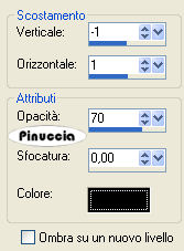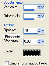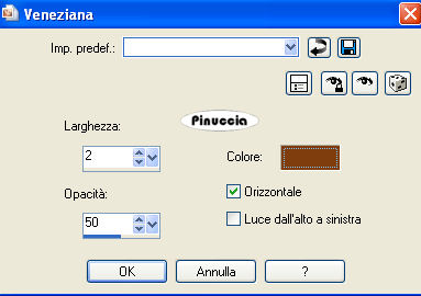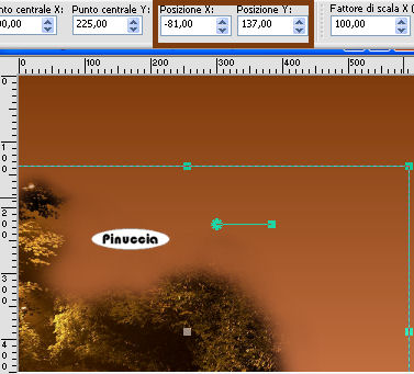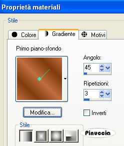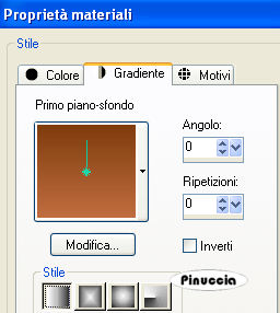 qui puoi trovare qualche risposta ai tuoi dubbi. Se l'argomento che ti interessa non è presente, ti prego di segnalarmelo. Questo tutorial è stato scritto con PSP X2, ma può essere eseguito anche con le altre versioni di PSP. Per tradurlo, l'ho eseguito con PSP X. Occorrente: Materiale qui I tubes che ho usato sono di Yoka, Marif, Silke(SKF) e BC. Rispetta il lavoro degli autori e mantieni inalterati i tubes. I pennelli autumn_wordart_biene.PsPBrush e leaves-biene.PspBrush sono di Biene. Mettili nella cartella Pennelli. Attenzione, i pennelli sono composti da due files che non devono essere separati. Vedi alcuni appunti sui pennelli qui Metti il motivo Gold Foil.jpg nella cartella Motivi. Apri una nuova immagine trasparente 600 x 450 pixels. Imposta il colore di primo piano con #c06d40, e il colore di sfondo con #7f3c0e. Passa il colore di primo piano a Gradiente lineare: ![]() Riempi l'immagine trasparente con il gradiente.Apri SKF_Landscape048.08.psp e vai a Modifica>Copia. Torna al tuo lavoro e vai a Modifica>Incolla come nuovo livello. Sposta il tube tutto in basso, fuori dall'immagine.La mia posizione: Pos.x: -81,00 Pos.y: 137,00 attivando lo strumento Puntatore , nella barra degli strumenti potrai controllare la posizione:![]() Cambia la modalità di miscelatura di questo livello in Luminanza (esistente), e abbassa l'opacità al 98%. Livelli>Duplica. Immagine>Rifletti. Apri Yoka-Bloemen-Kastanjeblad-021007.psp e vai a Modifica>Copia. Torna al tuo lavoro e vai a Modifica>Incolla come nuovo livello. Cambia la modalità di miscelatura di questo livello in Luminanza (esistente), e abbassa l'opacità al 38%. Sposta il tube a sinistra, un po' più in basso.La mia posizione: Pos.x: -113,00 Pos.y: 126,00 Apri BC-bloem.psp e vai a Modifica>Copia. Torna al tuo lavoro e vai a Modifica>Incolla come nuovo livello. Cambia la modalità di miscelatura di questo livello in Luminanza (esistente). Sposta il tube un po' più a sinistra, in basso.![]() Apri Marif_2006_septembre_misted_face0167.pspimage e vai a Modifica>Copia. Torna al tuo lavoro e vai a Modifica>Incolla come nuovo livello. Immagine>Ridimensiona, all'85%, tutti i livelli non selezionato. Regola>Luminosità e contrasto>Nitidezza: ![]() Sposta il tube nell'angolo in basso a destra.Attiva il livello Copia di Raster 2. Ingrandisci l'immagine almeno al 150%, usando la rotellina del mouse o attivando lo zoom ![]() Attiva lo strumento Gomma , dimensione 70, opacità 13,e cancella le tracce del paesaggio dal viso e dal collo della donna. ![]() Attiva il livello Raster 3 e togli le tracce di questo tube dal viso della donna. Attiva il livello superiore. Livelli>Nuovo livello raster. Attiva lo strumento Pennello ![]() cerca e seleziona il pennello autumn_wordart_biene.PspBrush, dimensione 285, e applicalo sullo spazio libero in alto a sinistra, cliccando con il tasto destro del mouse per usare il colore scuro di sfondo. Abbassa l'opacità di questo livello al 55%. Passa il colore di primo piano a Motivi e seleziona il motivo oro Gold Foil. ![]() Livelli>Nuovo livello raster. Attiva nuovamente lo strumento Pennello ![]() cerca e seleziona il pennello leaves-biene.PspBrush, dimensione 300, e applicalo nell'angolo in alto a sinistra, cliccando con il tasto sinistro del mouse per usare il motivo oro. Cambia la modalità di miscelatura di questo livello in Luminanza (esistente). Livelli>Duplica. Immagine>Rifletti. Livelli>Nuovo livello raster. Selezione>Seleziona tutto. Immagine>Dimensione tela - 602 x 452 pixels: ![]() Selezione>Modifica>Contrai - 2 pixels. Selezione>inverti. Riempi la selezione con il motivo oro.Selezione>Deseleziona. Cambia la modalità di miscelatura di questo livello in Luminanza (esistente) Effetti>Effetti 3D>Sfalsa ombra, con i seguenti settaggi, colore nero. ![]() Ripeti l'Effetto Sfalsa ombra, invertendo i valori verticale e orizzontale. ![]() Se vuoi, questo è il momento di aggiungere il tuo nome e/o il tuo watermark. Livelli>Unisci>Unisci tutto. Selezione>Seleziona tutto. Immagine>Aggiungi bordatura - 20 pixels, simmetriche, con il colore bianco. Selezione>Inverti. Cambia i settaggi del gradiente: ![]() Riempi la selezione con il gradiente.Effetti>Effetti di trama>Veneziana, con il colore di sfondo. ![]() Selezione>Seleziona tutto. Immagine>Aggiungi bordatura, 1 pixel, simmetriche, con il colore di primo piano. Selezione>Inverti. Livelli>Nuovo livello raster. Riempi la selezione con il motivo oro.Selezione>Deseleziona. Cambia la modalità di miscelatura di questo livello in Luminanza (esistente). Livelli>Unisci>Unisci tutto e salva in formato jpg. ![]() Se hai problemi o dubbi, o trovi un link non funzionante, o anche soltanto per un saluto, scrivimi 29 Settembre 2008 |