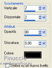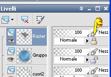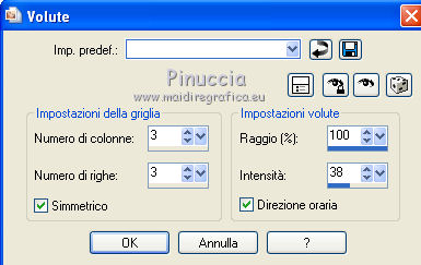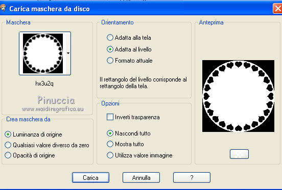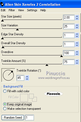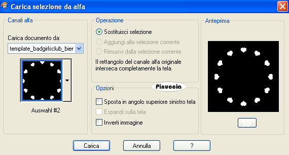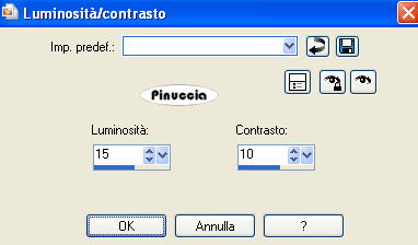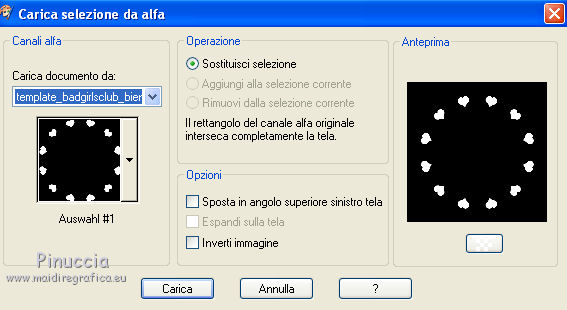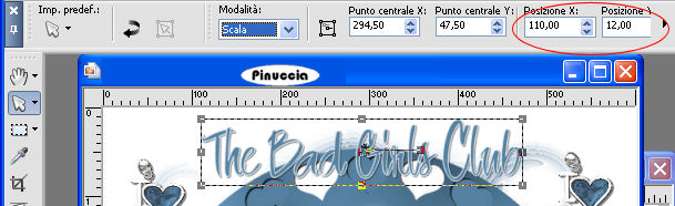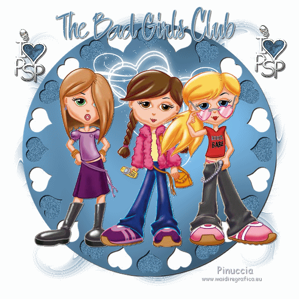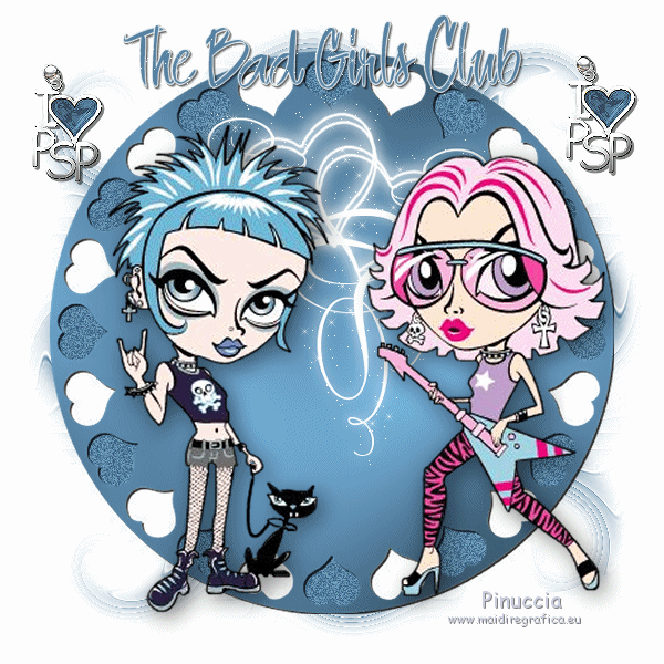 qui puoi trovare qualche risposta ai tuoi dubbi. Se l'argomento che ti interessa non è presente, ti prego di segnalarmelo. Questo tutorial è stato scritto con PSP X2, ma può essere eseguito anche con le altre versioni di PSP. Per tradurlo, l'ho eseguito con PSP X. Occorrente: Un tube a scelta. Il resto del materiale qui I tubes che ho usato sono di Kara, Mull e Sassy. Filtri: Graphics Plus qui Alien Skin Xenofex qui Ti servirà anche Animation Shop qui Metti le maschere nella cartella Maschere. Imposta il colore di primo piano con #5682a2, e il colore di sfondo con il bianco. Ho fatto anche una prova parallela usando con il colore di sfondo impostato sul nero, ma non mi ha soddisfatto. Se posso darti un consiglio, è meglio lasciare lo sfondo bianco. Apri il template di Biene template_badgirlsclub_biene.pspimage. L'immagine, che non è vuota ma contiene le selezioni salvate sul canale alfa, sarà la base del tuo lavoro. Riempi l'immagine con il colore bianco.Livelli>Nuovo livello raster. Riempi con il colore di primo piano.Livelli>Carica/Salva maschera>Carica maschera da disco. Cerca e carica la maschera montiblindsmask.jpg ![]() Effetti>Effetti di bordo>Aumenta. Livelli>Unisci>Unisci gruppo. Effetti>Effetti di distorsione>Volute: ![]() Livelli>Nuovo livello raster. Riempi con il colore di primo piano.Effetti>Plugins>Graphics Plus - Cross Shadow, con i seguenti settaggi: ![]() Regola>Sfocatura>Sfocatura gaussiana, raggio 20. ![]() Livelli>Carica/Salva maschera>Carica maschera da disco. Cerca e carica la maschera hx3u2q.jpg: ![]() Livelli>Unisci>Unisci gruppo. Effetti>Effetti 3d>Sfalsa ombra, con i seguenti settaggi, colore nero: ![]() Immagine>Ridimensiona, all'80%, tutti i livelli non selezionato. Selezione>Carica/Salva selezione>Carica selezione da canale alfa. E' già presente la selezione Auswahl#1. Clicca Carica. ![]() Selezione>Modifica>Espandi 1 pixel. Attiva il sottostante livello Gruppo Raster 2. Livelli>Nuovo livello raster. Riempi con il colore di sfondo.Selezione>Deseleziona. Effetti>Effetti di trama>Intessitura: ![]() Questo soltanto se usi il colore nero. Altrimenti, lascia i cuori bianchi. Livelli>Nuovo livello raster. Selezione>Carica/salva selezione>Carica selezione da canale alfa. seleziona Auswahl#2. ![]() Selezione>Modifica>Espandi - 1 pixel. Riempi la selezione con il colore di primo piano.Selezione>Deseleziona. Rinomina questo livello Cuore 2. Attiva nuovamente il livello superiore. Apri KaraT1401.psp. Attiva lo strumento Selezione a mano libera e seleziona la spirale nera.Modifica>Copia. Torna al tuo lavoro e vai a Modifica>Incolla come nuovo livello. Immagine>Ridimensiona, al 90%, tutti i livelli non selezionato. Spostalo un po' più in alto e a destra.Inverti i colori e passa il colore di sfondo (bianco) a colore di primo piano. Nella paletta dei livelli blocca la trasparenza di questo livello cliccando sul lucchetto, che si chiuderà. ![]() Riempi la spirale con il bianco.Rinomina questo livello "Spirale". Apri LIBPSPCharm1.tub, e vai a Modifica>copia. Torna al tuo lavoro e vai a Modifica>Incolla come nuovo livello. Immagine>Ridimensiona, al 60%, tutti i livelli non selezionato. Regola>Messa a fuoco>Metti a fuoco. Sposta il ciondolo a destra.Effetti>Effetti 3D>sfalsa ombra, con i seguenti settaggi, colore nero: ![]() Regola>Luminosità e contrasto>Luminosità e contrasto: ![]() Livelli>Duplica. Sposta il duplicato a sinistra.Apri button_biene.pspimage, e vai a Modifica>copia. Torna al tuo lavoro e vai a Modifica>Incolla come nuovo livello. Immagine>Ridimensiona, all'80%, tutti i livelli non selezionato. Regola>Messa a fuoco>Metti a fuoco. Sposta il bottone sull'occhiello del ciondolo a destra.Livelli>Duplica. Immagine>Rifletti. Posiziona il bottone sull'occhiello del ciondolo a sinistra.Apri il tuo tube e vai a Modifica>Copia. Torna al tuo lavoro e vai a Modifica>Incolla come nuovo livello. Posiziona il tube come ti sembra meglio.Effetti>Effetti 3D>Sfalsa ombra, con i seguenti settaggi, colore nero: ![]() Attiva lo strumento Testo , e scegli un font per scrivere il tuo testo.Puoi anche usare il file di testo fornito dall'autrice del tutorial schriftzug_badgirldclub_biene.pspimage. Per questo testo l'autrice ha usato un font a pagamento: Snappy DNA. Se usi il file di testo, spostalo in alto.la mia posizione è: Pos. x:110,00. Pos. y: 12,00. Attivando lo strumento Puntatore puoi controllare la posizione nella barra superiore degli strumenti:![]() Effetti>Effetti 3D>Sfalsa ombra, con i seguenti settaggi, colore nero: ![]() Rinomina questo livello "testo". Questo è il momento, se vuoi, di aggiungere il tuo nome e/o il tuo watermark. Attiva il livello "Cuore2. Regola>Aggiungi/Rimuovi disturbo>Aggiungi disturbo: ![]() Attiva il livello "spirale". Effetti>Plugins>Alien Skin Xenofex - Constellation: ![]() Attiva il livello "testo". Ripeti l'Effetto Constellation con gli stessi settaggi. Modifica>Copia Unione. Apri Animation Shop e vai a Modifica>Incolla>Incolla come nuova animazione. Torna in PSP. Dovrai annullare tutti i passaggi effettuati dopo l'applicazione della firma: Modifica>Annulla azione Constellation. Modifica>Annulla azione Selezione livello. Modifica>Annulla Azione Constellation. Modifica>Annulla azione Selezione livello. Modifica>Annulla azione Aggiungi disturbo. A questo punto ti ritroverai al punto di partenza sul livello Cuori2. ![]() Regola>Aggiungi/Rimuovi disturbo>Aggiungi disturbo, e cambia il disturbo con 35. ![]() Attiva il livello "spirale". Effetti>Plugins>Alien Skin Xenofex - Constellation, con i settaggi precedenti, ma clicca una volta su Random Seed. Attiva il livello "testo" e ripeti l'Effetto Constellation con gli stessi settaggi. Modifica>Copia Unione. Torna in Animation Shop e vai a Modifica>Incolla>Incolla dopo il fotogramma corrente. Ancora in PSP, annulla tutti i passaggi...: Modifica>Annulla azione Constellation. Modifica>Annulla azione Selezione livello. Modifica>Annulla Azione Constellation. Modifica>Annulla azione Selezione liv