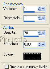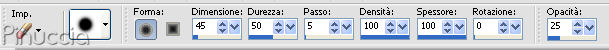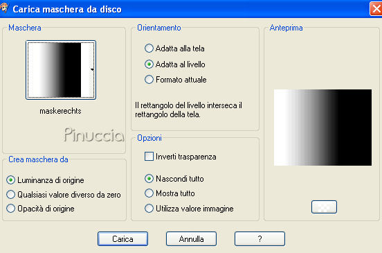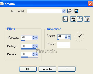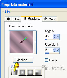 qui puoi trovare qualche risposta ai tuoi dubbi. Se l'argomento che ti interessa non è presente, ti prego di segnalarmelo. Questo tutorial è stato scritto con PSP X2, ma può essere eseguito anche con le altre versioni di PSP. Per tradurlo, l'ho eseguito con PSP X. Occorrente: Un tube a scelta. Il resto del materiale qui I tubes che ho usato sono di Jet, Marif, Kat e Joland@. Rispetta il lavoro degli autori e mantieni inalterati i tubes. Filtri: Graphics Plus qui Metti la Maschera maskerechts.jpg nella cartella Maschere. Imposta il colore di primo piano con #856f7b, e il colore di sfondo con #c8a2b1. Passa il colore di primo piano a Gradiente di primo piano/sfondo, con i seguenti settaggi: ![]() Apri una nuova immagine trasparente 700 x 500 pixels, e riempila con il gradiente.Regola>Sfocatura>Sfocatura gaussiana, raggio 15. ![]() Apri il tube Marif_2006_septembre_misted_paysage101.pspimage, e vai a Modifica>Copia. Torna al tuo lavoro e vai a Modifica>Incolla come nuovo livello. Immagine>Rifletti. Livelli>Carica/Salva maschera>Carica maschera da disco. Cerca e carica la maschera maskerechts.jpg: ![]() Livelli>Unisci>Unisci gruppo. Cambia la modalità di miscelatura di questo livello in Luminanza, e abbassa l'opacità al 70%. Sposta il tube in alto a sinistra.![]() Apri Joland@ Time-001.psp, e vai a Modifica>Copia. Torna al tuo lavoro e vai a Modifica>Incolla come nuovo livello. Sposta questo tube un po' più a destra, e in alto.Vedi il mio esempio per controllare la posizione. Cambia la modalità di miscelatura di questeo livello in Luminanza, e abbassa l'opacità al 20%. ![]() Apri Marif_2007_07Juillet_misted_decor0194.pspimage, e vai a Modifica>Copia. Torna al tuo lavoro e vai a Modifica>Incolla come nuovo livello. Immagine>Rifletti. Sposta questo tube in basso sul bordo.Cambia la modalità di miscelatura di questo livello in Luminanza (esistente), e abbassa l'opacità al 75%. Apri Kat_0435.psp, e vai a Modifica>Copia. Torna al tuo lavoro e vai a Modifica>Incolla come nuovo livello. Immagine>Rifletti. Cambia la modalità di miscelatura in Luminanza, e abbassa l'opacità al 65%. Imagine>Ridimensiona, all'85%, tutti i livelli non selezionato. Sposta il tube a destra, come nel mio esempio.![]() Attiva il livello Raster 2. Attiva lo strumento Gomma con i seguenti settaggi:![]() ingrandisci l'immagine usando la rotellina del mouse, o cliccando sullo zoom ![]() cancella dai pantaloni dell'uomo i segni le tracce del tube: ![]() quindi cancella tutte le tracce dell'orologio visibili sull'auto. ![]() Apri il tube jet-woman08-februari-20081.psp, e vai a Modifica>Copia. Torna al tuo lavoro e vai a Modifica>Incolla come nuovo livello. Immagine>Ridimensiona, al 75%, tutti i livelli non selezionato. Sposta il tube tutto a sinistra, un po' più in basso.Livelli>Duplica. Attiva il livello originale del tube. Effetti>Effetti di distorsione>Vento: ![]() Abbassa l'opacità di questo livello al 70%. Attiva il livello superiore. Effetti>Effetti 3D>Sfalsa ombra, con i seguenti settaggi. ![]() Livelli>Unisci>Unisci tutto. Selezione>Seleziona tutto. Immagine>Aggiungi bordatura, 1 pixel, simmetriche, con il colore bianco. Selezione>Inverti. Livelli>Nuovo livello raster. Passa il colore di primo piano a Motivi e seleziona il motivo Muster Silber: ![]() Selezione>Deseleziona. Effetti>Effetti 3D>Sfalsa ombra, con i seguenti settaggi, colore nero: ![]() Livelli>Unisci>Unisci tutto. Metti da parte questa immagine per il momento. Apri una nuova immagine trasparente 762 x 562 pixels, e riempila con il gradiente.Regola>Sfocatura>Sfocatura gaussiana, raggio 15. ![]() Immagine>Rifletti. Ripeti la sfocatura gaussiana con gli stessi settaggi. Effetti>Effetti artistici>Smalto: ![]() Attiva l'immagine che hai messo da parte prima e vai a Modifica>Copia. Torna al nuovo lavoro (762x562) e vai a Modifica>Incolla come nuovo livello. Effetti>Effetti 3D>Sfalsa ombra, con i seguenti settaggi, colore nero. ![]() Ripeti l'Effetto Sfalsa ombra, ma cambiando verticale e orizzontale a -1. Unisci>Unisci tutto. Selezione>Seleziona tutto. Immagine>Aggiungi bordatura, 1 pixels, simmetriche, con il colore bianco. Selezione>Inverti. Livelli>Nuovo livello raster. Riempi la selezione con il motivo argento.Selezione>Deseleziona. Effetti>Effetti 3D>Sfalsa ombra, con i seguenti settaggi, colore nero: ![]() Apri schriftzug_blues.pspimage, e vai a Modifica>Copia. Torna al tuo lavoro e vai a Modifica>Incolla come nuovo livello. Sposta il testo come preferisci, o come nel mio esempio.Aggiungi il tuo nome e/o il tuo watermark. Livelli>Unisci>Unisci tutto, e salva in formato jpg. ![]() Se hai problemi o dubbi, o trovi un link non funzionante, o anche soltanto per un saluto, scrivimi 18 Febbraio 2008 |