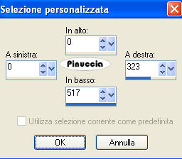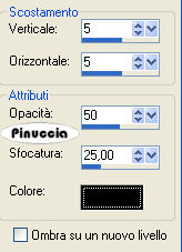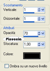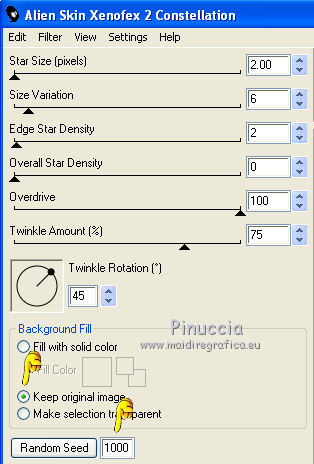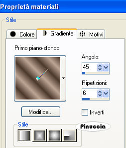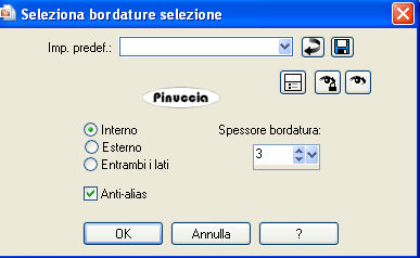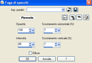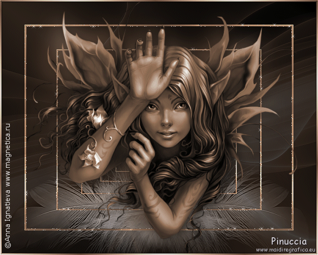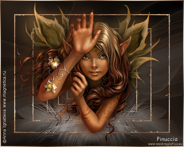 qui puoi trovare qualche risposta ai tuoi dubbi. Se l'argomento che ti interessa non è presente, ti prego di segnalarmelo. Questo tutorial è stato scritto con PSP X2, ma può essere eseguito anche con le altre versioni di PSP. Per tradurlo, l'ho eseguito con PSP X. Occorrente: Un tube a scelta. Il resto del materiale qui Filtri: Alien Skin Xenofex qui Ti servirà anche Animation Shop qui Scegli dal tube un colore chiaro e impostalo come colore di primo piano, e un colore scuro e impostalo come colore di sfondo. Io ho usato #bda593 e #4c382c. Nella paletta dei materiali prendi nota dei valori di tonalità e saturazione del colore di primo piano. Ti serviranno per applicare il viraggio all'immagine di sfondo. ![]() Apri 200704010925-1043.jpg. Duplica l'immagine usando sulla tastiera la combinazione di tasti shift(maiuscola)+D, e chiudi l'originale. Immagine>Ridimensiona - 646 x 517 pixels, tutti i livelli selezionato. ![]() Regola>Tonalità e saturazione>Viraggio: e trascrivi i valori che hai annotato: ![]() Regola>Messa a fuoco>Metti a fuoco. Selezione>Seleziona tutto. Selezione>Modifica>Contrai - 50 pixels. Selezione>Modifica>Seleziona bordature selezione. ![]() Modifica>Copia. Livelli>Nuovo livello raster. Modifica>Incolla nella selezione. Selezione>Deseleziona. non vedrai niente. Non preoccuparti e continua. Effetti>Effetti di riflesso>Fuga di specchi. ![]() Effetti>Effetti di bordo>Aumenta. Avrai questo: ![]() Attiva lo strumento Selezione ![]() clicca sull'icona Selezione personalizzata ![]() e imposta i seguenti settaggi: ![]() Modifica>Copia. Livelli>Nuovo livello raster. Modifica>Incolla nella selezione. Selezione>deseleziona. Immagine>Rifletti. Attiva nuovamente il livello Raster 1. Selezione>Selezione personalizzata ![]() Clicca ok per accettare i settaggi precedenti. Selezione>Inverti. Premi sulla tastiera il tasto CANC. Selezione>Deseleziona. Attiva il livello superiore. Livelli>Unisci>Unisci giù. ![]() Attiva il livello di sfondo. Livelli>Duplica. Cambia la modalità di miscelatura di questo livello in Differenza, e abbassa l'opacità al 70%. ![]() Effetti>Effetti 3D>Sfalsa ombra, con i seguenti settaggi, colore nero: ![]() Apri federn.psd. Attiva il livello Cadre1 e vai a Modifica>copia. Torna al tuo lavoro e vai a Modifica>incolla come nuovo livello. Immagine>Ruota per gradi - 90 gradi a sinistra: ![]() Immagine>Ridimensiona, all'85%, tutti i livelli non selezionato. Cambia la modalità di miscelatura di questo livello in Luminanza (Esistente), e abbassa l'opacità al 70%. Spostalo in basso sul bordo e un po' più a sinistra.La mia posizione: Pos.x: -5,00 Pos.y: 277,00 attivando lo strumento Puntatore potrai controllare la posizione sulla barra superiore degli strumenti![]() Livelli>Duplica. Immagine>Rifletti. Livelli>Unisci>Unisci giù. Attiva il livello superiore. Apri il tuo tube e vai a Modifica>Copia. Torna al tuo lavoro e vai a Modifica>Incolla come nuovo livello. Livelli>Duplica. Livelli>Disponi>Sposta giù. Effetti>Effetti di distorsione>Vento, da destra - intensità 80. ![]() Regola>Sfocatura>Sfocatura gaussiana, raggio 20. ![]() Abbassa l'opacità di questo livello all'80%. Attiva nuovamente il livello superiore. Effetti>Effetti 3D>Sfalsa ombra, con i seguenti settaggi, colore nero: ![]() Livelli>Nuovo livello raster. Selezione>Seleziona tutto. Selezione>Modifica>Seleziona bordature selezione, con i settaggi precedenti. Passa il colore di primo piano a Gradiente, con i seguenti settaggi: ![]() Riempi la selezione con il gradiente.Selezione>Deseleziona. Effetti>Effetti di bordo>Aumenta. Effetti>Effetti 3D>Sfalsa ombra, con i seguenti settaggi, colore nero: ![]() Ripeti l'Effetto Sfalsa ombra, cambiando verticale e orizzontale con -1. Questo è il momento, se vuoi, di aggiungere il tuo nome e/o il tuo watermark. Attiva il livello Raster 1. Effetti>Plugins>Alien Skin Xenofex - Constellation: ![]() Modifica>Copia unione. Apri Animation Shop e vai a Modifica>Incolla>Incolla come nuova animazione. Torna in PSP. Modifica>Annulla azione Constellation. Ripeti l'Effetto Constellation, cliccando una volta su Random Seed. Modifica>Copia Unione. Torna in Animation Shop e vai a Modifica>Incolla>Incolla dopo il fotogramma corrente. Ancora in PSP. Modifica>Annulla azione Constellatin. Ripeti l'Effetto Constellation, cliccando una volta su Random Seed. Modifica>Copia unione. Per finire in Animation Shop: Modifica>Incolla>Incolla dopo il fotogramma corrente. Controlla il risultato cliccando su Visualizza e salva in formato jpg.Variazione con l'applicazione del viraggio anche al tube. ![]() ![]() Se hai problemi o dubbi, o trovi un link non funzionante, o anche soltanto per un saluto, scrivimi. 29 Luglio 2008 |