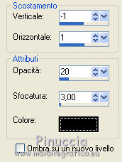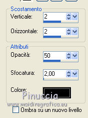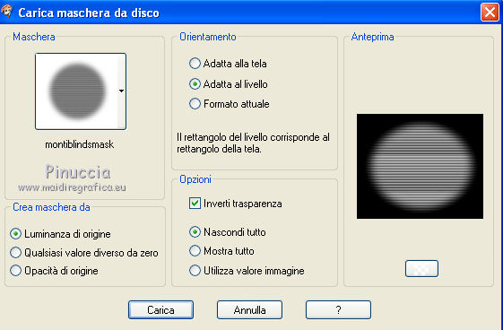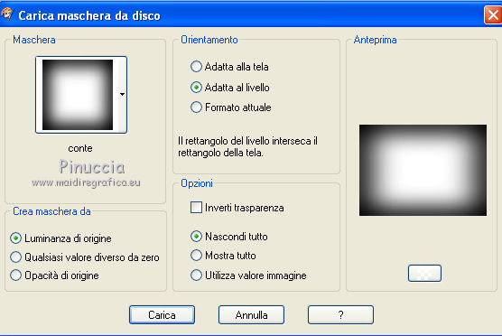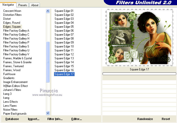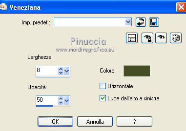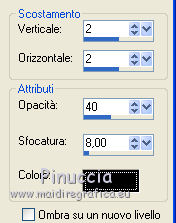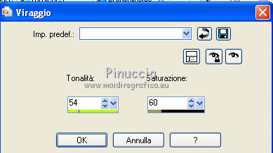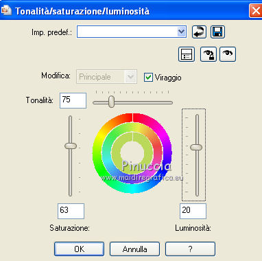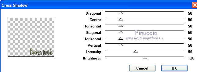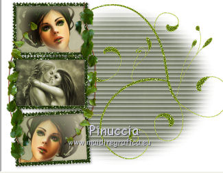qui puoi trovare qualche risposta ai tuoi dubbi. Se l'argomento che ti interessa non è presente, ti prego di segnalarmelo. Questo tutorial è stato scritto con PSP X2, ma può essere eseguito anche con le altre versioni di PSP. Per tradurlo, ho usato PSP X. ©Biene - tutti i diritti riservati. Il © della traduzione è mio. Occorrente: A scelta due tubes adatti. Per il mio esempio ho usato due tubes ©Acidlullaby. Visita il bel sito di Wen-Xi Chen aka Acidlullaby http://acidlullaby.deviantart.com" qui Lo scrapkit Verde di Seachelle che trovi sotto la sezione Free Scraps http://seachellscrapz.blogspot.com/qui Il resto del materiale qui Un ringraziamento ai creatori di tubes dei vari gruppi cui appartengo. Il watermark di ognuno è inserito nei tubes. Per favore, rispetta il lavoro degli autori: non cambiare il nome del file e non rimuovere il watermark. Il © appartiene agli artisti originali. Filtri Graphics Plus - Cross Shadow qui Filters Unlimited 2.0 qui Metti le maschere montiblindsmask.jpg e Conte.PspMask nella cartella Maschere. Metti il pennello BrokenHeartBrushes-BBL07.PspBrush nella cartella Pennelli. Attenzione, il pennello è composto da due files che non devono essere separati. Vedi gli appunti sui pennelli qui Apri una nuova immagine bianca 660 x 500 pixels. ![]() Livelli>Nuovo livello raster. Selezione>Seleziona tutto. Dallo scrapkit di Seachell apri Seachell_Verde_Paper2.png e vai a Modifica>Copia. Torna al tuo lavoro e vai a Modifica>Incolla nella selezione. Selezione>Deseleziona. Livelli>Carica/Salva maschera>Carica maschera da disco. Cerca e carica la maschera montiblindsmask.jpg: ![]() Livelli>Unisci>Unisci gruppo. Dallo scrapkit apri Seachell_Verde_Element41.png e vai a Modifica>Copia. Torna al tuo lavoro e vai a Modifica>Incolla come nuovo livello. Immagine>Ridimensiona, al 60%, tutti i livelli non selezionato. Regola>Tonalità e saturazione>Tonalità/Saturazione/Luminosità. ![]() Effetti>Effetti di bordo>Aumenta. Sposta l'elemento completamente a destra, un po' fuori dall'immagine.Dallo scrapkit apri Seachelle_Verde_Element43.png e vai a Modifica>Copia. Torna al tuo lavoro e vai a Modifica>Incolla come nuovo livello. Immagine>Ridimensiona, al 60%, tutti i livelli non selezionato. Sposta la cornice a sinistra.Apri il primo tube. *** Attiva lo strumento Selezione ,e seleziona la parte di tube che vuoi inserire nella cornice superiore. Modifica>Copia. Torna al tuo lavoro e vai a Modifica>Incolla come nuovo livello. Posiziona la selezione nella cornice,Se necessario, ingrandisci la selezione. Livelli>Disponi>Sposta giù. Livelli>Duplica. Posiziona correttamente il duplicato nela cornice superiore.Attiva nuovamente il livello superiore della cornice. Attiva lo strumento Bacchetta magica , sfumatura e tolleranza 0,e clicca al centro della cornice superiore per selezionarla. Selezione>Modifica>Espandi - 3 pixels. Selezione>Inverti. Attiva il livello sottostante del tube. Premi sulla tastiera il tasto CANC. Selezione>Deseleziona. Livelli>Carica/Salva maschera>Carica maschera da disco. Cerca e carica la maschera conte.PspMask. ![]() Livelli>Unisci>Unisci gruppo. *** Attiva il livello originale del tube. Immagine>Rifletti. Posiziona correttamente l'immagine nella cornice in basso.Attiva nuovamente il livello superiore (le cornici). Clicca al centro della cornice inferiore con la bacchetta magica ![]() Selezione>Modifica>Espandi - 3 pixels. Selezione>Inverti. Attiva il livello del tube inserito nella cornice inferiore. Premi sulla tastiera il tasto CANC. Livelli>Carica/Salva maschera>Carica maschera da disco. Carica nuovamente la maschera Conte.PspMask. Livelli>Unisci>Unisci gruppo. Apri il tuo secondo tube. Ripeti il passaggio da *** a *** per la cornice al centro. Cambia la modalità di miscelatura di questo livello in Luminanza. Dallo scrapkit apri Seachell_Verde_Paper4.png. Attiva lo strumento Selezione , rettangolo,e traccia una selezione come nell'esempio. ![]() Modifica>Copia. Torna al tuo lavoro e vai a Modifica>Incolla come nuovo livello. Immagine>Ruota per gradi - 90 gradi a sinistra. ![]() Posiziona la carta nell'area delle cornici.Nella paletta dei livelli sposta questo livello sotto il livello delle tre immagini in cornice. Attiva il livello superiore (le cornici). Clicca con la bacchetta magica al centro delle tre cornici.Selezione>Modifica>Espandi - 3 pixels. Selezione>Inverti. Attiva il livello della carta e premi sulla tastiera il tasto CANC. Selezione>Deseleziona. Chiudi tutti i livelli sotto il livello delle cornici. Attiva uno dei livelli visibili. Livelli>Unisci>Unisci visibile. Adesso puoi riaprire i livelli chiusi (Livelli>Visualizza>Tutto). Attiva nuovamente il livello superiore. Effetti>Effetti 3D>sfalsa ombra, con il colore nero. ![]() Dallo scrapkit apri Seachelle_Verde_Element24.png e vai a Modifica>Copia. Torna al tuo lavoro e vai a Modifica>Incolla come nuovo livello. Immagine>Ridimensiona, al 55%, tutti i livelli non selezionato. Immagine>Ruota per gradi - 90 gradi a destra. ![]() Regola>Messa a fuoco>Metti a fuoco. Effetti>Effetti 3D>Sfalsa ombra, con il colore nero. ![]() Sposta l'elemento a destra della cornice.Livelli>Duplica. Immagine>Rifletti. Immagine>Capovolgi. Posiziona correttamente l'elemento a sinistra della cornice.![]() Dallo scrapkit apri Seachell_Verde_Element13.png e vai a Modifica>Copia. Torna al tuo lavoro e vai a Modifica>Incolla come nuovo livello. Immagine>Ridimensiona, al 18%, tutti i livelli non selezionato. Regola>Messa a fuoco>Metti a fuoco. Effetti>Effetti 3D>Sfalsa ombra, con il colore nero. ![]() Sposta il fiore in basso a sinistra della cornice.Livelli>Duplica. Sposta questo fiore in alto a destra della cornice.Dallo scrapkit apri Seachell_Verde_Element35.png e vai a Modifica>Copia. Torna al tuo lavoro e vai a Modifica>Incolla come nuovo livello. Immagine>Ridimensiona, al 40%, tutti i livelli non selezionato. Regola>Messa a fuoco>Metti a fuoco. Regola>Tonalità e saturazione>Viraggio. ![]() Effetti>Effetti 3D>Sfals
