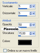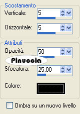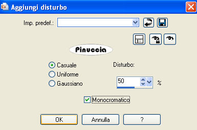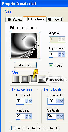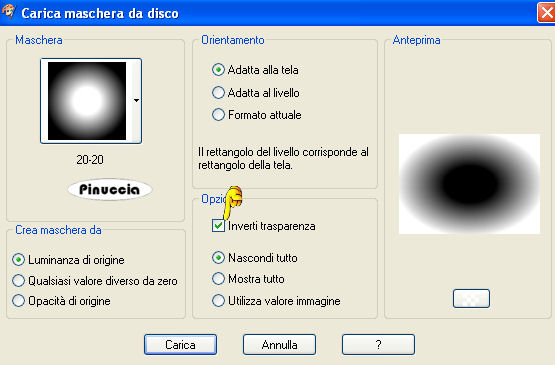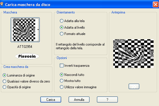 qui puoi trovare qualche risposta ai tuoi dubbi. Se l'argomento che ti interessa non è presente, ti prego di segnalarmelo. Questo tutorial è stato scritto con PSP X2, ma può essere eseguito anche con le altre versioni di PSP. Per tradurlo, ho usato PSP X. Occorrente: Un tube a scelta. Il resto del materiale qui I tubes che ho usato sono di Bichito, MTM (Brigitte) e Lut. Metti le maschere ATT02954.jpg e 20.20.bmp nella cartella Maschere. Metti il motivo argento Muster-Silber-jpg nella cartella Motivi. Rispetta il lavoro degli autori e mantieni inalterati i tubes. Ti servirà anche Animation Shop qui Imposta il colore di primo piano con il bianco, e il colore di sfondo con il nero. Apri una nuova immagine trasparente 700 x 500 pixels, e riempila con il colore di primo piano.Livelli>Nuovo livello raster. Riempi questo livello con il colore nero.Livelli>Carica/Salva maschera>Carica maschera da disco. Cerca e carica la maschera ATT02954.jpg. ![]() Livelli>Unisci>Unisci gruppo. Livelli>Nuovo livello raster. Riempi con il colore nero.Livelli>Carica/Salva maschera>Carica maschera da disco. Cerca e carica la maschera 20-20.bmp: ![]() Livelli>Unisci>Unisci gruppo. Apri il tube Lut schaakspel 18-3-2008.psp, e vai a Modifica>Copia. Torna al tuo lavoro e vai a Modifica>Incolla come nuovo livello. Immagine>Ridimensiona, all'85%, tutti i livelli non selezionato, 2 volte. Sposta la scacchiera nell'angolo in basso a destra.Ingrandisci l'immagine almeno al 400%, usando lo zoom o la rotellina del mouse.Attiva lo strumento Selezione , rettangolo, sfumatura 0,e traccia una selezione come nell'esempio. ![]() Se non riesci a selezionare correttamente la bottiglia, vai a Selezione>Modifica selezione. Vedrai una superficie rossa sulla selezione. ![]() Con lo strumento Puntatore ![]() potrai ingrandire o rimpicciolire la selezione. Per i minimi spostamenti, puoi usare le frecce della tastiera. Devi avere pazienza, perchè la selezione deve essere precisa, e la striscia grigia a sinistra deve rimanere al di fuori della selezione. ![]() sull'uso dello strumento Puntatore vedi qui, sull'uso delle frecce della tastiera applicate allo strumento Spostamento-puntatore vedi qui Quando hai finito, clicca nuovamente su Selezione>Modifica selezione, per far sparire l'area rossa. Premi sulla tastiera il tasto CANC ![]() Livelli>Duplica. Livelli>Disponi>Sposta giù. Effetti>Effetti di distorsione>Vento: ![]() Regola>sfocatura>Sfocatura gaussiana, raggio 20. ![]() Attiva il livello superiore. Effetti>effetti 3D>Sfalsa ombra, con i seguenti settaggi, colore nero: ![]() Attiva il livello gruppo Raster 2 (la maschera 20-20). Apri Mtm-Man 102-12 July 2006.psp, e vai a Modifica>copia. Torna al tuo lavoro e vai a Modifica>Incolla come nuovo livello. Immagine>Ridimensiona, al 70%, tutti i livelli non selezionato. Ripeti Immagine>Ridimensiona, questa volta all'85%. Posiziona il tube a destra,vedi il mio esempio per controllare la posizione. Se qualcosa dovesse rimanere visibile sotto il tavolo, puoi usare la gomma per cancellarlo.Effetti>Effetti 3D>Sfalsa ombra, con i seguenti settaggi, colore nero. ![]() Attiva nuovamente il livello Raster 2. Apri il tuo tube e vai a Modifica>copia. Torna al tuo lavoro e vai a Modifica>Incolla come nuovo livello. Ridimensiona il tube, se necessario, e posizionalo a sinistra.Livelli>Duplica. Livelli>Disponi>Sposta giù. Effetti>Effetti di distorsione>Vento - con il settaggio precedente, ma da sinistra. ![]() Regola>Sfocatura>Sfocatura gaussiana, raggio 20. Attiva il livello superiore. Effetti>Effetti 3D>sfalsa ombra, con i seguenti settaggi, colore nero: ![]() Livelli>Nuovo livello raster. Selezione>seleziona tutto. Selezione>modifica>Contrai - 1 pixel. Selezione>inverti. Passa il colore di primo piano a Motivi, e seleziona il motivo argento Muster-silber. ![]() Riempi la selezione con questo motivo.Selezione>Deseleziona. Livelli>Unisci>Unisci tutto. Metti da parte questa immagine per il momento. Apri una nuova immagine trasparente 750 x 536 pixels. Passa il colore di primo piano a Gradiente di primo piano sfondo: ![]() Riempi l'immagine trasparente con il gradiente.Immagine>Rifletti. a questo punto apro una parentesi. Nel tutorial originale, pur con le stesse impostazioni l'angolo glitterato copre anche la parte nera. ![]() ![]() Come l'autrice stessa mi ha confermato, con PSP queste cose possono succedere, e mi ha suggerito di giocare con le impostazioni per ottenere un angolo glitterato completo. Non ci sono riuscita. Il mio espediente è stato di selezionare il glitter, copiarlo e poi incollarlo nella parte nera. Ho dovuto impiegare due livelli, e alla fine, unendoli, il risultato è stato questo: ![]() Se vuoi il mio sfondo clicca qui, ma ti consiglio di cercare di ottenere questo risultato da solo per fare esperienza. Continua con il tutorial: Attiva lo strumento Selezione a mano libera , da punto a punto,spianamento e sfumatura 0, e traccia una selezione come nell'esempio. ![]() Modifica>copia. Livelli>Nuovo livello raster. Modifica>Incolla nella selezione. Selezione>Deseleziona. Rinomina questo livello Disturbo. Livelli>duplica, 2 volte. Attiva il livello Disturbo. Regola>Aggiungi/Rimuovi disturbo/Aggiungi disturbo, con i seguenti settaggi. ![]() attiva Copia di Disturbo. Ripeti Aggiungi disturbo, ma cambiando il valore a 65. Chiudi questo livello. Attiva il livello della seconda copia di Disturbo. Ripeti Aggiungi disturbo, portando il valore a 80. Chiudi questo livello. Livelli>Nuovo livello raster. Selezione>Seleziona tutto. Selezione>modifica>Contrai - 1 pixel. Selezione>inverti. Riempi la selezione con il motivo argento.Selezione>Deseleziona. Attiva l'immagine che hai messo da parte e vai a Modifica>copia. Torna al nuovo lavoro e vai a Modifica>incolla come nuovo livello. Questo è il momento di aggiungere il tuo nome e/o il tuo watermark. Controlla che sia visibile il livello Disturbo e che i livelli delle due copie siano chiusi. ![]() Modifica>Copia unione. Apri Animation Shop e vai a