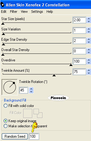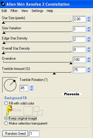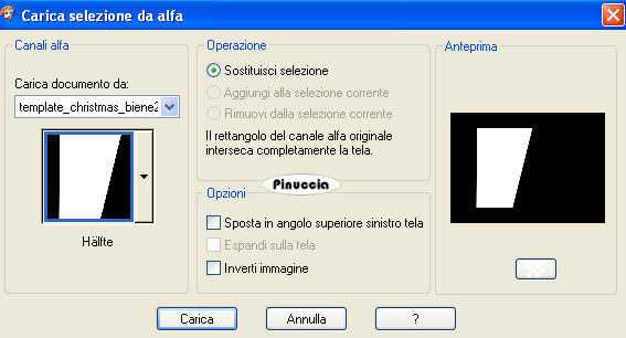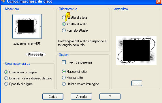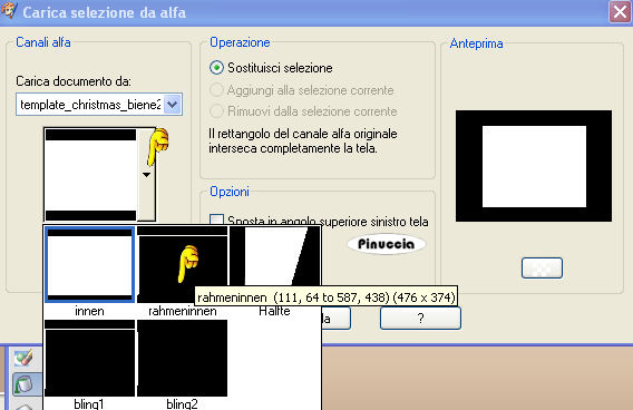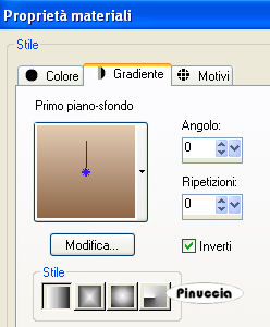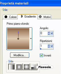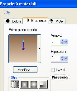 qui puoi trovare qualche risposta ai tuoi dubbi. Se l'argomento che ti interessa non è presente, ti prego di segnalarmelo. Questo tutorial è stato scritto con PSP X, ma può essere eseguito anche con le altre versioni di PSP. Occorrente: Materiale qui Rispetta il lavoro degli autori e mantieni inalterati i tubes. Filtri: Greg's Factory Output II qui Alien Skin Xenofex qui Ti servirà anche Animation Shop qui Imposta il colore di primo piano con #e1cbb3, e il colore di sfondo con #8e6748. Apri template_christmas_biene2007.pspimage. L'immagine - che sarà la base del tuo lavoro - non è vuota, ma contiene le selezioni salvate sul canale alfa. Riempi l'immagine con il colore di primo piano.Passa il colore di primo piano a Gradiente di primo piano/sfondo, con i seguenti settaggi: ![]() Livelli>Nuovo livello raster. Riempi il livello con il gradiente.Livelli>Carica/salva maschera>Carica maschera da disco. Cerca e carica la maschera Zuzzana mask391: ![]() Livelli>Unisci>Unisci gruppo. non preoccuparti se i colori del tuo lavoro non ti sembreranno uguali a quelli dell'esempio finale. Alla fine saranno uguali Selezione>Carica/Salva selezione>Carica selezione da canale alfa. E' già presente la selezione innen. Devi soltanto cliccare Carica. ![]() Premi sulla tastiera il tasto CANC ![]() Livelli>Nuovo livello raster. Cambia i settaggi del gradiente. ![]() Riempi la selezione con il gradiente.Mantieni selezionato. Abbassa l'opacità di questo livello al 70%. Regola>Sfocatura>Sfocatura gaussiana, raggio 24. ![]() Selezione>Deseleziona. Livelli>Carica/Salva selezione>Carica selezione da canale alfa. Apri il menu cliccando sulla freccia a fianco del box, seleziona Rahmeninnen e Carica. ![]() Riempi la selezione con il gradiente.Assicurati di aver riempito entrambe le cornici. Eventualmente, per vedere meglio allarga l'immagine attivando lo zoom o usando la rotellina del mouse.![]() Selezione>Deseleziona. Apri Mtm_Misc 194-20 Dec 2007.psp e vai a Modifica>Copia. Torna al tuo lavoro e vai a Modifica>Incolla come nuovo livello. Immagine>Ridimensiona, al 77%, tutti i livelli non selezionato. Selezione>Carica/Salva selezione>Carica selezione da canale alfa. Cerca e carica la selezione Hälfte. ![]() Premi sulla tastiera il tasto CANC. Selezione>Deseleziona. Effetti>Effetti 3D>Sfalsa ombra: ![]() Apri Mtm_Face 120-17 dec 2007.psp, e vai a Modifica>Copia. Torna al tuo lavoro e vai a Modifica>Incolla come nuovo livello. Immagine>Ridimensiona, al 65%, tutti i livelli non selezionato. Sposta il tube a sinistra nella cornice interna.Abbassa l'opacità di questo livello al 60%. Selezione>Carica/Salva selezione>Carica selezione da canale alfa. E' presente la selezione Innen. Carica. Selezione>inverti. Premi sulla tastiera il tasto CANC. in questo modo tutte le tracce dei tubes all'esterno della cornice saranno eliminate. Selezione>Deseleziona. Attiva il livello Gruppo Raster 2 (il livello della maschera). Selezione>Carica/Salva maschera>Carica maschera da disco. Cerca e carica la maschera bling1. ![]() Modifica>copia. Livelli>Nuovo livello raster. Modifica>Incolla nella selezione. Selezione>Deseleziona. Rinomina questo livello Bling 1. Livelli>Duplica, per due volte. Attiva il livello Bling 1. Effetti>Plugins>Alien Skin - Xenofex 2 - Constellation. ![]() Attiva il livello Copia di bling1. Ripeti l'Effetto Constellation, con gli stessi settaggi ma cambiando Random Seed con 100. ![]() Chiudi il livello. Attiva il livello Copia (2) di Bling1. Ripeti l'Effetto Constellation con Random Seed a 200. Chiudi il livello. Attiva il livello superiore. Apri sternchen_biene.pspimage, e vai a Modifica>copia. Torna al tuo lavoro e vai a Modifica>Incolla come nuovo livello. Posiziona le stelle in alto, sul testo della maschera.Effetti>Effetti 3D>Sfalsa ombra, con i seguenti settaggi, colore nero. ![]() Attiva lo strumento Testo , e scegli un bel font.Io ho usato Scriptina, vettore, dimensione 48 pixels, colore di sfondo il gradiente. Scrivi il tuo testo. Oggetti>Allinea>Centra orizz. nella tela. Livelli>Converti in livello raster. Effetti>Effetti 3D>Sfalsa ombra, con i seguenti settaggi, colore nero. ![]() Questo è il momento di aggiungere il tuo nome e/o il tuo watermark. Livelli>Nuovo livello raster. Attiva lo strumento Pennello ![]() Cerca e seleziona il pennello lynd04-009 002.PspBrush, e applicalo con il colore di primo piano nell'angolo in alto a sinistra. Livelli>Duplica. Immagine>Rifletti. Livelli>Unisci>Unisci giù. Livelli>Duplica. Immagine>Capovolgi. Livelli>Unisci>Unisci giù. Effetti>Plugins>Greg's Factory Output II - Pool Shadow: ![]() Livelli>Nuovo livello raster. Applica nuovamente il pennello con il tasto destro del mouse per usare il colore di sfondo. Livelli>Duplica. Immagine>Rifletti. Livelli>Unisci>Unisci giù. Livelli>Duplica. Immagine>Capovolgi. Livelli>Unisci>Unisci giù. Effetti>Plugins>Greg's Factory Output II - Pool Shadow, con i settaggi precedenti. Immagine>Rifletti. Cambia i settaggi del gradiente. ![]() Livelli>Nuovo livello raster. Selezione>Seleziona tutto. Selezione>modifica>Contrai, di 6 pixels. Riempi la selezione con il gradiente.Selezione>Modifica>Contrai, di 1 pixel. Premi sulla tastiera il tasto CANC. Selezione>Seleziona tutto. Selezione>modifica>contrai di 1 pixel. Selezione>Inverti. Riempi la selezione con il gradiente.Selezione>Deseleziona. Attiva il livello Gruppo Raster 2 (il livello della maschera). Selezione>Carica/Salva selezione>Carica selezione da canale alfa. Cerca e carica la selezione Bling 2. ![]() Modifica>copia. Attiva il livello superiore. Livelli>Nuovo livello raster. Modifica>incolla nella selezione. Selezione>Deseleziona. Rinomina questo livello Bling 2. Livelli>Duplica, per due volte. Attiva il livello Bling 2. Effetti>Plugins>Alien Skin - Xenofex 2 - Constellation, con i settaggi precedenti. ![]() Attiva il livello Copia di Bling 2. Ripeti l'Effetto Constellation impostando Random Seed a 100. Chiudi il livello. Attiva il livello Copia (2) di Bling 2. Ripeti l'Effett