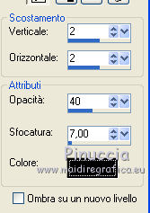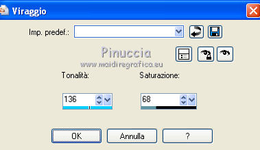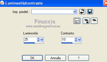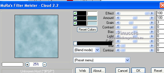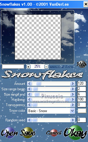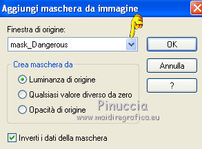qui puoi trovare qualche risposta ai tuoi dubbi. Se l'argomento che ti interessa non è presente, ti prego di segnalarmelo. Questo tutorial è stato scritto con PSP X2, ma può essere eseguito anche con le altre versioni di PSP. Per tradurlo, ho usato PSP X. ©Biene - tutti i diritti riservati. Il © della traduzione è mio. Occorrente: A scelta il tube di un personaggio e di un paesaggio invernale o natalizio. Il Template14bysyl2009.psd di Sylvie che puoi scaricare http://syllycreationz.blogspot.com/?zx=aa1c153d5c38bfe1 qui, sotto il pacchetto 8.september 2009. Sul sito Creativemistfits http://creativemisfitscreations.blogspot.com/2009_09_01_archive.html qui Il resto del materiale qui Il tube che ho usato è un poser©LagunaAzul. Il tube del paesaggio è di Lila Il tube del fiocco di neve è di Janaly. Un ringraziamento ai creatori di tubes dei vari gruppi cui appartengo. Il watermark di ognuno è inserito nei tubes. Per favore, rispetta il lavoro degli autori: non cambiare il nome del file e non rimuovere il watermark. Il © appartiene agli artisti originali. ![]() Filtri: Mura's Meister - Cloud qui VanDerLee - Snowflakes qui Ti servirà anche Animation Shop qui Scegli due colori dal tuo tube, e imposta il colore scuro come colore di primo piano (il mio #72a0ad), e il colore chiaro come colore di sfondo (il mio #bdd7df). Per iniziare, però, imposta il colore di primo piano con il colore bianco. Apri la maschera mask_Dangerous.jpg in PSP e minimizzala insieme al resto del materiale. Apri il Template. Duplicalo usando la combinazione di tasti maiuscola+D e chiudi l'originale. Elimina i livelli del copyright, "black square left" e "black square night". Apri e attiva il livello "background". Premi sulla tastiera il tasto CANC. Immagine>Dimensione - 600 x 600 pixels. ![]() Riempi il livello con il colore bianco.Livelli>Nuovo livello raster. Imposta il colore di primo piano con il colore scelto (#72a0ad). Riempi il livello con il colore di primo piano.Effetti>Plugins>Mura's Meister - Cloud, con i settaggi standard. ![]() Livelli>Nuovo livello maschera>Da immagine. Apri il menu sotto la finestra di origine e vedrai la lista dei files aperti. Seleziona la maschera mask_Dangerous con i seguenti settaggi. ![]() Livelli>Unisci>Unisci gruppo. Livelli>Nuovo livello raster. Riempi il livello con il colore di primo piano.Attiva il livello "dotted circle large". Selezione>Seleziona tutto. Selezione>Mobile. Selezione>Immobilizza. Selezione>Inverti. Attiva il livello sottostante. Premi sulla tastiera il tasto CANC. Selezione>Deseleziona. Regola>Aggiungi/Rimuovi disturbo>Aggiungi disturbo. ![]() Effetti>Effetti 3D>Sfalsa ombra, con il colore nero. ![]() Adesso puoi eliminare il livello "dotted circle large". Attiva il livello "pink circle large". Selezione>Seleziona tutto. Selezione>Mobile. Selezione>Immobilizza. Livelli>Nuovo livello raster. Riempi con il colore di sfondo.Selezione>Deseleziona. Regola>Aggiungi/Rimuovi disturbo>Aggiungi disturbo. ![]() Effetti>Effetti 3D>Sfalsa ombra, con il colore nero. ![]() Puoi eliminare il livello "pink circle large". Attiva il livello "white circle". Effetti>Effetti 3D>Sfalsa ombra, con il colore nero. ![]() Attiva il livello "pink circle small. Selezione>Seleziona tutto. Selezione>Mobile. Selezione>Immobilizza. Livelli>Nuovo livello raster. Riempi la selezione con il colore di primo piano.Selezione>Deseleziona. Regola>Aggiungi/Rimuovi disturbo>Aggiungi disturbo. ![]() Effetti>Effetti 3D>Sfalsa ombra, con il colore nero. ![]() Adesso puoi eliminare il livello "pink circle small". Attiva il livello Raster 3. Livelli>Nuovo livello raster. Imposta il colore di primo piano con il bianco, e riempi il livello con questo colore.Attiva il livello "dotted circle small". Selezione>Seleziona tutto. Selezione>Mobile. Selezione>Immobilizza. Selezione>Inverti. Attiva il livello sottostante. Premi sulla tastiera il tsato CANC. Selezione>Deseleziona. Effetti>Effetti 3D>Sfalsa ombra, con il colore nero. ![]() Elimina il livello "dottedcircle small". Attiva il livello "grey rectangle". Selezione>Seleziona tutto. Selezione>Mobile. Selezione>Immobilizza. Livelli>Nuovo livello raster. Riempi la selezione con il colore bianco.Selezione>Deseleziona. Regola>Aggiungi/rimuovi disturbo>Aggiungi disturbo con i settaggi precedenti. ![]() Effetti>Effetti 3D>Sfalsa ombra, con il colore nero. ![]() Ripeti l'Effetto Sfalsa ombra, cambiando verticale e orizzontale con -2. Elimina il livello "Grey rectangle". Chiudi i livelli "background" e "gruppo Raster 1". Livelli>Unisci>Unisci visibile. Livelli>Visualizza>Tutto. Rimani posizionato sul livello Uniti, e sposta l'immagine un po' più in alto e a destra.Vedi il mio esempio per orientarti. Apri fenstergrößer_biene.psd. Attiva il livello "hintergrund_fenster" e vai a Modifica>Copia. Torna al tuo lavoro e vai a Modifica>Incolla come nuovo livello. Rinomina questo livello "sfondo finestra". Attiva nuovamente fenstergrößer_biene.psd. Posizionati sul livello Fenster e vai a Modifica>Copia. Torna al tuo lavoro e vai a Modifica>Incolla come nuovo livello. La finestra dovrebbe trovarsi correttamente sopra lo sfondo. Per spostare contemporaneamente sfondo e finestra senza unire i livelli, collegali, assegnando ai livelli lo stesso numero. ![]() Sposta sfondo e finestra un po' più in alto e a sinistra, pressappoco come nel mio esempio. ![]() Attiva nuovamente il livello "sfondo finestra". Apri la tua immagine invernale e vai a Modifica>Incolla come nuovo livello. Posiziona correttamente il tube nell'area dello sfondo.Regola>Tonalità e saturazione>Viraggio. valori corrispondenti al tuo colore di primo piano. ![]() Regola>Luminosità e contrasto>Luminosità e contrasto. ![]() Eventualmente ripeti (decidi in base ai colori delle tue immagini). Attiva nuovamente il livello "sfondo finestra". Selezione>Seleziona tutto. Selezione>Mobile. Selezione>Immobilizza. Selezione>Inverti. Attiva il livello soprastante del paesaggio. Premi sulla tastiera il tasto CANC. 