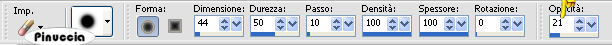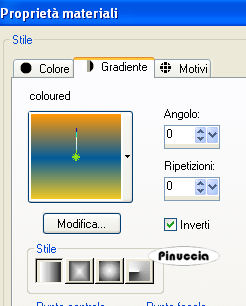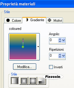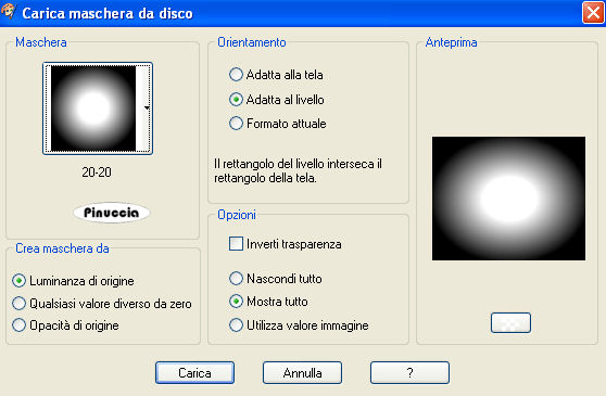 qui puoi trovare qualche risposta ai tuoi dubbi. Se l'argomento che ti interessa non è presente, ti prego di segnalarmelo. Questo tutorial è stato scritto con PSP X2, ma può essere eseguito anche con le altre versioni di PSP. Per tradurlo, l'ho eseguito con PSP X. Occorrente: Materiale qui I tubes che ho usato sono di Nightangel, Suzi Sgai e Mou. Rispetta il lavoro degli autori e mantieni inalterati i tubes. Filtro: Graphics Plus qui Metti il Gradiente "coloured" nella cartella Gradienti. Metti il motivo Gold Foil nella cartella Motivi. Metti la maschera 20-20 nella cartella Maschere. Imposta il colore di primo piano con #c24989, e il colore di sfondo con #fe9807. Passa il colore di primo piano a Gradiente e seleziona il gradiente "coloured", con i seguenti settaggi: ![]() Apri una nuova immagine trasparente 700 x 500 pixels, e riempila con il gradiente.Regola>Sfocatura>Sfocatura gaussiana, raggio 20. ![]() Apri mou_retro flower1.pspimage, e vai a Modifica>Copia. Torna al tuo lavoro e vai a Modifica>Incolla come nuovo livello. Immagine>Ridimensiona, al 112%, tutti i livelli non selezionato. Cambia la modalità di miscelatura di questo livello in Luminanza (esistente). Attiva il livello Raster 1. Apri SS_220.psp, e vai a Modifica>Copia. Torna al tuo lavoro e vai a Modifica>Incolla come nuovo livello. Immagine>Ridimensiona, all'80%, tutti i livelli non selezionato. Sposta l'uccello un po' più a sinistra, e in alto.![]() Livelli>Carica/Salva maschera>Carica maschera da disco. Cerca e carica la maschera 20-20.bmp: ![]() Livelli>Unisci>Unisci gruppo. Cambia la modalità di miscelatura di questo livello in Luminanza. Attiva il livello superiore. Apri Blow_Job_misted_na_06.10.2005.pspimage, e vai a Modifica>Copia. Torna al tuo lavoro e vai a Modifica>Incolla come nuovo livello. Sposta il tube a sinistra.Livelli>Duplica. Attiva il livello Raster 2. Attiva lo strumento Gomma con i seguenti settaggi.![]() e cancella i segni dei fiori dal viso della donna: ![]() Livelli>Unisci>Unisci tutto. Livelli>Nuovo livello raster. Selezione>Seleziona tutto. Selezione>modifica>Contrai, 11 pixels. Passa il colore di sfondo a Motivi e seleziona il motivo Gold Foil: ![]() Riempi la selezione con il motivo oro.Selezione>modifica>Contrai, 1 pixel. Premi sulla tastiera il tasto CANC ![]() Selezione>Deseleziona. Livelli>Nuovo livello raster. Selezione>Seleziona tutto. Selezione>Modifica>Contrai, 10 pixels. Selezione>Inverti. Riempi la selezione con il gradiente.Effetti>Plugins>Graphics Plus - Cross Shadow. ![]() Selezione>Deseleziona. Livelli>Unisci>Unisci giù. Livelli>Nuovo livello raster. Selezione>Seleziona tutto. Selezione>modifica>Contrai, 11 pixels. Effetti>Effetti 3D>Ritaglio: ![]() Livelli>Nuovo livello raster. Ripeti l'Effetto Ritaglio, ma cambiando verticale e orizzontale con -5. Selezione>Deseleziona. Attiva lo strumento Testo , e scegli un font.Io ho usato il font Chlorinut, dimensione 72. Inverti i colori nella paletta dei materiali, e cambia il settaggio del gradiente togliendo la spunta a Inverti: ![]() ![]() Scrivi il tuo testo e posizionalo in basso. Livelli>Converti in livello raster. Selezione>Seleziona tutto. Selezione>Mobile. Selezione>modifica>Contrai, 2 pixels. Modifica>Copia. Premi sulla tastiera il tasto CANC. Livelli>Nuovo livello raster. Modifica>Incolla nella selezione. Selezione>Deseleziona. Abbassa l'opacità di questo livello al 65%. Attiva il livello sottostante, quello del testo. Effetti>Effetti 3D>Sfalsa ombra, con i seguenti settaggi, colore nero: ![]() Attiva nuovamente il livello superiore. Livelli>Unisci>Unisci giù. Livelli>Nuovo livello raster. Selezione>Seleziona tutto. Selezione>Modifica>Contrai, di 1 pixel. Selezione>Invert. Riempi la selezione con il motivo oro.Aggiungi il tuo nome e/o il tuo watermark. Livelli>Unisci>Unisci tutto e salva in formato jpg. ![]() Se hai problemi o dubbi, o trovi un link non funzionante, o anche soltanto per un saluto, scrivimi 7 Aprile 2008 |