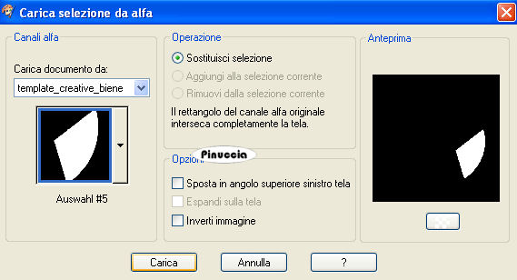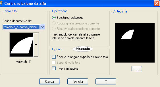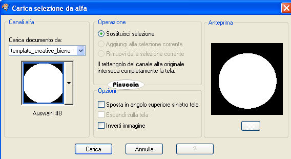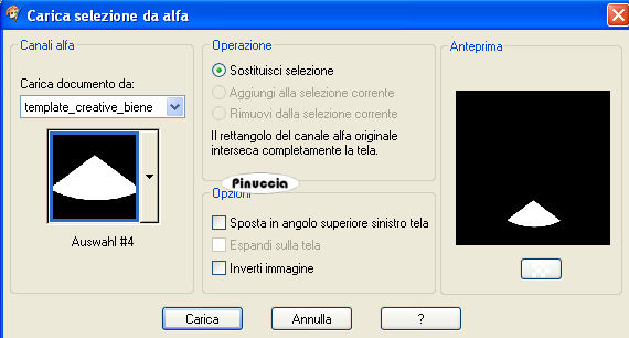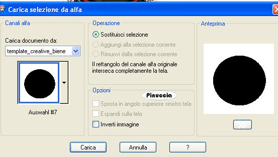 qui puoi trovare qualche risposta ai tuoi dubbi. Se l'argomento che ti interessa non è presente, ti prego di segnalarmelo. Questo tutorial è stato scritto con PSP X2, ma può essere eseguito anche con le altre versioni di PSP. Per tradurlo, ho usato PSP X. ©Biene - tutti i diritti riservati. Il © della traduzione è mio. Occorrente: Il tube di una donna. Il resto del materiale qui I tubes che ho usato per i miei esempi sono di Angelface, Alejandra Rosales e Lori Rhae. Ho usato il Template 8 di Sapphire che puoi trovare http://sapphiressplendor.blogspot.com/2009/06/new-template-8.html?zx=a487fdb407129f75" qui La maschera e il tube Diamondcircle sono ©Biene. Il Doodle è di http://cajundesignscrapz.blogspot.com/" Cajun Designz Un ringraziamento ai creatori di tubes dei vari gruppi cui appartengo. Il watermark di ognuno è inserito nei tubes. Per favore, rispetta il lavoro degli autori: non cambiare il nome del file e non rimuovere il watermark. Il © appartiene agli artisti originali. Filtri: Eye Candy 4000 qui Scegli un bel colore dal tuo tube (il mio #4f4449) e impostalo come colore di primo piano. Apri Template8.psd. Duplicalo usando sulla tastiera la combinazione di tasti maiuscola+D e chiudi l'originale. Nascondi i livelli 8 e 9 e attiva il livello Raster 1. ![]() Premi sulla tastiera il tasto CANC ![]() Immagine>Dimensione tela - 620 x 620 pixels. ![]() Riempi con il colore bianco.Livelli>Nuovo livello raster. Riempi con il colore di primo piano.Apri la maschera circlemask_biene.jpg e minimizzala. Torna al tuo lavoro. Livelli>Nuovo livello maschera>Da immagine. Apri il menu sotto la finestra di origine e vedrai la lista dei files aperti. Seleziona la maschera con i seguenti settaggi. ![]() Livelli>Unisci>Unisci gruppo. Apri CajunDoodlie8_ajundesignz.pspimage. Attiva lo strumento Selezione , rettangolo, sfumatura 0,e traccia una selezione come nell'esempio. ![]() Modifica>Copia. Torna al tuo lavoro e vai a Modifica>Incolla come nuovo livello. Sposta l'immagine nell'angolo a sinistra (guarda il mio esempio per orientarti).![]() Livelli>Duplica. Immagine>Rifletti. Livelli>Unisci>Unisci giù. Livelli>Duplica. Immagine>Capovolgi. Livelli>Unisci>Unisci giù. Effetti>Effetti 3D>Sfalsa ombra, con i seguenti settaggi, colore nero. ![]() Attiva il livello Raster 3. Selezione>Seleziona tutto. Selezione>Mobile. Selezione>Immobilizza. Selezione>Modifica>Espandi - 2 pixels. Riempi la selezione con il colore di primo piano.Selezione>Deselezione. Attiva il livello Raster 5. Attiva lo strumento Bacchetta magica e clicca sulla parte bianca al centro per selezionarla. Selezione>Modifica>Espandi - 2 pixels. Livelli>Nuovo livello raster. Riempi la selezione con il colore nero.Selezione>Deseleziona. Livelli>Disponi>Sposta giù. Apri il template di Biene "Template_creative_biene" e minimizzalo. questo template contiene le selezioni salvate su canale alfa. Minimizzandolo, queste selezioni saranno disponibili per il tuo lavoro Apri il tuo tube e/o delle selezioni ingrandite di questo tube. Oppure duplica il tube (maiuscola+D) e ingrandiscilo. Modifica>Copia. Torna al tuo lavoro e vai a Modifica>Incolla come nuovo livello. Sposta il tube lasciandone visibile una parte nella sezione in alto a sinistra della stella.Selezione>Carica/Salva selezione>Carica selezione da canale alfa. Carica la selezione Auswahl#1. ![]() Selezione>Inverti. Premi sulla tastiera il tasto CANC. Abbassa l'opacità di questo livello al 46%. Selezione>Deseleziona. Livelli>Duplica. Immagine>Rifletti. Cambia la modalità di miscelatura di questo livello come ti sembra meglio. Per il mio esempio ho cambiato in Luminanza. Modifica>Incolla come nuovo livello (il tube è ancora in memoria). Sposta il tube nella parte inferiore sinistra della stella, lasciando visibile un'altra parte di questo.Selezione>Carica/Salva selezione>Carica selezione da canale alfa. Apri il menu e seleziona Auswahl#3. ![]() Selezione>Inverti. Premi sulla tastiera il tasto CANC. Abbassa l'opacità del livello intorno al 50% (valuta a seconda del tube che stai usando). ![]() Ripeti con le altre parti della stella. Per la sezione inferiore. ![]() carica la selezione Auswahl#4: ![]() Per la sezione a destra: ![]() Carica la selezione Auswahl#5. ![]() Cambia la modalità di miscelatura e abbassa l'opacità a tua scelta. Alla fine dovresti avere pressappoco questo. ![]() Attiva il livello Raster 8. Livelli>Nuovo livello raster. Selezione>Carica/Salva selezione>Carica selezione da canale alfa. Carica la selezione Auswahl#7. ![]() Effetti>Effetti 3D>Sfalsa ombra, con i seguenti settaggi, colore nero. ![]() Selezione>Deseleziona. Attiva il livello Raster 4. Livelli>Nuovo livello raster. Selezione>Carica/Salva selezione>Carica selezione da canale alfa. Carica la selezione Auswahl#8. ![]() Effetti>Effetti 3D>Sfalsa ombra, con i seguenti settaggi, colore nero. ![]() Attiva il livello Raster 2. Ripeti l'Effetto Sfalsa ombra con i settaggi precedenti. ![]() Ripeti l'Effetto Sfalsa ombra, cambiando verticale e orizzontale con -2. Attiva il livello Raster 2. Apri diamondcircle_creative_biene.pspimage e vai a Modifica>copia. Torna al tuo lavoro e vai a Modifica>Incolla come nuovo livello. Sistema il cerchio di diamanti nel bordo dell'immagine.Vedi il mio esempio per orientarti. ![]() Effetti>Effetti 3D>Sfalsa ombra, con i seguenti settaggi, colore nero. ![]() Livelli>Disponi>Sposta giù. Attiva il livello Raster 7. Immagine>Ridimensiona, al 101%, tutti i livelli non selezionato. Attiva lo strumento Spostamento e usa le frecce della tastiera per sistemare correttamente il testo intorno al cerchio (vedi il mio esempio per orientarti).sull'uso delle frecce abbinato allo strumento Spostamento vedi qui Apri il tuo tube e vai a Modifica>Copia. Torna al tuo lavoro e vai a Modifica>Incolla come nuovo livello. Posiziona il tube come ti sembra meglio.Effetti>Effetti 3D>Sfalsa ombra, con i seguenti settaggi, colore nero. ![]() Attiva lo strumento Testo , e scegli un font.Per il mio esempio ho