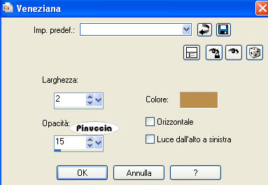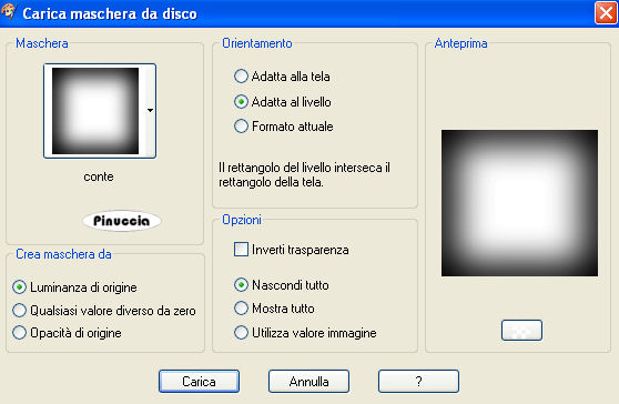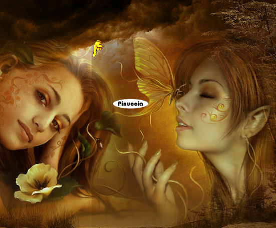 qui puoi trovare qualche risposta ai tuoi dubbi. Se l'argomento che ti interessa non è presente, ti prego di segnalarmelo. Questo tutorial è stato scritto con PSP X2, ma può essere eseguito anche con le altre versioni di PSP. Per tradurlo, ho usato PSP X. ©Biene - tutti i diritti riservati. Il © della traduzione è mio. Occorrente: Tre immagini: uno sfondo e due figure. Il resto del materiale qui Le immagini usate sono ©Elena Dudina. Queste immagini non si possono usare senza il suo permesso. Grazie per questo permesso Elena! Per questo lavoro Elena ha usato le immagini da: 1. Image: Model: Irene http://www.fotopunto.com/2382. sfondo: http://vertigo84.deviantart.com Donna con la farfalla: http://jlstock.deviantart.com 2. Image Modella da ~MissS-Stocks mano da ~marchetooo Orecchio da ~TwinkiexStocks Farfalla da *Sammykaye1sStamps Ali da *Misstock Trama da =Geek-Stock. Un ringraziamento ai creatori di tubes dei vari gruppi cui appartengo. Il watermark di ognuno è inserito nei tubes. Per favore, rispetta il lavoro degli autori: non cambiare il nome del file e non rimuovere il watermark. Il © appartiene agli artisti originali. ![]() Metti la maschera Conte nella cartella Maschere. Apri l'immagine di sfondo (la mia "Background_8_by_Elenadudina.jpg"). Duplicala usando la combinazione di tasti maiuscola+D e chiudi l'originale. La copia sarà la base del tuo lavoro. Immagine>Ridimensiona, a 650 x 540 pixels. Attiva lo strumento Selezione ,clicca sull'icona Selezione personalizzata ![]() e imposta i seguenti settaggi: ![]() Immagine>Ritaglia la selezione. Apri la seconda immagine (la mia Irene_by_ElenaDudina.jpg) e vai a Modifica>Copia. Torna al tuo lavoro e vai a Modifica>Incolla come nuovo livello. Sposta l'immagine completamente a sinistra e un po' più in basso.Vedi il mio esempio per orientarti. Livelli>Carica/Salva maschera>Carica maschera da disco. Cerca e carica la maschera Conte: ![]() Livelli>Unisci>Unisci gruppo. Attiva la seconda immagine (la mia "Mariposas_by_ElenaDudina.jpg") e vai a Modifica>Copia. Torna al tuo lavoro e vai a Modifica>Incolla come nuovo livello. Posiziona l'immagine a destra, alla stessa altezza della precedente.Livelli>Carica/Salva maschera>Carica maschera da disco. Carica nuovamente la maschera Conte, con i settaggi precedenti. Livelli>Unisci>Unisci gruppo. Ingrandisci l'immagine attivando lo strumento Zoom o usando la rotellina del mouse),e controlla se sono visibili i bordi netti delle due immagini. ![]() Attiva lo strumento Gomma , dimensione 80, opacità 10.Attiva il primo livello Gruppo Raster 1 e cancella questi bordi. Ripeti sul secondo livello Gruppo Raster 1. Attiva nuovamente il livello di sfondo. Nella barra laterale degli strumenti, sopra il pennello, attiva lo strumento Trucco ![]() dimensione 43, durezza 50, opacità 99; e passalo sopra i visi delle donne per schiarirli. Livelli>Unisci>Unisci tutto. Duplica l'immagine (maiuscola+D) e metti da parte la copia. Torna al tuo lavoro. Apri il Wordart di Biene e vai a Modifica>copia. Torna al tuo lavoro e vai a Modifica>Incolla come nuovo livello. Posiziona correttamente il testo.Cambia la modalità di miscelatura di questo livello in Luminanza (esistente). Effetti>Effetti 3D>sfalsa ombra, con il colore nero. ![]() Livelli>Unisci>Unisci tutto. Immagine>Aggiungi bordatura, 1 pixel, simmetriche, con il colore #bb8f49. Immagine>Aggiungi bordatura, 22 pixels, simmetriche, con il colore bianco. Seleziona il bordo bianco con la bacchetta magica ![]() e riempi la selezione con il colore #bb8f49.Selezione>Inverti. Selezione>Innalza selezione a livello. Selezione>Deseleziona. Attiva il livello sottostante. Livelli>Nuovo livello raster. Selezione>Seleziona tutto. Attiva l'immagine che hai messo da parte prima e vai a Modifica>Copia. Torna al tuo lavoro e vai a Modifica>Incolla nella selezione. Selezione>Deseleziona. Regola>Sfocatura>Sfocatura gaussiana - raggio 15. ![]() Effetti>Effetti di trama>Veneziana, con il colore #bb8f49. ![]() Attiva il livello superiore. Effetti>Effetti 3D>Sfalsa ombra, con il colore nero. ![]() Ripeti l'Effetto Sfalsa ombra, cambiando verticale e orizzontale con -2. Aggiungi il tuo nome e/o il tuo watermark, senza dimenticare eventuali copyright delle immagini usate. Livelli>Unisci>Unisci tutto e salva in formato jpg. Se hai problemi o dubbi, o trovi un link non funzionante, o anche soltanto per un saluto, scrivimi.