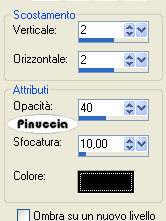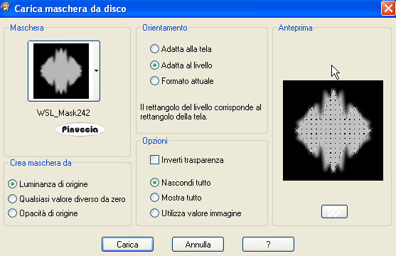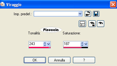 qui puoi trovare qualche risposta ai tuoi dubbi. Se l'argomento che ti interessa non è presente, ti prego di segnalarmelo. Questo tutorial è stato scritto con PSP X2, ma può essere eseguito anche con le altre versioni di PSP. Per tradurlo, l'ho eseguito con PSP X. Occorrente: Un tube a scelta. Il resto del materiale qui Il componente scrap Doodle1.png è di Sunnyelements. Non conosco gli autori di Pink~Stuffies.psp, Twirlezz.psp e Paper4.jpg. Box1_biene,psd e diamonds_hottie_biene.pspimage sono ©Biente. La maschera (da mettere nelle cartelle Maschere) è di Weescotslass. Rispetta il lavoro degli autori e mantieni i tubes inalterati. Apri una nuova immagine BIANCA 600 x 600 pixels. Livelli>Nuovo livello raster. Selezione>Seleziona tutto. Apri Paper 4 e vai a Modifica>Copia. Torna al tuo lavoro e vai a Modifica>Incolla nella selezione. Selezione>Deseleziona. Livelli>Carica/Salva maschera>Carica maschera da disco. Cerca e carica la maschera WSL_Mask242.jpg. ![]() Regola>Tonalità e saturazione>Viraggio: ![]() Immagine>Ridimensiona, al 110%, tutti i livelli non selezionato. Apri Doodle1.png e vai a Modifica>Copia. Torna al tuo lavoro e vai a Modifica>Incolla come nuovo livello. Regola>Tonalità e saturazione>Viraggio, con i settaggi precedenti. Immagine>Ridimensiona, al 25%, tutti i livelli non selezionato. Regola>Messa a fuoco>Metti a fuoco. Sposta l'ornamento un po' più in alto e a destra:![]() Effetti>Effetti 3D>Sfalsa ombra, con i seguenti settaggi, colore nero: ![]() Attiva lo strumento Selezione ![]() clicca sull'icona Selezione personalizzata ![]() e imposta i seguenti settaggi: ![]() Premi sulla tastiera il tasto CANC ![]() Selezione>Deseleziona. Livelli>Duplica. Immagine>Rifletti. Apri box1_biene.psd. Il livello inferiore (raster 4) ha un box di un altro colore, che - eventualmente - puoi cambiare per adattarlo ai colori del tuo tube. Il livello usato per questo tutorial è il livello Raster 1. Modifica>Copia. Torna al tuo lavoro e vai a Modifica>Incolla come nuovo livello. Sposta il tube in basso.Apri Twirlezz.psp. Attiva lo strumento Selezione a mano libera , da punto a punto,![]() e seleziona l'ornamento che preferisci. Per il mio esempio ho usato l'ornamento con le due bocche. ![]() Modifica>Copia. Torna al tuo lavoro e vai a Modifica>incolla come nuovo livello. Sposta l'ornamento sul box.Effetti>Effetti 3D>Sfalsa ombra, con i seguenti settaggi, colore nero: ![]() Spostalo sul fronte del box, a sinistra.Livelli>Duplica. Immagine>Rifletti. Se le parti dell'ornamento si sovrappongono: ![]() Cancella la parte superflua. Livelli>Unisci>Unisci giù. Apri diamonds_hottie_biene.pspimage e vai a Modifica>Copia. Torna al tuo lavoro e vai a Modifica>Incolla come nuovo livello. Posiziona i diamenti sul bordo argentato del box.Apri il tuo tube e vai a Modifica>Copia. Torna al tuo lavoro e vai a Modifica>Incolla come nuovo livello. Ridimensiona, se e quanto necessario. Posiziona il tube sul box.Effetti>Effetti 3D>Sfalsa ombra, con i seguenti settaggi, colore nero. ![]() Nello zip trovi un altro tube con diverse piccole decorazioni (Pink_Stuffies). Usalo a tuo piacimento. Livelli>Unisci>Unisci tutto e salva in formato jpg. Il tube usato per questo esempio è di Lori Rhae. ![]() Se hai problemi o dubbi, o trovi un link non funzionante, o anche soltanto per un saluto, scrivimi 30 Ottobre 2008 |