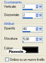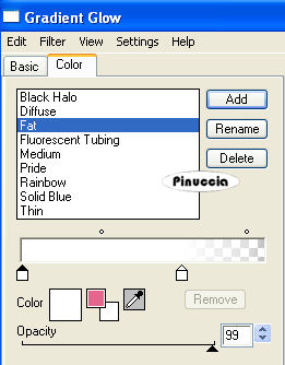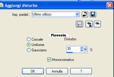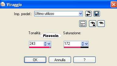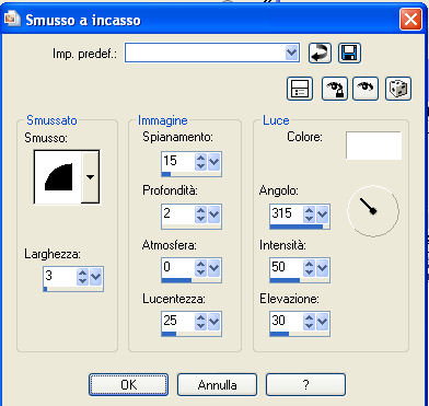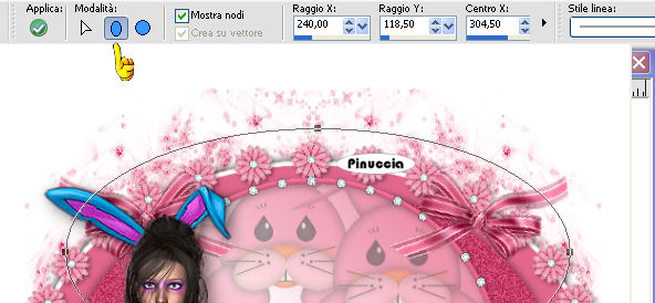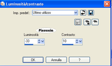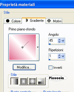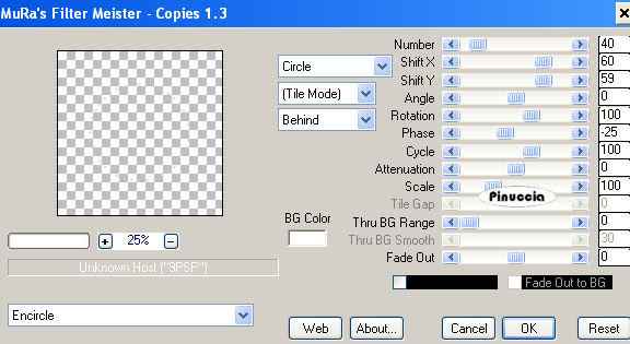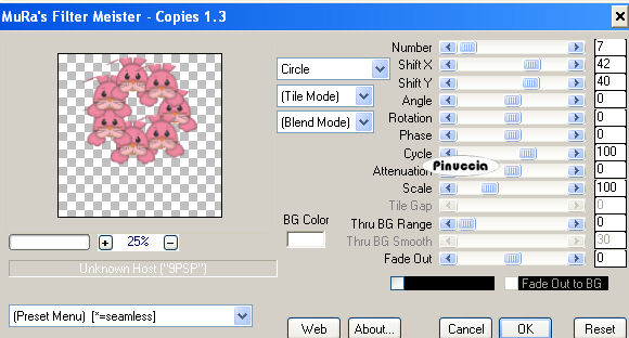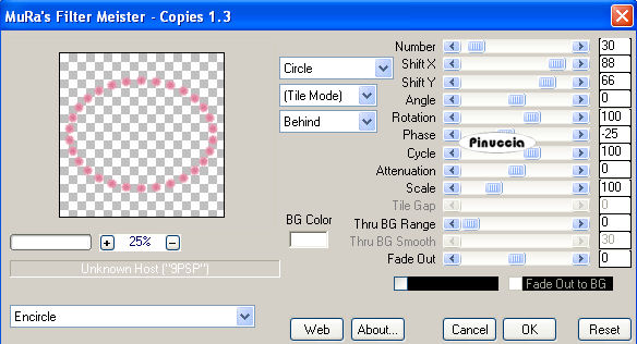 qui puoi trovare qualche risposta ai tuoi dubbi. Se l'argomento che ti interessa non è presente, ti prego di segnalarmelo. Questo tutorial è stato scritto con PSP X2, ma può essere eseguito anche con le altre versioni di PSP. Per tradurlo, ho usato PSP X. ©Biene - tutti i diritti riservati. Il © della traduzione è mio. Occorrente: Un tube a scelta. Materiale qui Per il mio esempio ho usato un poser http://lemondedangie.free.fr" ©Angie Il Template 10bysil2009 che trovi http://creativemisfitscreations.blogspot.com/2009_08_01_archive.htmlqui, sotto 23 August 2009. Elementi scrap del kit "Easter Surprise" di Fantasy Moments che trovi http://fantasymoments-scraps.blogspot.com/ qui, sotto 15 März 2010. Un ringraziamento ai creatori di tubes dei vari gruppi cui appartengo. Il watermark di ognuno è inserito nei tubes. Per favore, rispetta il lavoro degli autori: non cambiare il nome del file e non rimuovere il watermark. Il © appartiene agli artisti originali. Filtri: Eye Candy 4000 - Gradient Glow qui Mura's Meister - Copies qui ![]() scegli dal tube o dallo scrapkit un bel colore e impostalo come colore di primo piano. Il mio #e1678c. Prendi nota dei valori di Tonalità (H) e Saturazione (S) che ti serviranno per applicare il Viraggio. (Vedi gli appunti sul Viraggio qui) I miei settaggi. ![]() Imposta il colore di sfondo con il bianco. Apri il template 10bysyl2009. Duplicalo usando la combinazione di tasti maiuscola+D e chiudi l'originale. La copia sarà la base del tuo lavoro. Immagine>Ridimensiona, al 90%, tutti i livelli non selezionato. Elimina i livelli con il testo e il copyright. Apri e attiva il livello di sfondo bianco. Immagine>Dimensioni tela - 600 x 600 pixels. ![]() Premi sulla tastiera il tasto CANC. Riempi nuovamente il livello con il colore bianco (Tasto destro del mouse).Apri glitterbg_eastersurprise_biene.pspimage e vai a Modifica>Copia. Torna al tuo lavoro e vai a Modifica>Incolla come nuovo livello. Attiva il livello "Black oval". Selezione>Seleziona tutto. Selezione>Mobile. Selezione>Immobilizza. Livelli>Nuovo livello raster. Riempi la selezione con il colore di primo piano.Selezione>Deseleziona. Effetti>Plugins>Eye Candy 4 - Gradiente Glow: sotto Color imposta "Fat". ![]() ![]() Effetti>Effetti 3D>Sfalsa ombra, con il colore nero. ![]() Ripeti l'Effetto Sfalsa ombra, cambiando verticale e orizzontale con -2. Puoi eliminare il livello "Black oval". Attiva il livello "pink oval". Selezione>Seleziona tutto. Selezione>Mobile. Selezione>Immobilizza. Livelli>Nuovo livello raster. Riempi la selezione con il colore di primo piano.Selezione>Deseleziona. Regola>Luminosità e contrasto: ![]() Regola>Aggiungi/Rimuovi disturbo>Aggiungi disturbo. ![]() Effetti>Effetti 3D>Sfalsa ombra, con il colore nero. ![]() Ripeti l'Effetto Sfalsa ombra, cambiando verticale e orizzontale con -2. Elimina il livello "pink oval". Dallo scrapkit apri FM-Easter-Suprise-Element-30.png e vai a Modifica>Copia. Torna al tuo lavoro e vai a Modifica>Incolla come nuovo livello. Immagine>Ridimensiona, al 10%, tutti i livelli non selezionato. Regola>Messa a fuoco>Metti a fuoco. non vedrai il tube perchè è coperto dai livelli superiori, ma non importa. Continua. Regola>Tonalità e saturazione>Viraggio, con i valori corrispondenti al tuo colore di primo piano. ![]() Effetti>Plugins>Mura's Meister - Copies. ![]() Posiziona correttamente il cerchio di fiori sull'ovale.![]() Effetti>Effetti 3D>Sfalsa ombra, con il colore nero. ![]() Dal materiale, apri diamant_eastersurprise.psp. Attiva il livello "diamant 60" e vai a Modifica>copia. Torna al tuo lavoro e vai a Modifica>Incolla come nuovo livello. ancora una volta non vedrai il tube, ma non preoccuparti e continua Effetti>Plugins>Mura's Meister - Copies, con i settaggi precedenti. Regola la posizione del cerchio in modo che ogni diamantino si trovi al centro di ogni fiore.Sarà uno spostamento minimo. Se hai difficoltà, usa le frecce della tastiera (sull'uso delle frecce della tastiera abbinato allo strumento Spostamento vedi qui). ![]() Regola>Messa a fuoco>Metti a fuoco. Attiva il livello "white circle". Dallo scrapkit apri FM-Easter-Surprise-Element-54.png e vai a Modifica>Copia. Torna al tuo lavoro e vai a Modifica>Incolla come nuovo livello. Immagine>Ridimensiona, al 45%, tutti i livelli non selezionato. Posiziona il coniglietto come mostrato nella schermata.![]() Rinomina questo livello "coniglietto". Attiva nuovamente il livello "White circle". Selezione>Seleziona tutto. Selezione>Mobile. Selezione>Inverti. Attiva il livello sopra del coniglietto, e premi sulla tastiera il tasto CANC. Selezione>Deseleziona. Effetti>Plugins>Mura's Meister - Copies. ![]() Abbassa l'opacità di questo livello al 45%. Posiziona correttamente i coniglietti nell'area bianca.Attiva ancora il livello "white circle". Selezione>Seleziona tutto. Selezione>Mobile. Selezione>Immobilizza. Livelli>Nuovo livello raster. Passa il colore di primo piano a Gradiente. ![]() Riempi il livello con il gradiente.Attiva nuovamente il livello del coniglietto. Selezione>Inverti. Premi sulla tastiera il tasto CANC. Selezione>Deseleziona. Torna ancora sul livello "white circle". Selezione>Seleziona tutto. Selezione>Mobile. Selezione>Immobilizza. Selezione>Modifica>Espandi - 2 pixels. Attiva il livello del coniglietto. Livelli>Nuovo livello raster. Riempi con il colore di primo piano.Selezione>Modifica>Contrai - 6 pixels. Premi sulla tastiera il tasto CANC. Selezione>Deseleziona. Effetti>Effetti 3D>Smusso a incasso. ![]() Selezione>Seleziona tutto. Selezione>Mobile. Selezione>Modifica>Sfuma - 1 pixel. Selezione>Inverti. Premi due volte il tasto CANC. Selezione>Deseleziona. Effetti>Effetti 3D>Sfalsa ombra, con il colore nero. ![]() Attiva nuovamente il tube di biene diamant_eastersurprise.psp. Posizionati sul livello diamant 70 e vai a Modifica>Copia. Torna al tuo lavoro e vai a Modifica>Incolla come nuovo livello. Effetti>Plugins>Mura's Meister - Copies. ![]() Regola>Messa a fuoco>Metti a fuoco.