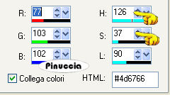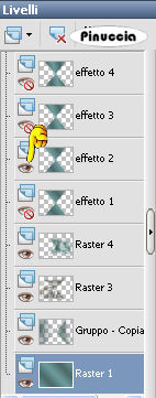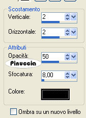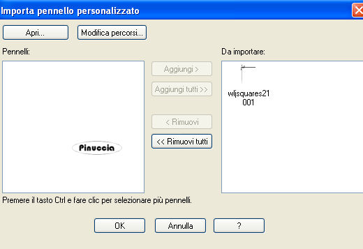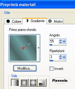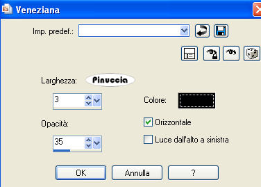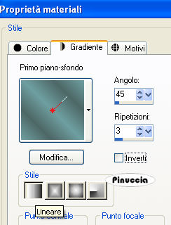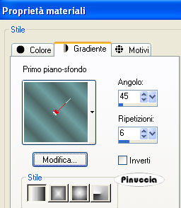 qui puoi trovare qualche risposta ai tuoi dubbi. Se l'argomento che ti interessa non è presente, ti prego di segnalarmelo. Questo tutorial è stato scritto con PSP X2, ma può essere eseguito anche con le altre versioni di PSP. Per tradurlo, l'ho eseguito con PSP X. Occorrente: Un tube a scelta. Il resto del materiale qui Il tube che ho usato per il mio esempio è di Ann. I tubes forniti sono di Ann e Marif. Ti servirà anche Animation Shop qui Metti la maschera sg_narrow-alley.PspMask nella cartella Maschere. Imposta il colore di primo piano con #6f9fa1, e il colore di sfondo con #4d6766. (oppure scegli dal tuo tube un colore chiaro e un colore scuro). Passa il colore di primo piano a Gradiente: ![]() Apri una nuova immagine trasparente 700 x 500 pixels, e riempila con il gradiente.Regola>Sfocatura>Sfocatura gaussiana, raggio 20. ![]() Livelli>Duplica. Livelli>Carica/Salva maschera>Carica maschera da disco. Cerca e carica la maschera sg_narrow-alley.PspMask. ![]() Livelli>Unisci>Unisci gruppo. Effetti>Effetti 3D>Sfalsa ombra, con i seguenti settaggi, colore nero: ![]() Attiva lo strumento Selezione a mano libera , da punto a punto,spianamento e sfumatura 0, e traccia una selezione come nell'esempio. ![]() Livelli>Nuovo livello raster. Riempi la selezione con il gradiente.Rinomina questo livello Effetto 1. Livelli>Nuovo livello raster. Cambia il settaggio del gradiente portando l'angolo a 55. ![]() Riempi la selezione con il gradiente.Rinomina questo livello Effetto 2. Livelli>Nuovo livello raster. Cambia il settaggio del gradiente portando l'angolo a 65. Riempi la selezione con il gradiente.Rinomina questo livello Effetto 3. Livelli>Nuovo livello raster. Cambia il settaggio del gradiente portando l'angolo a 75. Riempi la selezione con il gradiente.Rinomina questo livello Effetto 4. Livelli>Nuovo livello raster. Cambia il settaggio del gradiente portando l'angolo a 90. Riempi la selezione con il gradiente.Rinomina questo livello Effetto 5. Livelli>Nuovo livello raster. Riempi la selezione con il colore nero.Selezione>Modifica>Contrai - 1 pixel. Premi sulla tastiera il tasto CANC. Selezione>Deseleziona. Attiva il livello Gruppo - Copia di Raster 1. ![]() Livelli>Nuovo livello raster. Selezione>Seleziona tutto. Apri @nn_template_170706_pistol_TD_small.psp, e vai a Modifica>Copia. Torna al tuo lavoro e vai a Modifica>Incolla nella selezione. Selezione>Deseleziona. Attiva nuovamente lo Strumento Selezione a mano libera , con i settaggi precedenti,e traccia una selezione come nell'esempio. ![]() Premi sulla tastiera il tasto CANC. Selezione>Deseleziona. Effetti>Effetti di bordo>Aumenta. Cambia la modalità di miscelatura di questo livello in Luce diffusa. Apri Marif_2006_aout_misted_decor022.pspimage, e vai a Modifica>copia. Torna al tuo lavoro e vai a Modifica>Incolla come nuovo livello. Immagine>Rifletti. Sposta il tube a destra.Nella paletta dei materiali prendi nota dei valori di Tonalità (H) e Saturazione (S) del colore di sfondo. Se stai usando i miei colori, dovrebbero essere H=126 - S=37. ![]() Regola>Tonalità e Saturazione>Viraggio, e imposta i valori annotati: ![]() Cambia la modalità di miscelatura di questo livello in Moltiplica. Effetti>Effetti di bordo>aumenta. Attiva nuovamente lo strumento Selezione a mano libera ![]() e traccia una selezione come nell'esempio. ![]() Premi sulla tastiera il tasto CANC. Selezione>Deseleziona. Attiva il livello superiore. Apri il tuo tube e vai a Modifica>copia. Torna al tuo lavoro e vai a Modifica>Incolla come nuovo livello. Ridimensiona, se necessario. Livelli>Duplica. Livelli>Disponi>Sposta giù. Effetti>Effetti di distorsione>Vento - da destra, intensità 80: ![]() Regola>Sfocatura>Sfocatura gaussiana, raggio 20. Attiva il livello superiore. Effetti>Effetti 3D>sfalsa ombra, con i seguenti settaggi, colore nero. ![]() Livelli>Nuovo livello raster. Selezione>Seleziona tutto. Immagine>Dimensione tela - 702 x 502 pixels. Selezione>Inverti. Riempi la selezione con il colore nero.Cambia i settaggi del gradiente: angolo 45, ripetizioni 6: ![]() Livelli>Nuovo livello raster. Selezione>Seleziona tutto. Immagine>Dimensione tela - 742 x 542 pixels. Selezione>Inverti. Riempi la selezione con il gradiente.Effetti>Effetti di trama>Veneziana: ![]() Selezione>Inverti. Effetti>Effetti 3D>Sfalsa ombra, con i seguenti settaggi, colore nero: ![]() Ripeti l'Effetto Sfalsa ombra, cambiando verticale e orizzontale con -2. Selezione>Seleziona tutto. Immagine>Dimensione tela - 744 x 544 pixels. Selezione>Inverti. Riempi la selezione con il colore nero.Selezione>Deseleziona. Livelli>Nuovo livello raster. File>Importa>Pennello personalizzato. clicca su Apri, cerca il pennello wlijsquares21 001.PspBrush nella cartella dove lo hai scompattato, clicca Aggiungi e il pennello passerà sulla finestra a destra - ok: ![]() Imposta il colore di primo piano con il nero. Attiva lo strumento Pennello ![]() cerca e seleziona il pennello che hai appena importato, dimensione 200, e applicalo nell'angolo in alto a sinistra. ![]() Livelli>Duplica. Immagine>Capovolgi. Immagine>Rifletti. Livelli>Unisci>Unisci giù. Se vuoi, questo è il momento di aggiungere il tuo nome e/o il tuo watermark. Controlla che siano chiusi i livelli 2-5. ![]() Modifica>Copia Unione. Apri Animation Shop e vai a Modifica>Incolla>Incolla come nuova animazione. Torna in PSP. Chiudi il livello Effetto 1 e rendi visibile il livello Effetto 2. ![]() Modifica>Copia Unione. Torna in Animation Shop e vai a Modifica>Incolla>Incolla dopo il fotogramma corrente. Di nuovo in PSP. Chiudi il livello Effetto 2 e rendi visibile il livello Effetto 3. Modifica>Copia Unione. Di nuovo in Animation shop: Modifica>Incolla>Incolla dopo il fotogramma corrente. Ancora in PSP. Chiudi il livello Effetto 3 e apri il livello Effetto 4. Modifica>Copia Unione. Di nuovo in Animation shop: Modifica>Incolla>Incolla dopo il fotogramma corrente. Ancora in PSP. Chiudi il livello Effetto 4 e apri il livello Effetto 5. Modifica>Copia Unione. Di