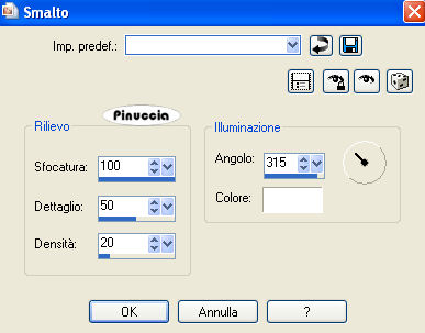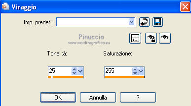 qui puoi trovare qualche risposta ai tuoi dubbi. Se l'argomento che ti interessa non è presente, ti prego di segnalarmelo. Questo tutorial è stato scritto con PSP X2, ma può essere eseguito anche con le altre versioni di PSP. Occorrente: Materiale qui Ho usato due tubes di Sabi e ©José del Nido. Tuttavia devi chiedere il permesso all'artista per l'uso di questi tubes. Trovi il sito di José http://www.josedelnido.com/English/Gallery.html Un grazie a José per il suo permesso Per questo tutorial ho usato anche un'immagine di http://www.arts-system.com/pages/artist-gallery/cebarre1©Cebarre. Il tube Bella moon goddess jw.psp è ©Josephine Wall Per gli altri tubes è valido il watermark contenuto nei singoli tubes. Rispetta il lavoro degli autori e mantieni inalterati i tubes. Apri il motivo oro Gold foil e minimizzalo nella tua area di lavoro. Lo troverai nella lista dei Motivi disponibili quando ti servirà. Apri una nuova immagine trasparente 700 x 450 pixels. Livelli>Nuovo livello raster. Selezione>Seleziona tutto. Apri Ambre.jpg. Attiva lo strumento Selezione , rettangolo,e traccia una selezione come nell'esempio sotto. ![]() Modifica>Copia. Torna al tuo lavoro e vai a Modifica>Incolla nella selezione. Selezione>Deseleziona. Apri Copy-by_Josè_del_Nido_del_Nido_1019.psp e vai a Modifica>Copia. Torna al tuo lavoro e vai a Modifica>Incolla come nuovo livello. Immagine>Ridimensiona, al 45%, tutti i livelli non selezionato. Regola>Messa a fuoco>Metti a fuoco. Sposta il tube nell'angolo in basso a sinistra.Abbassa l'opacità di questo livello al 70%. ![]() Livelli>Duplica. Livelli>Disponi>Sposta giù. Cambia la modalità di miscelatura di questo livello in Filtra. Attiva il livello superiore. Regola>Saturazione e tonalità>Viraggio: ![]() Attiva il livello Raster 1. Apri 17.12.04-bella-moon godess-jw.psp, e vai a Modifica>Copia. Torna al tuo lavoro e vai a Modifica>Incolla come nuovo livello. Immagine>Ridimensiona, al 90%, tutti i livelli non selezionato. Abbassa l'opacità di questo livello al 20%. Attiva nuovamente il livello superiore. Apri Copy_by_Josè_del_Nido_Ref_07_-12.psp e vai a Modifica>copia. Torna al tuo lavoro e vai a Modifica>Incolla come nuovo livello. Immagine>Rifletti. Immagine>Ridimensiona, al 70%, tutti i livelli non selezionato. Regola>Tonalità e saturazione>Viraggio con i settaggi precedenti. Sposta il tube nell'angolo in basso a destra.Livelli>Unisci>Unisci visibile. Modifica>Copia. Modifica>Incolla come nuova immagine. Metti da parte questa immagine e torna al tuo lavoro. Livelli>Nuovo livello raster. Selezione>seleziona tutto. Selezione>Modifica>Contrai, di 1 pixel. Selezione>Inverti. Passa il colore di primo piano a Motivi e seleziona il motivo oro. ![]() Riempi la selezione con questo motivo.Selezione>Deseleziona. Livelli>Unisci>Unisci visibile. Livelli>Nuovo livello raster. Livelli>Disponi>Sposta giù. Immagine>Dimensione tela, 750 x 500 pixels, e clicca sulla freccia al centro. ![]() Riempi con il nero.Attiva nuovamente il livello superiore. Livelli>Nuovo livello raster. Selezione>Seleziona tutto. Attiva la copia che hai messo da parte prima e vai a Modifica>Copia. Torna al tuo lavoro e vai a Modifica>Incolla nella selezione. Effetti>Effetti artistici>Smalto: ![]() Immagine>Rifletti. Immagine>Capovolgi. Abbassa l'opacità di questo livello al 60%. Attiva il livello superiore. Livelli>Nuovo livello raster. Selezione>Seleziona tutto. Selezione>modifica>Contrai, di 1 pixel. Selezione>Inverti. Riempi la selezione con il motivo oro.Selezione>Deseleziona. Aggiungi il tuo nome e/o il tuo watermark. Non dimenticare di aggiungere il copyright ©Josè Del Nido. Livelli>Unisci>Unisci tutto e salva in formato jpg. ![]() Se hai problemi o dubbi, o trovi un link non funzionante, o anche soltanto per un saluto, scrivimi 25 Gennaio 2008 |