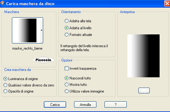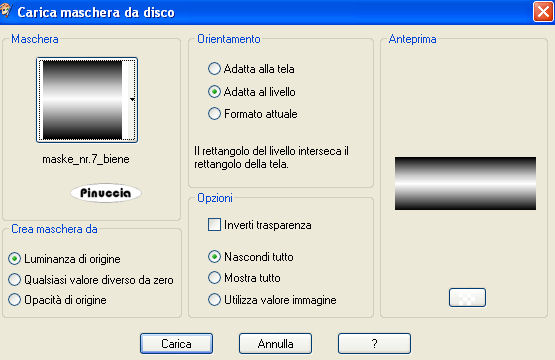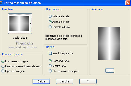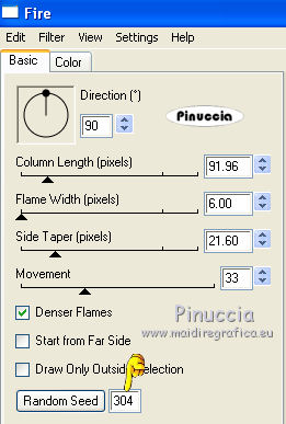 qui puoi trovare qualche risposta ai tuoi dubbi. Se l'argomento che ti interessa non è presente, ti prego di segnalarmelo. Questo tutorial è stato scritto con PSP X2, ma può essere eseguito anche con le altre versioni di PSP. Per tradurlo, l'ho eseguito con PSP X. Occorrente: Un tube a scelta. Il resto del materiale qui Il tube che ho usato è di Thaiss. L'immagine di sfondo Flammenhintergrund è di Biene. Rispetta il lavoro degli autori e mantieni inalterati i tubes. La foto usata per la base del lavoro viene da http://www.freefoto.com/index.jspFreeFotomcom Filtro: Eye Candy 4 - Fire qui Ti servirà anche Animation Shop qui Metti le Maschere nella cartella Maschere. Metti il motivo oro nell cartella Motivi. Apri Flammenhintergrundmein.jpg. Duplica l'immagine usando sulla tastiera la combinazione shift(maiuscola)+D, e chiudi l'originale. Livelli>Duplica. Immagine>Ruota per gradi - 90 gradi a destra: ![]() Livelli>Carica/Salva maschera>Carica maschera da disco. Cerca e carica la maschera maske_rechts_biene.jpg. ![]() Livelli>Unisci>Unisci gruppo. Sposta il livello un po' più a sinistra.![]() Livelli>Duplica. Immagine>Rifletti. Apri 28_19_9_prev.jpg. Attiva lo strumento Selezione , rettangolo, sfumatura 20,e traccia una selezione come nell'esempio: ![]() Chiudendo la selezione, questa si allargherà per effetto della sfumatura. Modifica>Copia. Torna al tuo lavoro e vai a Modifica>Incolla come nuovo livello. Immagine>Ridimensiona, all'80%, tutti i livelli non selezionato. Livelli>Carica/Salva maschera>Carica maschera da disco. Cerca e carica la maschera maske_nr.7_biene.jpg. ![]() Livelli>Unisci>Unisci gruppo. Sposta questo livello in basso vicino al bordo, e un po' più a destra,vedi il mio esempio per controllare la posizione. Attiva lo strumento Gomma , dimensione 80, opacità 17,e cancella le tracce delle fiamme che disturbano l'immagine del veicolo. Apri il tuo tube e vai a Modifica>copia. Torna al tuo lavoro e vai a Modifica>Incolla come nuovo livello. Immagine>Ridimensiona, all'80%, tutti i livelli non selezionato. Livelli>Carica/Salva maschera>Carica maschera da disco. Cerca e carica la maschera abold_didda.jpg. ![]() Livelli>Unisci>Unisci gruppo. Sposta il tube a sinistra.Attiva il livello sottostante. Attiva nuovamente la gomma con i settaggi precedenti.e cancella le tracce del veicolo dal viso della donna. ![]() Per un motivo inspiegabile, è visibile una macchia nera a destra del casco della donna. ![]() Questa macchia non si evidenzia in nessuna delle immagini che compongono i livelli della tag. Per mimetizzarla, apri il file creato da Biene kleineflamme.pspimage e vai a Modifica>Copia. Torna al tuo lavoro. Attiva il livello superiore e vai a Modifica>Incolla come nuovo livello. Posiziona le piccole fiamme sull'area della macchia nera.![]() e cancella con molta attenzione eventuali "sbavature".Livelli>Unisci>Unisci tutto. Immagine>Aggiungi bordatura, 2 pixels, simmetriche, con il colore nero. Selezione>Seleziona tutto. Immagine>Aggiungi bordatura, 1 pixel, simmetriche, con il colore bianco. Selezione>inverti. Passa il colore di primo piano a Motivi e seleziona il motivo oro Gold Foil. ![]() Riempi con il motivo oro.Selezione>Deseleziona. Immagine>Aggiungi bordatura, 2 pixels, simmetriche, con il colore nero. Selezione>Seleziona tutto. Immagine>Aggiungi bordatura, 1 pixel, simmetriche, con il colore bianco. Selezione>Inverti. Riempi la selezione con il motivo oro.Selezione>Deseleziona. Se vuoi, questo è il momento di aggiungere il tuo nome e/o il tuo watermark. Livelli>Unisci>Unisci tutto. Attiva lo strumento Testo e scegli un bel font.Per il mio testo ho usato il font LakeWobegonNF, con i seguenti settaggi. ![]() Imposta il colore di primo piano con il motivo oro e il colore di sfondo con il nero. Scrivi il testo e posizionalo Livelli>converti in livello raster. Rinomina questo livello Testo. Livelli>Duplica, 2 volte. Attiva il livello Testo. Effetti>Plugins>Eye Candy 4 - Fire: ![]() Attiva il livello della prima copia del Testo. Effetti>Plugins>Eye Candy 4000 - Fire, con i settaggi precedenti, ma clicca una volta sul tasto Random Seed. Chiudi questo livello. Attiva il livello della seconda copia del Testo. Ripeti l'Effetto Fire, cliccando una volta su Random Seed. Chiudi questo livello. Assicurati che i livelli delle copie del testo siano chiusi: ![]() Modifica>Copia Unione. Apri Animation Shop e vai a Modifica>Incolla>Incolla come nuova animazione. Torna in PSP. Chiudi il livello testo e apri il livello Copia di Testo. ![]() Modifica>Copia Unione. Torna in Animation Shop e vai a Modifica>Incolla>Incolla dopo il fotogramma corrente. Di nuovo in PSP. Chiudi il livello Copia di Testo e apri il livello Copia (2) di Testo: ![]() Modifica>Copia Unione. Per finire, in Animation Shop: Modifica>Incolla>Incolla dopo il fotogramma corrente. L'animazione è finita. Controlla il risultato cliccando su Visualizza e salva in formato gif.![]() Se hai problemi o dubbi, o trovi un link non funzionante, o anche soltanto per un saluto, scrivimi. 12 Agosto 2008 |