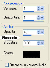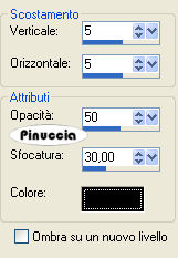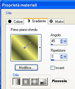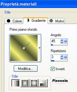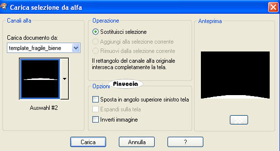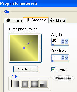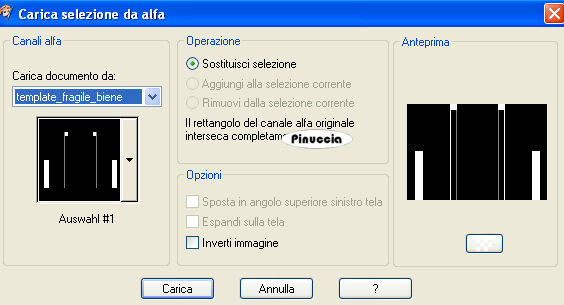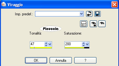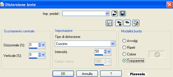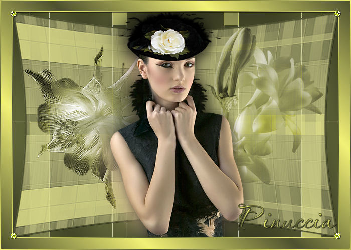 qui puoi trovare qualche risposta ai tuoi dubbi. Se l'argomento che ti interessa non è presente, ti prego di segnalarmelo. Questo tutorial è stato scritto con PSP X2, ma può essere eseguito anche con le altre versioni di PSP. Per tradurlo, l'ho eseguito con PSP X. Occorrente: Materiale qui I tubes che ho usato sono di Jet e Mounier. La maschera e l'ornamento sono di Biene. Rispetta il lavoro degli autori e mantieni inalterati i tubes. Filtri: Graphics Plus qui Metti la maschera maske_gitter_biene.jpg nella cartella Maschere. Imposta il colore di primo piano con il bianco e il colore di sfondo con #4e522e. Apri Template_fragile_biene.pspimage. L'immagine, che sarà la base del tuo lavoro, non è vuota, ma contiene le selezioni salvate sul canale alfa. Riempi l'immagine trasparente con il colore di sfondo.Effetti>Plugins>Graphics Plus - Cross Shadow, con i seguenti settaggi: ![]() Livelli>Nuovo livello raster. Riempi il livello con il colore bianco di primo piano.Livelli>Carica/Salva maschera>Carica maschera da disco. Cerca e carica la maschera maske_gitter_biene.jpg. ![]() Livelli>Unisci>Unisci gruppo. Effetti>Effetti di distorsione>Distorsione lente: ![]() Livelli>Unisci>Unisci giù. Livelli>Nuovo livello raster. Selezione>Carica/Salva selezione>Carica selezione da canale alfa. La selezione Auswahl#1 è già presente. Devi soltanto cliccare Carica. ![]() Cambia il colore di primo piano con #f2f176. Passa il colore di primo a Gradiente di primo piano/sfondo, con i seguenti settaggi. ![]() Riempi la selezione con il gradiente.Effetti>Effetti di bordo>Aumenta. Selezione>Deseleziona. Cambia la modalità di miscelatura di questo livello in Filtra, e abbassa l'opacità al 70%. Livelli>Nuovo livello raster. Riempi il livello con il colore di primo piano.Livelli>Carica/Salva maschera>Carica maschera da disco. Carica nuovamente la maschera maske_gitter_biene.jpg con gli stessi settaggi. Livelli>Unisci>Unisci gruppo. Livelli>Nuovo livello raster. Selezione>Seleziona tutto. Selezione>Modifica>Contrai - 2 pixels. Selezione>Inverti. Riempi la selezione con il colore di primo piano.Selezione>Deseleziona. Livelli>Unisci>Unisci giù. Effetti>Effetti di distorsione>Distorsione Lente, con i settaggi precedenti. Effetti>Effetti 3D>sfalsa ombra, con i seguenti settaggi, colore nero: ![]() Apri glasblomst.psp e vai a Modifica>Copia. Torna al tuo lavoro e vai a Modifica>Incolla come nuovo livello. Immagine>Ridimensiona, all'85%, tutti i livelli non selezionato. Sposta il tube a sinistra, all'interno della maschera.Regola>Messa a fuoco>Metti a fuoco. Cambia la modalità di miscelatura di questo livello in Luminanza. Apri jet-flower2-januari-20081.psp e vai a Modifica>Copia. Torna al tuo lavoro e vai a Modifica>Incolla come nuovo livello. Immagine>Ridimensiona, al 65%, tutti i livelli non selezionato. Sposta il tube a destra, all'interno della maschera.Se una parte del tube eccede al di fuori della maschera sarà eliminata con il prossimo passaggio. Carica/Salva selezione>Carica selezione da canale alfa. Seleziona Auswahl #2: ![]() Premi sulla tastiera il tasto CANC. Selezione>Deseleziona. Cambia la modalità di miscelatura di questo livello in Luminanza. Apri jet-woman02-augustus-20081.psp e vai a Modifica>Copia. Torna al tuo lavoro e vai a Modifica>Incolla come nuovo livello. Immagine>Ridimensiona, al 75%, tutti i livelli non selezionato. Sposta il tube in basso.Livelli>Duplica. Livelli>Disponi>Sposta giù. Effetti>Effetti di distorsione>Vento - da destra, intensità 80. ![]() Regola>Sfocatura>Sfocatura guassiana - raggio 20. ![]() Attiva il livello superiore. Effetti>Effetti 3D>Sfalsa ombra, con i seguenti settaggi, colore nero: ![]() Livelli>Unisci>Unisci tutto. Selezione>Seleziona tutto. Immagine>Aggiungi bordatura, 2 pixels, simmetriche, con il colore bianco. Selezione>Inverti. Cambia i settaggi del gradiente: ![]() Riempi la selezione con il gradiente.Effetti>Effetti 3D>Sfalsa ombra: ![]() Ripeti l'Effetto Sfalsa ombra, cambiando verticale e orizzontale con -1. Selezione>Seleziona tutto. Immagine>Aggiungi bordatura, 21 pixels, simmetriche, con il colore bianco. Selezione>Inverti. Cambia i settaggi del gradiente, mettendo la spunta a Inverti. ![]() Riempi la selezione con il gradiente.Selezione>Seleziona tutto. Immagine>Aggiungi bordatura, 2 pixels, simmetriche, con il colore bianco. Selezione>Inverti. Cambia nuovamente i settaggi del gradiente, togliendo la spunta a inverti. ![]() Riempi la selezione con il gradiente.Selezione>Deseleziona. Effetti>Effetti 3D>sfalsa ombra: ![]() Ripeti l'Effetto Sfalsa ombra, cambiando verticale e orizzontale con -1. Apri l'ornamento diamond.PspTube. File>Esporta - come ornamento. Nella finestra che si apre assegna un nome all'ornamento e clicca ok. Attiva lo strumento Ornamento ![]() e seleziona il diamante, scala 24. Livelli>Nuovo livello raster. Applica un diamante a sinistra e a destra negli angoli della maschera. Regola>Messa a fuoco>Metti a fuoco. Livelli>Duplica. Immagine>Capovolgi. Livelli>Unisci>Unisci giù. Regola>Tonalità e Saturazione>Viraggio: ![]() Effetti>Effetti 3D>sfalsa ombra, con i seguenti settaggi, colore nero: ![]() Regola>Messa a fuoco>Metti a fuoco. Aggiungi il tuo nome e/o il tuo watermark. Per il mio esempio ho usato il font Passions Conflict Rob. Livelli>Unisci>Unisci tutto, e salva in formato jpg. ![]() Se hai problemi o dubbi, o trovi un link non funzionante, o anche soltanto per un saluto, scrivimi 27 agosto 2008 |