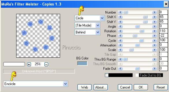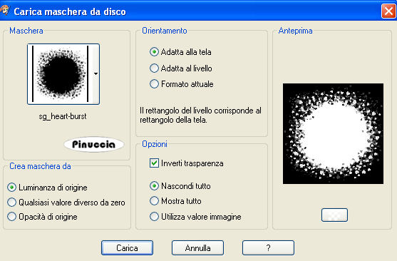 qui puoi trovare qualche risposta ai tuoi dubbi. Se l'argomento che ti interessa non è presente, ti prego di segnalarmelo. Questo tutorial è stato scritto con PSP X2, ma può essere eseguito anche con le altre versioni di PSP. Per tradurlo, l'ho eseguito con PSP X. Occorrente: Un tube a scelta. Il resto del materiale qui Il materiale scrap che ho usato è di SE e Karen W/Scrapkit - Fresh As A Daisy. Trovi i Termini d'uso nello zip. Metti la maschera sg_heart-burst.PspMask nella cartella Maschere. Apri una nuova immagine BIANCA 600 x 600 pixels. Livelli>Nuovo livello raster. Selezione>Seleziona tutto. Apri bluepaper.jpg, e vai a Modifica>Copia. Torna al tuo lavoro e vai a Modifica>Incolla nella selezione. Selezione>Deseleziona. Regola>Tonalità e Saturazione>Viraggio: ![]() Livelli>Carica/Salva maschera>Carica maschera da disco. Cerca e carica la maschera sg_heart-burst.PspMask. ![]() Effetti>Effetti di bordo>Aumenta. Livelli>Unisci>Unisci gruppo. Apri KW_prettydaisy2.png, e vai a Modifica>copia. Torna al tuo lavoro e vai a Modifica>Incolla come nuovo livello. Immagine>Ridimensiona, al 25%, tutti i livelli non selezionato. Regola>Messa a fuoco>Metti a fuoco. Effetti>Plugins>Mura's Meister - Copies: ![]() Effetti>Effetti 3D>Sfalsa ombra, con i seguenti settaggi, colore nero: ![]() Attiva il livello Gruppo Raster 1. Apri KW_ivy.png. Attiva lo strumento Selezione a mano libera , da punto a punto,Spianamento e sfumatura 0, e seleziona una parte del tube, come nell'esempio. ![]() Modifica>Copia. Torna al tuo lavoro e vai a Modifica>Incolla come nuovo livello. Effetti>Plugins>Mura's Meister - Copies, con i settaggi precedenti. Cambia la modalità di miscelatura di questo livello in Tonalità (esistente). Effetti>Effetti di bordo>Aumenta. Livelli>Duplica. Cambia la modalità di miscelatura di questo livello in Luce diffusa. Effetti>Effetti 3D>Sfalsa ombra, con i settaggi precedenti. Non unire i livelli! Attiva il livello Raster 1. Livelli>Nuovo livello raster. Questo passaggio non serve se stai usando PSP X2. perchè l'ornamento è standard nel programma. *** Apri Corel_10_026.PspTube. File>Esporta>Ornamento personalizzato. ![]() Nella finestra che si apre assegna un nome all'ornamento e clicca ok. ![]() *** Attiva lo strumento Ornamento ![]() cerca e seleziona l'ornamento che hai appena esportato, scala 15. se stai usando PSP X2 è l'ornamento Fiore2. Applica una margherita sopra ogni fiore. puoi applicare la margherita cliccando con il mouse per aggiungere l'ornamento, oppure puoi anche duplicare il livello e poi spostare la margherita a tuo piacimento.Attiva nuovamente il livello superiore. Apri KW_daisybow3.png, e vai a Modifica>Copia. Torna al tuo lavoro e vai a Modifica>Incolla come nuovo livello. Regola>Tonalità e saturazione>Viraggio, con i settaggi precedenti. Immagine>Ridimensiona, al 50%, tutti i livelli non selezionato. Livelli>Duplica. Livelli>Unisci>Unisci giù. Sposta il tube a sinistra.pos: x:148,00;y:68,00. Attivando lo strumento Puntatore ,nella barra superiore potrai impostare la posizione del tube. ![]() Effetti>Effetti 3D>Sfalsa ombra, con i settaggi precedenti. Livelli>Duplica. Sposta il fiocco in basso,vedi il mio esempio per controllare la posizione. Apri il tuo tube e vai a Modifica>Copia. non chiuderlo, perchè ti servirà ancora. Torna al tuo lavoro e vai a Modifica>Incolla come nuovo livello. Posiziona il tube come preferisci.Effetti>Effetti 3D>Sfalsa ombra, con i seguenti settaggi, colore nero: ![]() Apri KW-ribbonframe1.png, e vai a Modifica>Copia. Torna al tuo lavoro e vai a Modifica>Incolla come nuovo livello. Regola>Tonalità e Saturazione>Viraggio, con i settaggi precedenti Immagine>Ridimensiona, al 50%, tutti i livelli non selezionato. Sposta la cornice in una posizione comoda per lavorare,la sistemerai più tardi. Attiva lo strumento Bacchetta magica , sfumatura e tolleranza 0,![]() e clicca al centro della cornice per selezionarlo. Selezione>Modifica>Espandi - 5 pixels. Livelli>Nuovo livello raster. Riempi la selezione con il colore bianco.Selezione>Carica/Salva selezione>Salva selezione su canale alfa. Dai un nome alla selezione o lascia il nome di default. ![]() Selezione>Deseleziona. Livelli>Disponi>Sposta giù. Attiva nuovamente il tuo tube, e vai a Modifica>Copia. Torna al tuo lavoro. Attiva il livello Raster 7 e vai a Modifica>Incolla come nuovo livello. Immagine>Rifletti. Ridimensiona, se necessario, e spostalo sulla cornice,in modo che all'interno di questa rimanga il viso. ![]() Selezione>Carica/Salva selezione>Carica selezione da canale alfa. E' già presente la selezione che hai salvato prima, devi soltanto cliccare carica. ![]() Selezione>Inverti. Premi sulla tastiera il tasto CANC. Selezione>Deseleziona. Abbassa l'opacità di questo livello al 55%. Attiva il livello Raster 6. Livelli>Unisci>Unisci giù. Ripeti ancora una volta Livelli>Unisci>Unisci giù. Sposta la cornice in basso a sinistra.Immagine>Ruota per gradi - 15 gradi a sinistra. ![]() Regola>Messa a fuoco>Metti a fuoco. Livelli>Disponi>Sposta giù. Effetti>Effetti 3D>Sfalsa ombra, con i seguenti settaggi, colore nero. ![]() Attiva nuovamente il livello inferiore. Apri SE_doodleART_2.pspimage, e vai a Modifica>Copia. Torna al tuo lavoro e vai a Modifica>Incolla come nuovo livello. Immagine>Ridimensiona, al 60%, tutti i livelli non selezionato. Nella paletta dei livelli blocca la trasparenza del livello cliccando sull'icona del lucchetto. ![]() Imposta il colore di primo piano con il colore #127d07, e riempi il tube con questo colore.Sposta l'ornamento nell'angolo in alto a destra.![]() Livelli>Duplica. Immagine>Rifletti. Livelli>Unisci>Unisci giù. Livelli>Duplica. Immagine>Capovolgi. Se vuoi, aggiungi dei piccoli tubes come ornamento. Aggiungi il tuo nome e/o il tuo watermark e salva in formato jpg. Variante animata: ![]() ![]() Se hai problemi o dubbi, o trovi un link non funzionante, o anche soltanto per un saluto, scrivimi 20 Maggio 2008 |