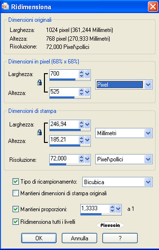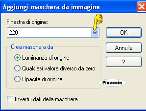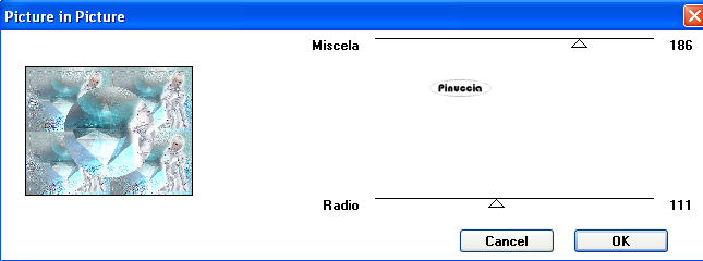 qui puoi trovare qualche risposta ai tuoi dubbi. Se l'argomento che ti interessa non è presente, ti prego di segnalarmelo. Questo tutorial è stato scritto con PSP X2, ma può essere eseguito anche con le altre versioni di PSP. Per tradurlo, l'ho eseguito con PSP X. Occorrente: Materiale qui I tubes che ho usato sono di Marif e Native Nancy. Rispetta il lavoro degli autori e mantieni inalterati i tubes. Filtri: Graphics Plus qui Italian Editors qui Apri la maschera e minimizzala nella tua area di lavoro. La troverai nella lista delle maschere quando ti servirà. Apri il motivo mustersilver e minimizzalo nella tua area di lavoro. Lo troverai nella lista dei motivi disponibili quando ti servirà. Apri diamond-1024.jpg. Duplica l'immagine usando la combinazione di tasti shift(maiuscola)+D, e chiudi l'originale. La copia sarà la base del tuo lavoro. Immagine>Ridimensiona - 700 x 525 pixels. ![]() Regola>Messa a fuoco>Metti a fuoco. Duplica questa immagine (shift+D) e mettila da parte: ti servirà più tardi per la cornice del tuo lavoro. Modifica>Copia. Modifica>Incolla come nuovo livello. Attiva il livello di sfondo. Regola>Sfocatura>Sfocatura gaussiana, raggio 15. ![]() Effetti>Effetti di trama>Mosaico antico: ![]() Effetti>Effetti di bordo>Aumenta. Attiva il livello superiore. Livelli>Nuovo livello maschera>Da immagine. ![]() Apri il menu sotto la finestra di origine e seleziona la maschera 220.jpg. ![]() Apri Marif_2006_septembre_misted_paysage091.psp, e vai a Modifica>Copia. Torna al tuo lavoro e vai a Modifica>Incolla come nuovo livello. Sposta il tube in alto.Pos: x:-58,00 y:-30,00. attivando lo strumento Puntatore , potrai regolare la posizione sulla barra superiore degli strumenti.![]() Abbassa l'opacità di questo livello al 70%. Apri NN Spacecuffs Mei 08 90%1.psp, e vai a Modifica>Copia. Torna al tuo lavoro e vai a Modifica>Incolla come nuovo livello. Immagine>Ridimensiona, al 75%, tutti i livelli non selezionato. Sposta il tube a destra, contro il bordo.Effetti>Effetti 3D>Sfalsa ombra, con i seguenti settaggi, colore bianco. ![]() Ripeti l'Effetto Sfalsa ombra, ma cambiando verticale e orizzontale con -10. Livelli>Unisci>Unisci tutto. Immagine>Aggiungi bordatura, 1 pixel, simmetriche, con il colore bianco. Selezione>Inverti. Imposta il colore di primo piano su Motivi e seleziona il motivo argento Muster-silber. ![]() Riempi il bordo con questo motivo.Selezione>Seleziona tutto. Immagine>Aggiungi bordatura, 30 pixels, simmetriche, con il colore bianco. Selezione>inverti. Attiva la copia dell'immagine che hai messo da parte prima e vai a Modifica>Copia. Torna al tuo lavoro e vai a Modifica>Incolla nella selezione. Regola>Sfocatura>Sfocatura gaussiana, raggio 15. Effetti>Effetti di trama>Mosaico antico, con i settaggi precedenti. Effetti>Plugins>Italian Editor - Picture in Picture, con i settaggi standard. ![]() Effetti>Effetti di bordo>Aumenta. Selezione>Inverti. Effetti>Effetti 3D>Sfalsa ombra, con i seguenti settaggi, colore nero. ![]() Ripeti l'Effetto Sfalsa ombra, ma cambiando verticale e orizzontale con -1. Selezione>Seleziona tutto. Immagine>Aggiungi bordtura, 1 pixel, simmetriche, con il colore bianco. Selezione>Inverti. Riempi la selezione con il motivo argento.Selezione>Deseleziona. Effetti>Effetti 3D>Sfalsa ombra, con i seguenti settaggi, colore nero. ![]() Ripeti l'Effetto Sfalsa ombra ma cambiando verticale e orizzontale con -1. Attiva lo strumento Testo e scegli un font.Nel mio esempio ho usato il font Andes, con i seguenti settaggi. ![]() ![]() Imposta il colore di primo piano con #5f99a3, e il colore di sfondo con #94dfe9. Scrivi il tuo testo. Oggetti>Allinea>Centra vert. nella tela. Usa il nodo centrale per allargare il testo: Sposta il testo a sinistra.Livelli>Converti in livello raster. Effetti>Plugins>Graphics Plus - Cross Shadow, con i seguenti settaggi, 2 volte: ![]() Effetti>Effetti 3D>Sfalsa ombra, con i seguenti settaggi, colore nero. ![]() Aggiungi il tuo nome e/o il tuo watermark. Livelli>Unisci>Unisci tutto e salva in formato jpg. ![]() Se hai problemi o dubbi, o trovi un link non funzionante, o anche soltanto per un saluto, scrivimi 7 Giugno 2008 |