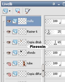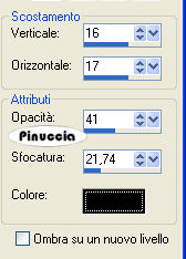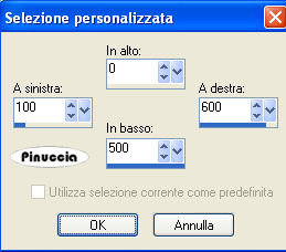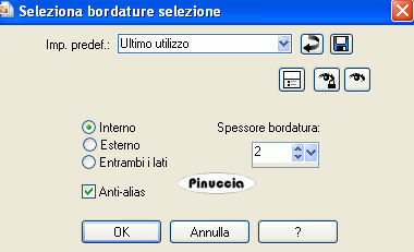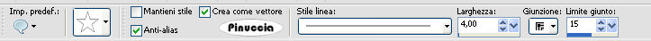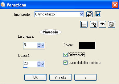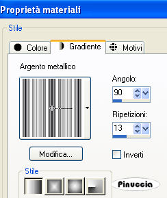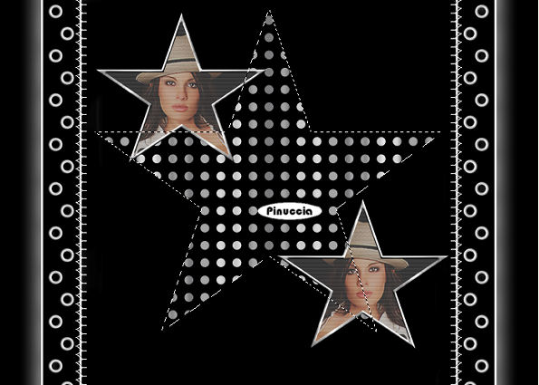 qui puoi trovare qualche risposta ai tuoi dubbi. Se l'argomento che ti interessa non è presente, ti prego di segnalarmelo. Questo tutorial è stato scritto con PSP X2, ma può essere eseguito anche con le altre versioni di PSP. Per tradurlo, l'ho eseguito con PSP X. il titolo prende il nome dall'immagine usata dall'autrice, per utilizzare la quale occorre acquistare una licenza. Occorrente: Un tube a scelta. Il resto del materiale qui Il materiale scrap è di Melissa/Sh&SH. Leggi le sue condizioni d'uso nel file che trovi nello zip. I tubes che ho usato per i miei esempi sono di Terry e Angie. Se vuoi creare l'animazione, ti servirà anche Animation Shop qui Apri una nuova immagine trasparente 700 x 500 pixels. Passa il colore di primo piano a Gradiente e seleziona il gradiente Argento metallico, con i seguenti settaggi: ![]() Regola>Sfocatura>Sfocatura gaussiana, raggio 3. ![]() Livelli>Nuovo livello raster. Riempi il livello con il colore nero.Apri SH_theEssentials_paper12_08.jpg, e minimizzala nella tua area di lavoro. Livelli>Nuovo livello maschera>Da immagine: apri il menu sotto Finestra di origine e cerca, tra i file aperti, l'immagine di sfondo. ![]() Seleziona il file con i seguenti settaggi: ![]() Livelli>Unisci>Unisci gruppo. Livelli>Nuovo livello raster. Attiva lo strumento Selezione , rettangolo,clicca su Selezione personalizzata ![]() e imposta i seguenti settaggi: ![]() Selezione>Inverti. Riempi con il colore nero.Selezione>Deseleziona. Attiva il livello Gruppo Raster 2. Immagine>Ridimensiona, con i seguenti settaggi, mantieni proporzioni e tutti i livelli non selezionato: ![]() Sposta questo livello al centro tra le due strisce nere.Apri lo scrapkit HS_ScrapKit_023.pspimage. Attiva il livello Ribbon e vai a Modifica>copia. Torna al tuo lavoro. Attiva il livello superiore e vai a Modifica>Incolla come nuovo livello. Immagine>Ruota per gradi - 90 gradi a sinistra, tutti i livelli non selezionato. ![]() Sposta il nastro a destra.Livelli>Duplica. Immagine>Rifletti. Livelli>Unisci>Unisci giù. Selezione>Seleziona tutto. Selezione>Mobile. Selezione>Immobilizza. Livelli>Nuovo livello raster. Effetti>Effetti 3D>Sfalsa ombra, con i seguenti settaggi, colore bianco. ![]() Ripeti l'Effetto Sfalsa ombra, ma cambiando verticale e orizzontale con -10. Selezione>Deseleziona. Rimani su questo livello. Attiva lo strumento gomma ![]() e cancella prudentemente le tracce dell'ombra interne, in modo che l'ombra sembri venire dal bordo bianco dei nastro. Vedi il mio esempio. ![]() Attiva nuovamente lo scrapkit. Attiva il livello Stitches, e vai a Modifica>Copia. Torna al tuo lavoro e vai a Modifica>Incolla come nuovo livello. Dovrai usare soltanto la cucitura in alto e non quella a destra (perchè questa è troppo corta). Seleziona quindi la striscia a destra.per vedere meglio la cucitura nascondi gli altri livelli: Livelli>Visualizza>Solo corrente. ![]() Premi sulla tastiera il tasto CANC ![]() Selezione>Deseleziona. Immagine>Ruota per gradi - 90 gradi a sinistra. ![]() Livelli>visualizza>Tutto. Sposta la cucitura a sinistra.![]() Livelli>Duplica. Immagine>Rifletti. Passa il colore di primo piano a Motivi, e seleziona il motivo Muster silber. ![]() Chiudi il colore di sfondo. Attiva lo strumento Forme predefinite , Stella 2:![]() con i seguenti settaggi: ![]() Traccia una stella sull'immagine. Livelli>Converti in livello raster. Rinomina questo livello "Stella". Attiva lo strumento Bacchetta magica ![]() ![]() e clicca all'interno della stella per selezionarlo. Selezione>Modifica>Espandi, 2 pixels. Livelli>Nuovo livello raster. Riempi con il nero.Selezione>Deseleziona. Rinomina questo livello "Sfondo". Livelli>Disponi>Sposta giù. ![]() Apri il tuo tube e vai a Modifica>Copia. Torna al tuo lavoro e vai a Modifica>Incolla come nuovo livello. Se necessario, ridimensionalo (Immagine>Ridimensiona...). Posiziona il tube come preferisci.Rinomina questo livello "Tube". Livelli>Duplica. Livelli>Disponi>Sposta giù, e ripeti. Il livello si trova così sotto la cornice argento della stella. ![]() Sposta il tube sotto la stella,in modo che rimanga all'interno un ritaglio adeguato del viso. ![]() Quando è tutto a posto, attiva il livello Stella. Seleziona l'interno con la bacchetta magica ![]() Selezione>Modifica>Espandi - 2 pixels. Selezione>inverti. Attiva il livello della copia del tube e premi sulla tastiera il tasto CANC. Selezione>Inverti. Livelli>Nuovo livello raster. Riempi la selezione con il colore bianco.Selezione>Deseleziona. Effetti>Effetti di trama>Veneziana: ![]() Effetti>Effetti di bordo>Aumenta. Abbassa l'opacità di questo livello al 25%. Attiva il livello Copia di tube. Abbassa l'opacità di questo livello al 65%. Attiva il livello Stella. Effetti>Effetti 3D>Smusso a incasso. ![]() Ripeti l'effetto ancora una volta. Lascia visibili i livelli collegati alla stella e vai a Livelli>Unisci>Unisci visibile. Così avrai l'intera stella in un unico livello. ![]() Livelli>Duplica. Immagine>Rifletti. Sposta le due immagini come preferisci.(eventualmente, potrai sistemarle ancora più tardi). Chiudi il livello del tube (ti serve per vedere meglio quello che farai). Attiva il livello Gruppo Raster 2. Livelli>Nuovo livello raster. Attiva lo strumento Selezione personalizzata , con i settaggi precedenti.Riempi la selezione con il nero.Selezione>Deseleziona. Attiva nuovamente lo strumento Forme predefinite , larghezza 0.Chiudi il colore di primo piano e imposta il colore di sfondo con il bianco. Traccia una stella sulla sezione nera al centro. Spostala un po' più in alto, lasciando un piccolo spazio in basso, come nell'esempio. ![]() Livelli>Converti in livello raster. Seleziona la stella con la bacchetta magica ![]() Posizionati sul livello sottostante e premi sulla tastiera il tasto CANC. Elimina il livello della stella e avrai questo: ![]() Livelli>Nuovo livello raster. Riempi la selezione con il Motivo Muster Silber.Selezione>Modifica>Contrai, di 3 pixels. Premi sulla tastiera il tasto CANC. S