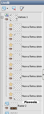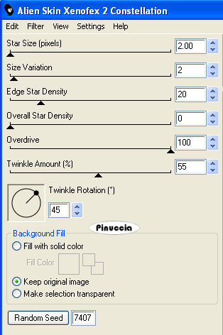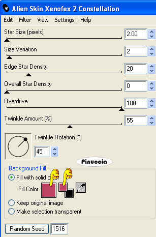 qui puoi trovare qualche risposta ai tuoi dubbi. Se l'argomento che ti interessa non è presente, ti prego di segnalarmelo. Questo tutorial è stato scritto con PSP X2, ma può essere eseguito anche con le altre versioni di PSP. Per tradurlo, ho usato PSP X. ©Biene - tutti i diritti riservati. Il © della traduzione è mio. Occorrente: Un tube a scelta e 5 tube di visi (che puoi anche ricavare da tubes a figura intera). Il resto del materiale (un pennello) qui Per i miei esempi ho usato tubes di Jo Ho usato il template Yvette_EOC_Template64.pspimage di Yvette, che puoi trovare http://essenceofcreativity.wordpress.com/ qui Un ringraziamento ai creatori di tubes dei vari gruppi cui appartengo. Il watermark di ognuno è inserito nei tubes. Per favore, rispetta il lavoro degli autori: non cambiare il nome del file e non rimuovere il watermark. Il © appartiene agli artisti originali. Filtri: Alien Skin Xenofex - Constellation qui Ti servirà anche Animation Shop qui ![]() Metti il pennello sterren.pspBrush nella cartella Pennelli. Attenzione il pennello è composto da due files che non devono essere separati. Vedi gli appunti sui pennelli qui Scegli un colore abbinato al tuo tube e impostalo come colore di primo piano (il mio #bf4464), Imposta il colore di sfondo con il bianco o con il nero. Apri il template. Duplicalo usando sulla tastiera la combinazione di tasti maiuscola+D, e chiudi l'originale. Elimina il livello del copyright. Attiva il livello di sfondo. Immagine>Dimensione tela, 607 x 550 pixels. ![]() Livelli>Nuovo livello raster. Attiva lo strumento Pennello ![]() cerca e seleziona il pennello Sterren, e applicalo sullo sfondo cliccando più volte - casualmente - con il tasto sinistro del mouse per usare il colore di primo piano. Attiva il livello "big rectangle". Clicca con la bacchetta magica , sfumatura e tolleranza 0,sulla parte grigia per selezionarla. Riempi la selezione con il colore di primo piano.Selezione>Deseleziona. Effetti>Effetti 3D>sfalsa ombra, con i seguenti settaggi, colore nero. ![]() Attiva il livello "small rettangle". Seleziona la parte scura con la bacchetta magica , sfumatura e tolleranza 0.Riempi la selezione con il colore di sfondo.Apri il tube del viso e vai a Modifica>Copia. Torna al tuo lavoro e vai a Modifica>incolla nella selezione. Selezione>Deseleziona. Abbassa l'opacità di questo livello al 35%. Attiva il livello "dotted rectangle". Rinomina questo livello "Bling". Livelli>Duplica - 2 volte. Attiva il livello "Bling". Effetti>Plugins>Alien Skin Xenofex - Constellation, con il colore di primo piano: per impostare il colore di primo piano clicca sulla palettina corrispondente ![]() Attiva il livello della prima copia di Bling. Ripeti l'Effetto Constellation cliccando una volta su Random Seed. Chiudi il livello. Attiva il livello della seconda copia di Bling. Ripeti l'Effetto Constellation, cliccando una volta su Random Seed. Chiudi questo livello. Adesso è il momento del testo. Il template ha due livelli-testo: wordart1 e wordart2. Decidi tu cosa intendi fare, se usare uno o tutti e due i livelli o scrivere un testo o due testi a tua scelta. Elimina i livelli wordart che non ti interessano. Per scrivere il tuo testo: Chiudi il colore di primo piano e lascia il nero come colore di sfondo. Attiva lo strumento Testo e scegli un font.Per il mio esempio ho usato il font Hamburger Sandwich dimensione 36, crenatura -75. ![]() ![]() Scrivi il testo e posizionalo. Livelli>Converti in livello raster. Rinomina questo livello "Testo". Effetti>Effetti 3D>sfalsa ombra, con i seguenti settaggi, colore nero. ![]() Livelli>Duplica - 2 volte. Attiva il livello "Testo". Effetti>Plugins>Alien Skin Xenofex - Constellation: ![]() Attiva il livello della prima copia di Testo. Ripeti l'Effetto Constellation, cliccando una volta su Random Seed. Chiudi questo livello. Attiva il livello della seconda copia di Testo. Ripeti l'Effetto Constellation, cliccando una volta su Random Seed. Chiudi questo livello. Attiva il livello "backgrounds". Seleziona con la bacchetta magica ![]() ![]() le quattro parti grigie. Selezione>Modifica>Contrai - 1 pixels. Livelli>Nuovo livello raster. Colore di primo piano ancora impostato con #bf4464, e colore di sfondo con il nero. Passa il colore di primo piano a Gradiente, con i seguenti settaggi. ![]() Riempi la selezione con il gradiente.Selezione>Deseleziona. Puoi eliminare il livello "backgrounds". ![]() Apri il tube del primo viso. Se necessario, seleziona la parte che vuoi inserire e vai a Modifica>Copia.Torna al tuo lavoro e vai a Modifica>Incolla come nuovo livello. Posiziona correttamente il tube nell'area della prima cornice a sinistra.Attiva il livello superiore (il livello delle cornici). Clicca con la bacchetta magica nella prima cornice per selezionarla.Selezione>Inverti. Attiva il livello sottostante (il livello del tube) e premi sulla tastiera il tasto CANC ![]() Selezione>Deseleziona. Ripeti questo passaggio per le altre tre cornici. Non dimenticare di posizionarti sul livello delle cornici per selezionare con la bacchetta magica, e sul livello del tube prima di usare il tasto CANC. Quando hai finito, attiva il livello superiore. Livelli>Unisci>Unisci giù e ripeti finchè non avrai il livello delle cornici e dei quattro tube in un unico livello. ![]() Sposta poi questo livello un po' più in basso, pressappoco come nel mio esempio.Effetti>Effetti 3D>sfalsa ombra, con i seguenti settaggi, colore nero. ![]() Ripeti l'Effetto Sfalsa ombra, cambiando verticale e orizzontale con -1. Attiva lo strumento Forma simmetrica ![]() e seleziona la stella: ![]() Disegna a caso delle stelle in varie dimensioni, vedi per il mio esempio per orientarti. Quando hai finito, apri il livello vettore e vedrai le stelle che hai disegnato in un proprio livello. ![]() Se devi apportare delle varianti, per esempio uno spostamento, attiva il livello corrispondente e sposta la stella. Quando è tutto a posto, attiva il livello vettore e vai a Livelli>Conver