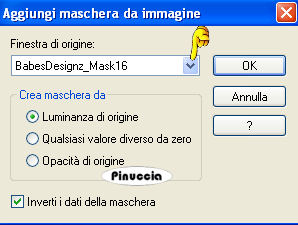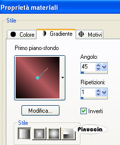 qui puoi trovare qualche risposta ai tuoi dubbi. Se l'argomento che ti interessa non è presente, ti prego di segnalarmelo. Questo tutorial è stato scritto con PSP X2, ma può essere eseguito anche con le altre versioni di PSP. Per tradurlo, ho usato PSP X. ©Biene - tutti i diritti riservati. Il © della traduzione è mio. Occorrente: A scelta il tube di una donna. per il mio esempio ho usato un poser http://posertuben.kreahexe.de/index.htm" ©Kreahexe Il Template10 di Barbie che puoi trovare http://barbislostandfound.blogspot.com/2009/10/hi-guys-i-have-4-more.html qui, sotto 27.oktober 2009. La maschera BabeDesignz_Mask16.jpg di Babes Designz che puoi trovare http://babesdesignz.blogspot.com/ qui, in uno zip sotto 31 Marz 2009. Il resto del materiale qui Un ringraziamento ai creatori di tubes dei vari gruppi cui appartengo. Il watermark di ognuno è inserito nei tubes. Per favore, rispetta il lavoro degli autori: non cambiare il nome del file e non rimuovere il watermark. Il © appartiene agli artisti originali. ![]() Metti il motivo 006_verloop7a-ca.jpg nella cartella Motivi. Apri il resto del materiale, compresa la maschera, in PSP. Scegli dal tuo tube un bel colore contrastante e impostalo come colore di primo piano. Per il mio esempio ho usato il colore #b65b5f. Imposta il colore di sfondo con il bianco. Apri il template. Duplicalo usando la combinazione di tasti maiuscola+D e chiudi l'originale. La copia sarà la base del tuo lavoro. Elimina il livello Raster 6. Questo template ha un piccolo errore: ci sono due livelli "copy of Raster 3". Rinomina il secondo di questi livelli "Copia 3 di Raster 3". ![]() Immagine>Ridimensiona, all'85%, tutti i livelli selezionato. Attiva il livello Raster 4. Livelli>Nuovo livello raster. Livelli>Disponi>Sposta giù. Immagine>Dimensione tela: ![]() Riempi con il colore bianco (tasto destro del mouse).Livelli>Nuovo livello raster. Imposta il colore di sfondo con il colore nero. Passa il colore di primo piano a Gradiente con i seguenti settaggi. ![]() Riempi il nuovo livello con il gradiente.Livelli>Nuovo livello maschera>Da immagine. Apri il menu sotto la finestra di origine e vedrai la lista dei files aperti. Tra questi la maschera. Seleziona la maschera BabesDesignz_Mask16 con i seguenti settaggi: ![]() Livelli>Unisci>Unisci gruppo. Rinomina questo livello "maschera". Attiva il livello Raster 4. Apri background_goodgirl_biene.pspimage e vai a Modifica>Copia. Torna al tuo lavoro e vai a Modifica>Incolla come nuovo livello. Rinomina questo livello "sfondo". Regola>Tonalità e saturazione>Viraggio, con i valori corrispondenti al tuo colore di primo piano. I miei: ![]() Abbassa l'opacità di questo livello al 64%. Apri il tuo tube (oppure, se lo hai, l'immagine ingrandita del suo viso). Modifica>copia. Torna al tuo lavoro e vai a Modifica>Incolla come nuovo livello. Posiziona correttamente il viso nell'area del cerchio.Attiva il livello sottostante. Selezione>Seleziona tutto. Selezione>Mobile. Selezione>Immobilizza. Selezione>Inverti. Attiva nuovamente il livello del tube. Premi sulla tastiera il tasto CANC. Selezione>Deseleziona. Cambia la modalità di miscelatura di questo livello in Luminanza (esistente), e abbassa l'opacità al 41%. Attiva nuovamente il livello "sfondo". Effetti>Effetti 3D>Sfalsa ombra, con il colore nero. ![]() Ripeti l'Effetto Sfalsa ombra, cambiando verticale e orizzontale con -2. Attiva il livello Raster 5. Regola>Aggiungi/Rimuovi disturbo>Aggiungi disturbo: ![]() Effetti>Effetti di bordo>Aumenta - 2 volte. Poichè il cerchio ha un piccolo errore: Immagine>Capovolgi. Effetti>Effetti 3D>Sfalsa ombra, con il colore nero. ![]() Attiva lo strumento Selezione , rettangolo,e traccia una selezione come nell'esempio. ![]() Livelli>Nuovo livello raster. Riempi la selezione con il colore nero (tasto destro del mouse).Selezione>Deseleziona. Attiva nuovamente il tuo tube e seleziona una parte che ti servirà per il primo fotogramma della striscia.Modifica>Copia. Torna al tuo lavoro e vai a Modifica>Incolla come nuovo livello. Posiziona il ritaglio nel riquadro del primo fotogramma.Attiva il livello Raster 2. Clicca al centro del primo fotogramma a sinistra con la bacchetta magica , sfumatura e tolleranza 0.Selezione>Modifica>Espandi - 2 pixels. Selezione>Inverti. Attiva il livello del tube e premi sulla tastiera il tasto CANC. Selezione>Deseleziona. Abbassa l'opacità di questo livello al 50%. Ripeti questo passaggio per gli altri tre fotogrammi della striscia. Quando hai finito, attiva il livello superiore dei quattro ritagli. Livelli>Unisci>Unisci giù e ripeti finchè non avrai i quattro ritagli in un unico livello. Cambia la modalità di miscelatura di questo livello in Luminanza. Livelli>Duplica. Regola>Sfocatura>Sfocatura gaussiana - raggio 3. ![]() Cambia la modalità di miscelatura di questo livello livello in Luce diffusa, e abbassa l'opacità all'85%. Attiva il livello Raster 2. Selezione>Seleziona tutto. Selezione>Mobile. Selezione>Immobilizza. Livelli>Nuovo livello raster. Riempi il livello con il gradiente.![]() Mantieni selezionato. Livelli>Duplica. Effetti>Effetti di trama>Arenaria, con il colore #a0b9fb. ![]() Selezione>Deseleziona. Effetti>Effetti di bordo>Aumenta. Abbassa l'opacità di questo livello al 77%. Livelli>Unisci>Unisci giù. Effetti>Effetti 3D>Sfalsa ombra, con il colore nero. ![]() Ripeti l'Effetto Sfalsa ombra, cambiando verticale e orizzontale con -2. Adesso puoi eliminare il livello Raster 2. Chiudi tutti i livelli tranne questi ultimi quattro. ![]() Livelli>Unisci>Unisci visibile. Effetti>Effetti 3D>sfalsa ombra, con il colore nero. ![]() Livelli>Visualizza>Tutto. Attiva il livello Raster 3. ***** Selezione>Seleziona tutto. Selezione>Mobile. Selezione>Immobilizza. Livelli>Nuovo livello raster. Riempi la selezione con il gradiente.Livelli>Nuovo livello raster. Passa il colore di sfondo a Motivi e seleziona il motivo 006_verloop7a-ca. ![]() Riempi il livello con questo motivo.Selezione>Deseleziona. Effetti