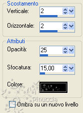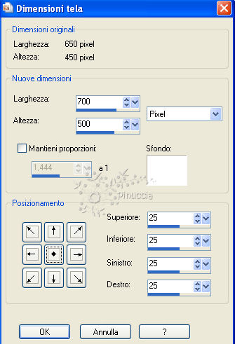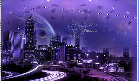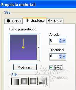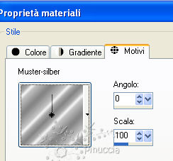 qui puoi trovare qualche risposta ai tuoi dubbi. Se l'argomento che ti interessa non è presente, ti prego di segnalarmelo. Questo tutorial è stato scritto con PSP X2, ma può essere eseguito anche con le altre versioni di PSP. Per tradurlo, ho usato PSP X. ©Biene - tutti i diritti riservati. Il © della traduzione è mio. Occorrente: A scelta il tube di una donna. Il resto del materiale qui per il mio esempio ho usato un tube di Margit Gli altri tubes sono di Farouche e Colombe. L'angolo, la luna e l'immagine di sfondo sono ©Biene. Un ringraziamento ai creatori di tubes dei vari gruppi cui appartengo. Il watermark di ognuno è inserito nei tubes. Per favore, rispetta il lavoro degli autori: non cambiare il nome del file e non rimuovere il watermark. Il © appartiene agli artisti originali. Filtri: Simple - 4 Way Average qui Metti la maschera 20-20 nella cartella Maschere. Metti il motivo Muster-silber nella cartella Motivi. Imposta il colore di primo piano con #4f547c, e il colore di sfondo con #6f5bbe. Passa il colore di primo piano a Gradiente. ![]() Apri una nuova immagine trasparente 650 x 450 pixels, e riempila con il gradiente.Livelli>Nuovo livello raster. Selezione>Seleziona tutto. Apri background_gwen_biene.jpg e vai a Modifica>Copia. Torna al tuo lavoro e vai a Modifica>Incolla nella selezione. Selezione>Deseleziona. Apri calguismists28791.psp e vai a Modifica>Copia. Torna al tuo lavoro e vai a Modifica>Incolla come nuovo livello. Immagine>Ridimensiona, all'85%, tutti i livelli non selezionato. Sposta il tube in basso, con il tramonto contro il bordo inferiore.![]() Apri Atlanta.psp e vai a Modifica>Copia. Torna al tuo lavoro e vai a Modifica>Incolla come nuovo livello. Immagine>Ridimensiona, al 112%, tutti i livell non selezionato. Cambia la modalità di miscelatura di questo livello in Luminanza (esistente). Sposta il tube tutto in basso sul bordo, e un po' più a sinistra.![]() Attiva lo strumento Selezione a mano libera , da punto a punto,e traccia una selezione come nell'esempio. ![]() Modifica>Copia. Livelli>Nuovo livello raster. Modifica>Incolla nella selezione. Selezione>Deseleziona. Cambia la modalità di miscelatura di questo livello in Luminanza (esistente). Posizionati sul livello Raster 3. ![]() Attiva lo strumento Aerografo , dimensione 80, opacità 5,imposta il colore di primo piano con il nero. Clicca nell'angolo in basso a destra dello sfondo con questo colore. ![]() Attiva nuovamente il livello superiore. Apri mond_biene.pspimage e vai a Modifica>copia. Torna al tuo lavoro e vai a Modifica>Incolla come nuovo livello. Immagine>Ridimensiona, al 120%, tutti i livelli non selezionato. Cambia la modalità di miscelatura di questo livello in Luminanza (Esistente). Livelli>Carica/Salva maschera>Carica maschera da disco. Cerca e carica la maschera 20-20. ![]() Livelli>Unisci>Unisci gruppo. Sposta la luna in alto a destra.![]() Apri il tuo tube e vai a Modifica>Copia. Torna al tuo lavoro e vai a Modifica>Incolla come nuovo livello. Immagine>Ridimensiona, se e quanto necessario. Sposta il tube in basso e un po' più a destra.Livelli>Duplica. Livelli>Disponi>Sposta giù. Effetti>Effetti di distorsione>Vento - da destra - intensità 80. ![]() Regola>Sfocatura>Sfocatura gaussiana - raggio 10. ![]() Abbassa l'opacità di questo livello al 70%. Livelli>Unisci>Unisci tutto. Duplica l'immagine usando la combinazione di tasti maiuscola+D e minimizza questa copia. Continua sull'originale: Selezione>Seleziona tutto. Livelli>nuovo livello raster. Passa il colore di primo piano a Motivi e seleziona il motivo argento. ![]() Riempi il livello con il motivo argento.Selezione>Modifica>Contrai - 1 pixel. Premi sulla tastiera il tasto CANC. Selezione>Deseleziona. Cambia la modalità di miscelatura di questo livello in Luminanza. Livelli>Unisci>Unisci tutto. Livelli>Duplica. Attiva il livello inferiore. Immagine>Dimensione tela - 700 x 500 pixels. ![]() Selezione>Seleziona tutto. Attiva la copia del lavoro che hai messo da parte prima e vai a Modifica>Copia. Torna al tuo lavoro e vai a Modifica>Incolla nella selezione. Selezione>Deseleziona. Effetti>Plugins>Simple - 4 Way Average. Attiva nuovamente il tube canguismists28791.psp e vai a Modifica>copia. Torna al tuo lavoro e vai a Modifica>Incolla come nuovo livello. Immagine>Ridimensiona, al 110%, tutti i livelli non selezionato. Sposta il tube contro il bordo, in modo che il tramonto sia visibile.![]() Cambia la modalità di miscelatura di questo livello in Indebolisci, e abbassa l'opacità al 40%. Livelli>Duplica. Immagine>Rifletti. Attiva nuovamente il livello superiore. Effetti>Effetti 3D>Sfalsa ombra, con il colore nero. ![]() Ripeti l'Effetto Sfalsa ombra, cambiando verticale e orizzontale con -2. Livelli>Unisci>Unisci tutto. Selezione>Seleziona tutto. Livelli>Nuovo livello raster. Riempi con il motivo argento.Selezione>modifica>Contrai - 1 pixel. Premi sulla tastiera il tasto CANC. Selezione>Deseleziona. Cambia la modalità di miscelatura in Luminanza. Apri corner_gwen_biene.pspimage, attiva il livello corner_oben, e vai a Modifica>Copia. Torna al tuo lavoro e vai a Modifica>Incolla come nuovo livello. Spostalo nell'angolo in alto a sinistra.Effetti>Effetti 3D>sfalsa ombra, con il colore nero. ![]() Livelli>Duplica. Immagine>Rifletti. Livelli>Unisci>Unisci giù. Attiva nuovamente corner_gwen_biene.pspimage e posizionati sul livello corner_unten. Modifica>Copia. Torna al tuo lavoro e vai a Modifica>Incolla come nuovo livello. Spostalo nell'angolo in basso a sinsitra.Effetti>Effetti 3D>Sfalsa ombra, con il colore nero. ![]() Livelli>Duplica. Immagine>Rifletti. Livelli>Unisci>Unisci giù. Aggiungi il tuo nome e/o il tuo watermark, senza dimenticare eventuali copyright delle immagini usate,. Livelli>Unisci>Unisci tutto e salva in formato jpg. Se hai problemi o dubbi, o trovi un link non funzionante, o anche soltanto per un saluto, scrivimi.