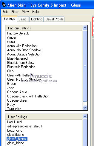 Metti il preset glass5_biene.f1s nella cartella del filtro: Alien Skin Eye Candy 5 Impact>Settings>Glass. Se preferisci puoi importarlo, quando ti servirà, dalla cartella in cui hai scompattato il materiale.